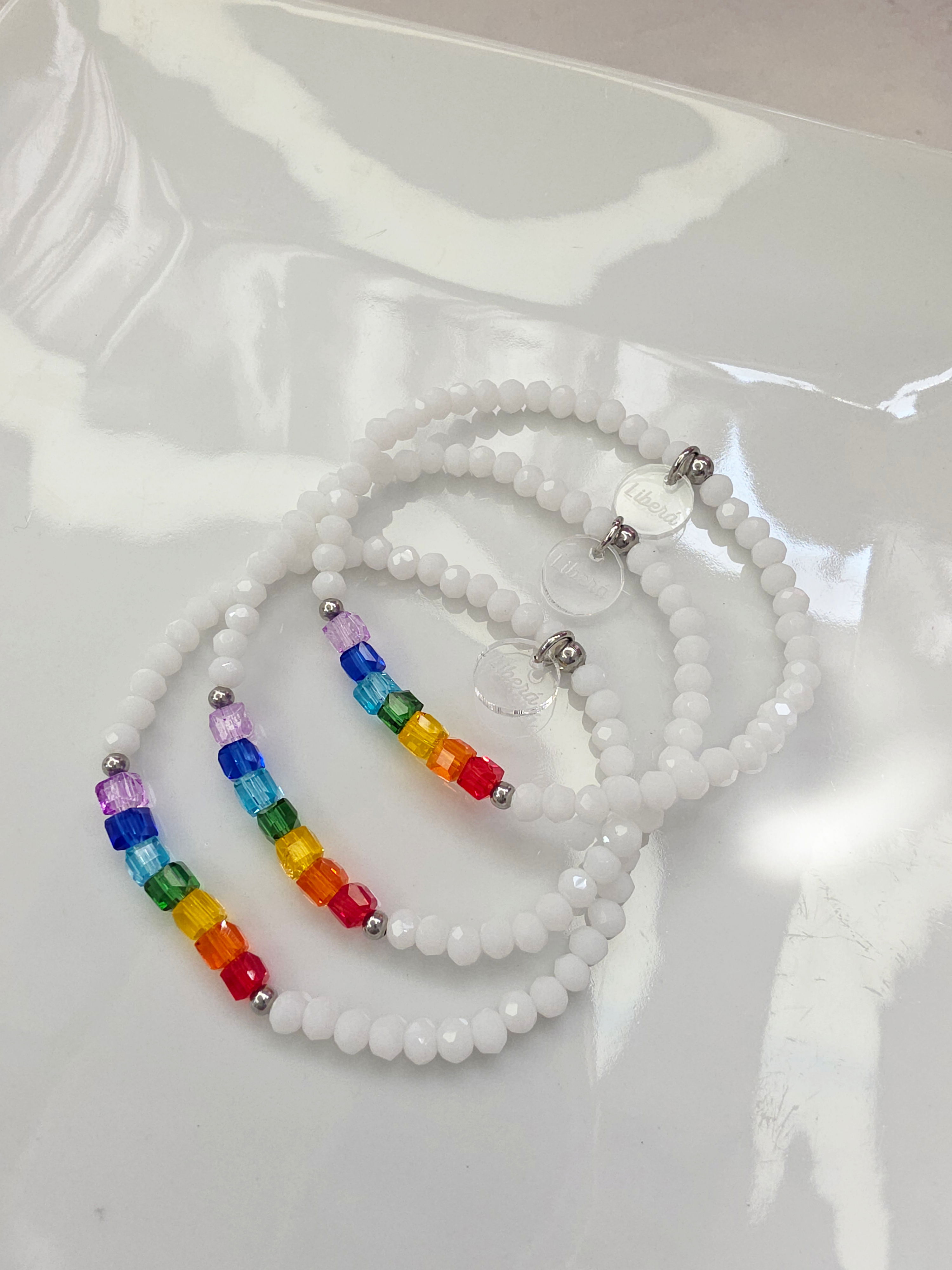 Pulsera elástica compuesta por Cristales dona y cubos de Cristal con los colores de los chakras. Detalles y terminación de Acero Quirúrgico. Apta agua e Hipoalergénica.