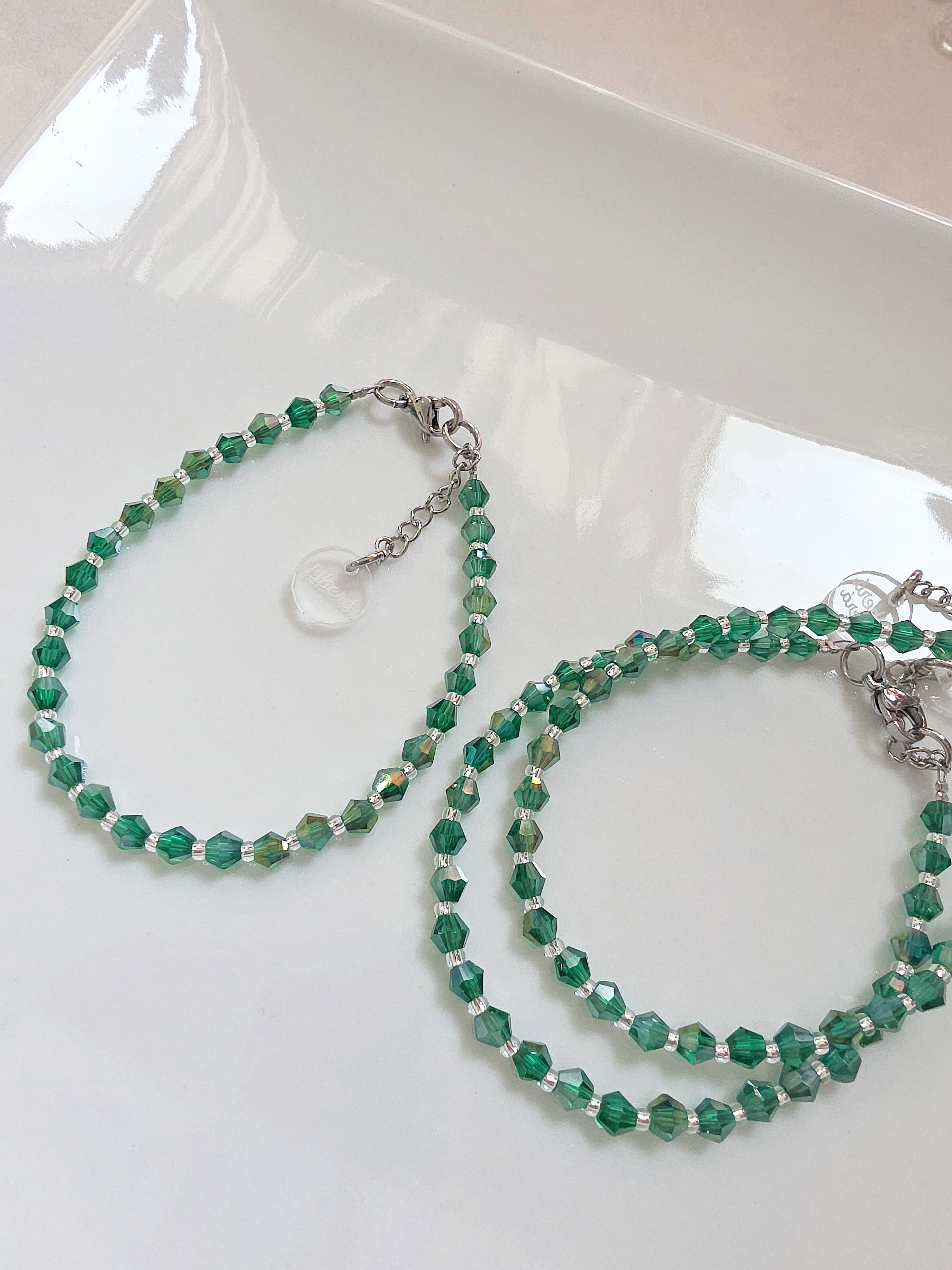 Pulsera compuesta por cristales intercalados con Mostacillas Checas calibradas marca Preciosa, cierre y cadena de alargue de Acero Quirúrgico 316l.