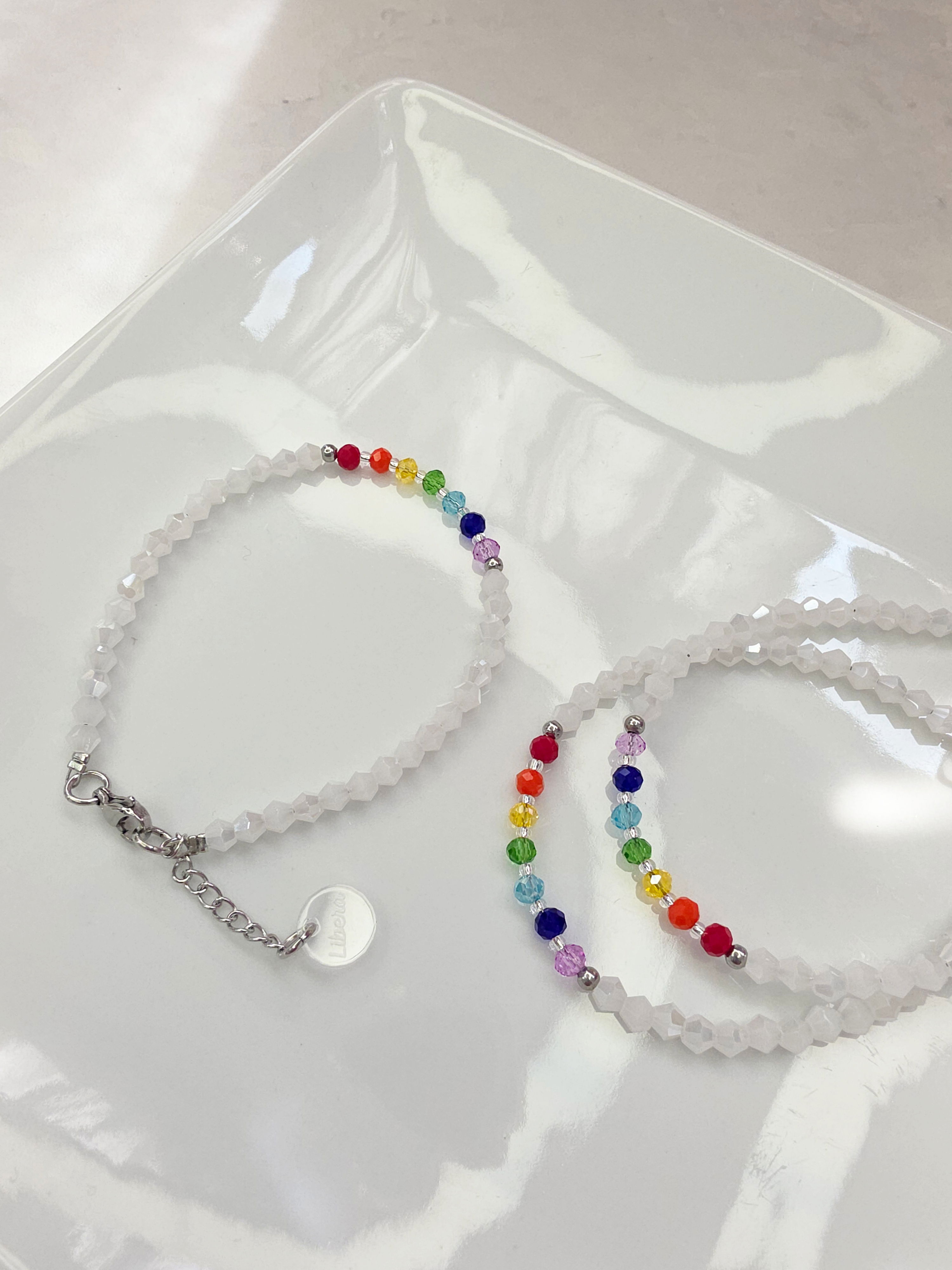Pulsera compuesta por cristales. Detalles, cierre y cadena de alargue de Acero Quirúrgico 316l. Apta agua e Hipoalergénica.