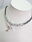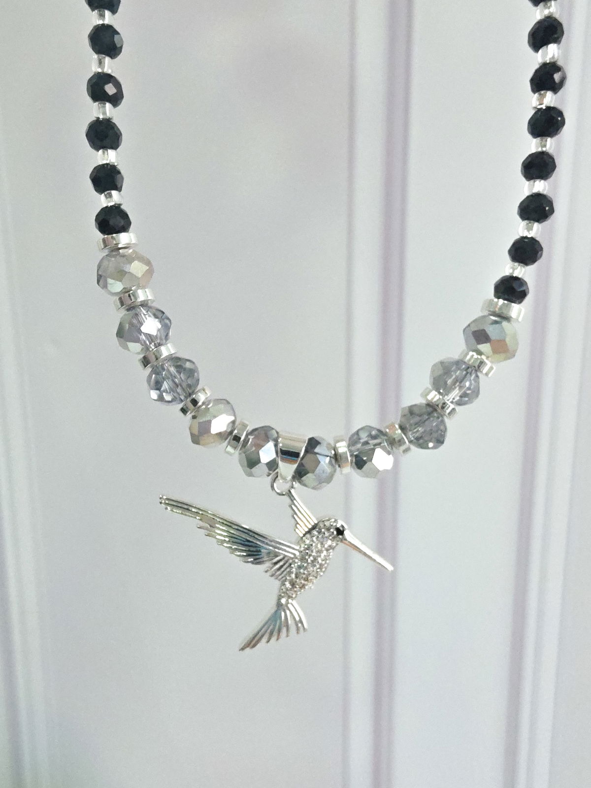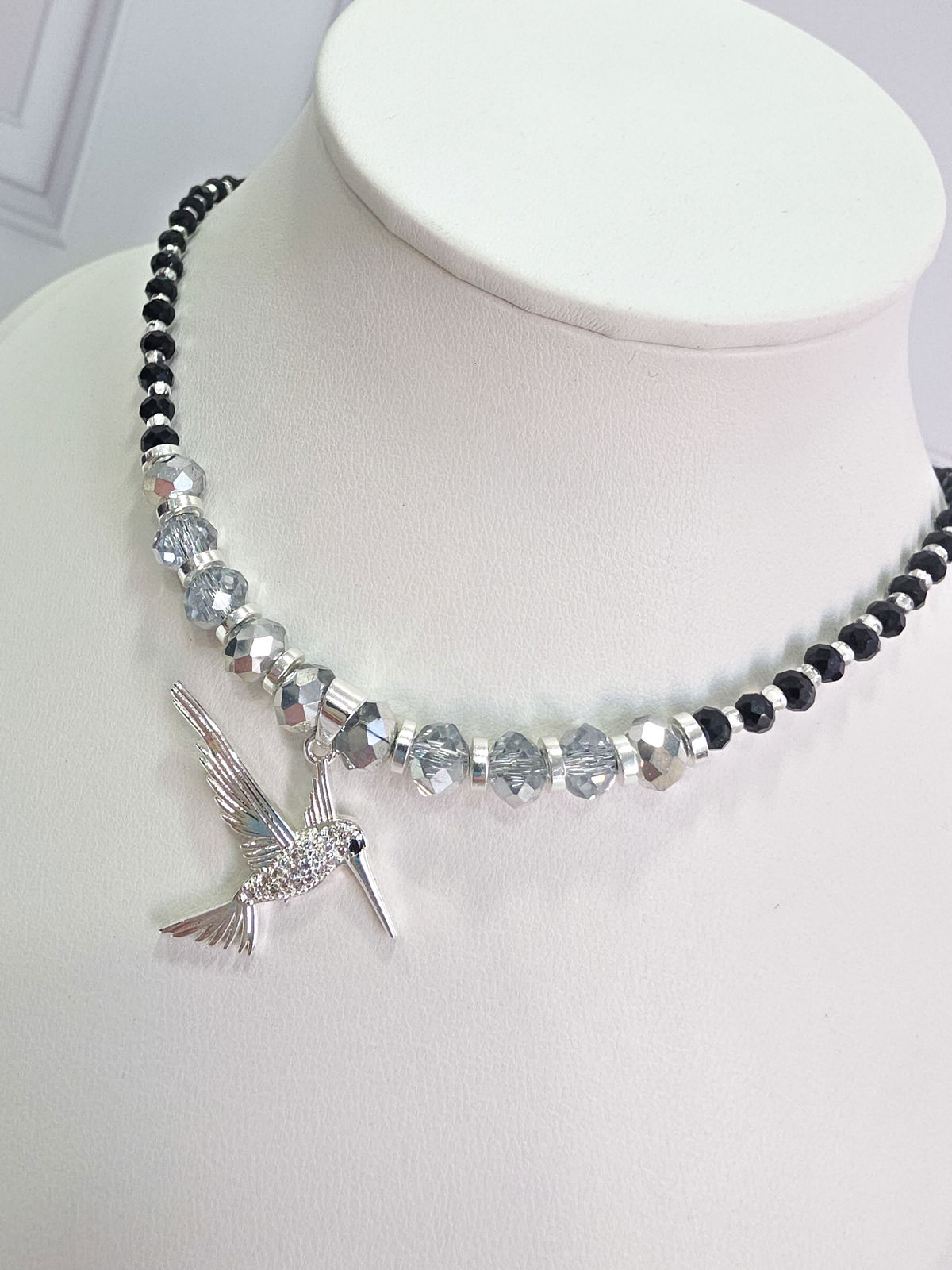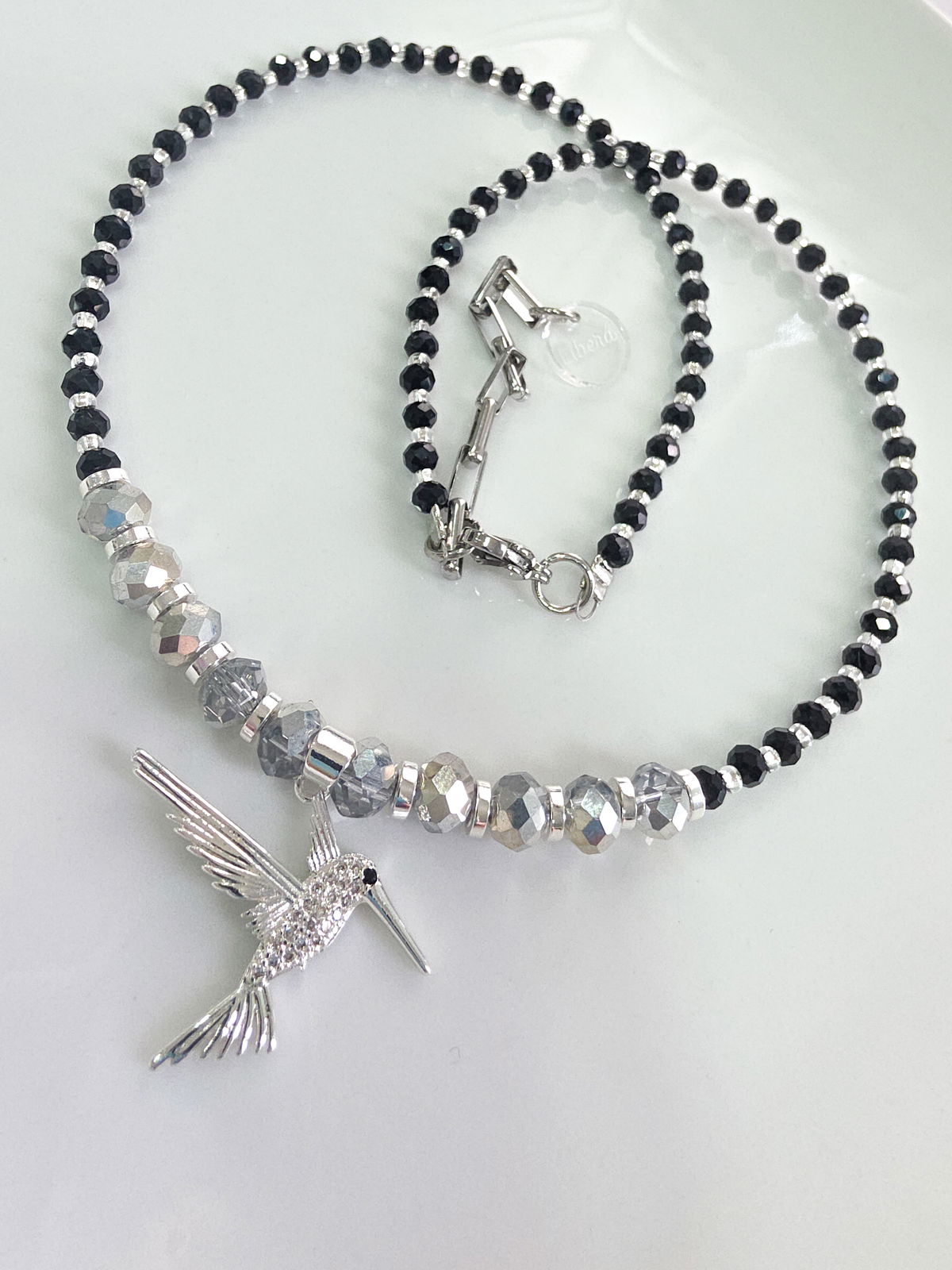 Collar de aproximadamente 40 cm (más cadena de alargue) compuesto por cristales, mostacillas Checas calibradas marca Preciosa, separadores de Hematite con baño en Plata y dije Colibrí con baño en Plata y Micropave Blanco.