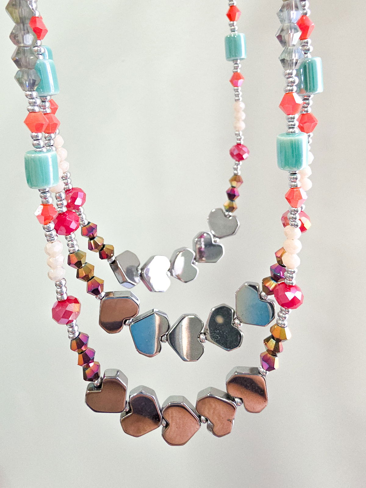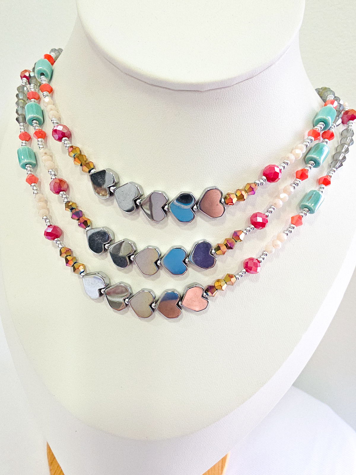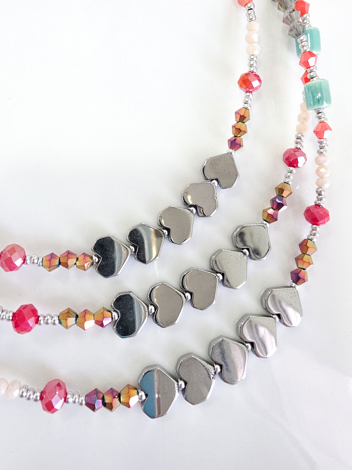 Collar de aproximadamente 40 cm (más cadena de alargue) compuesto por cristales de diferentes formas y tamaños, mostacillas Checas calibradas marca Preciosa, tubitos de Cerámica esmaltada y centro con corazones de Hematite. Cierre y cadena de Acero Quirúrgico 316l.