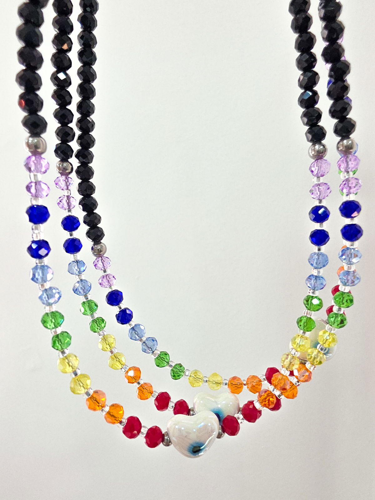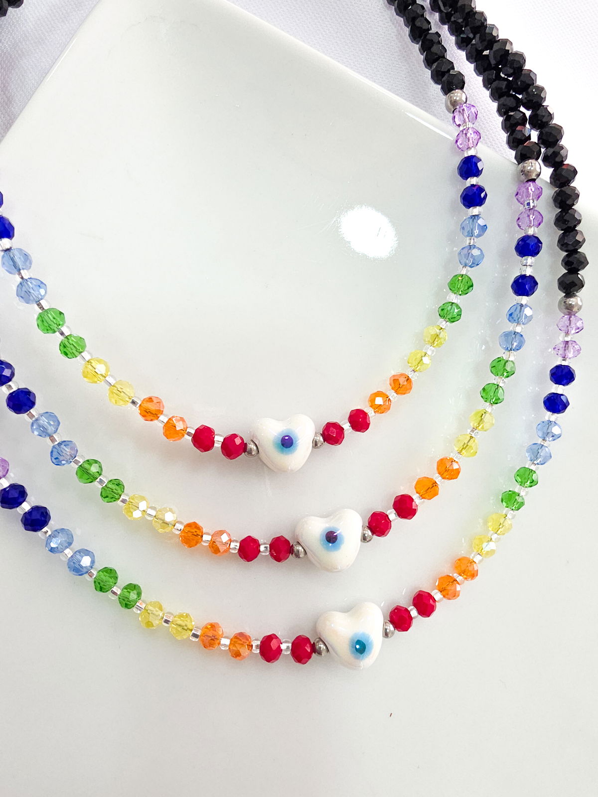 Collar de aproximadamente 40 cm (más cadena de alargue) compuesto por cristales y ojito en forma de corazón de cerámica esmaltada.