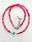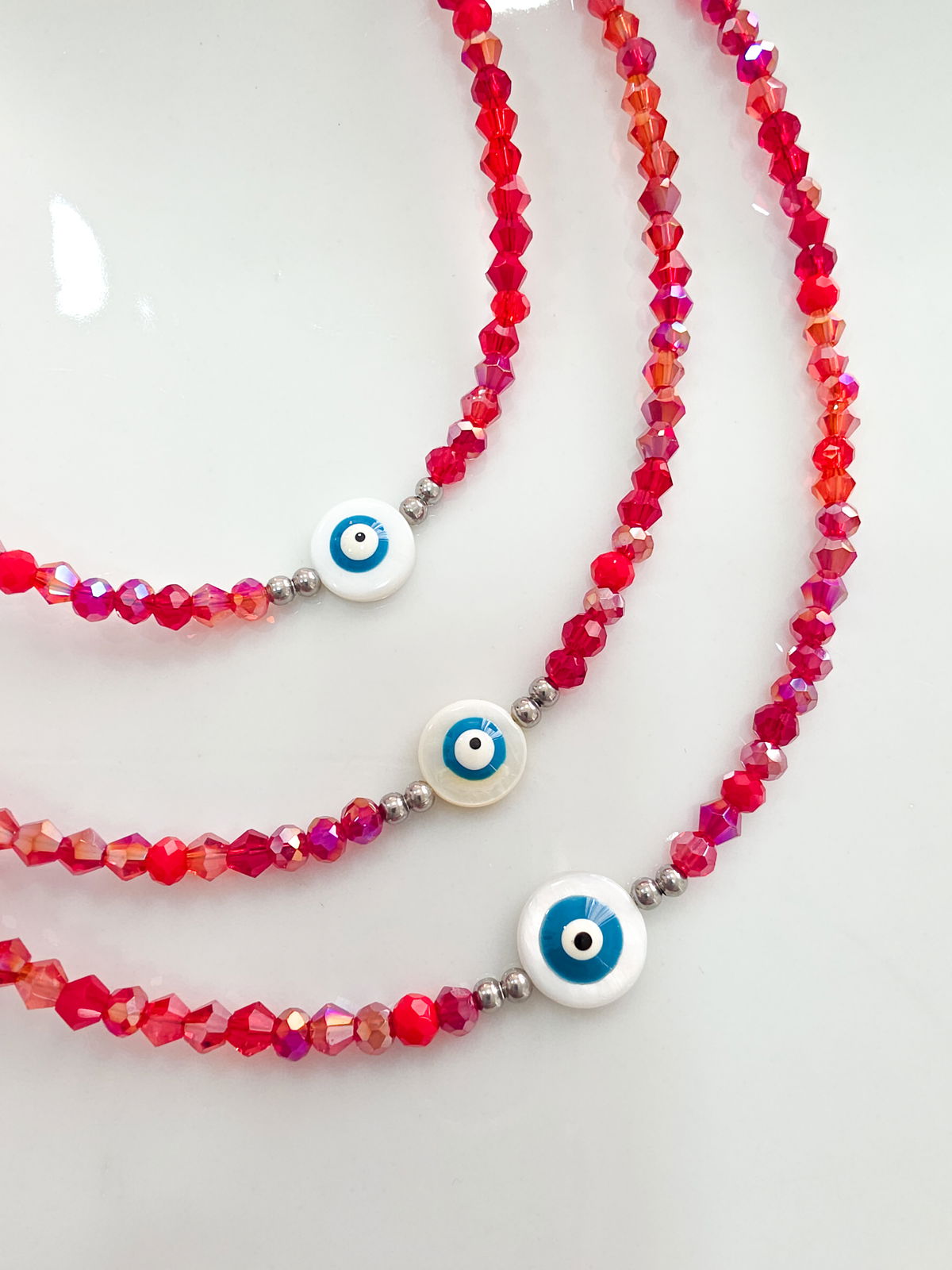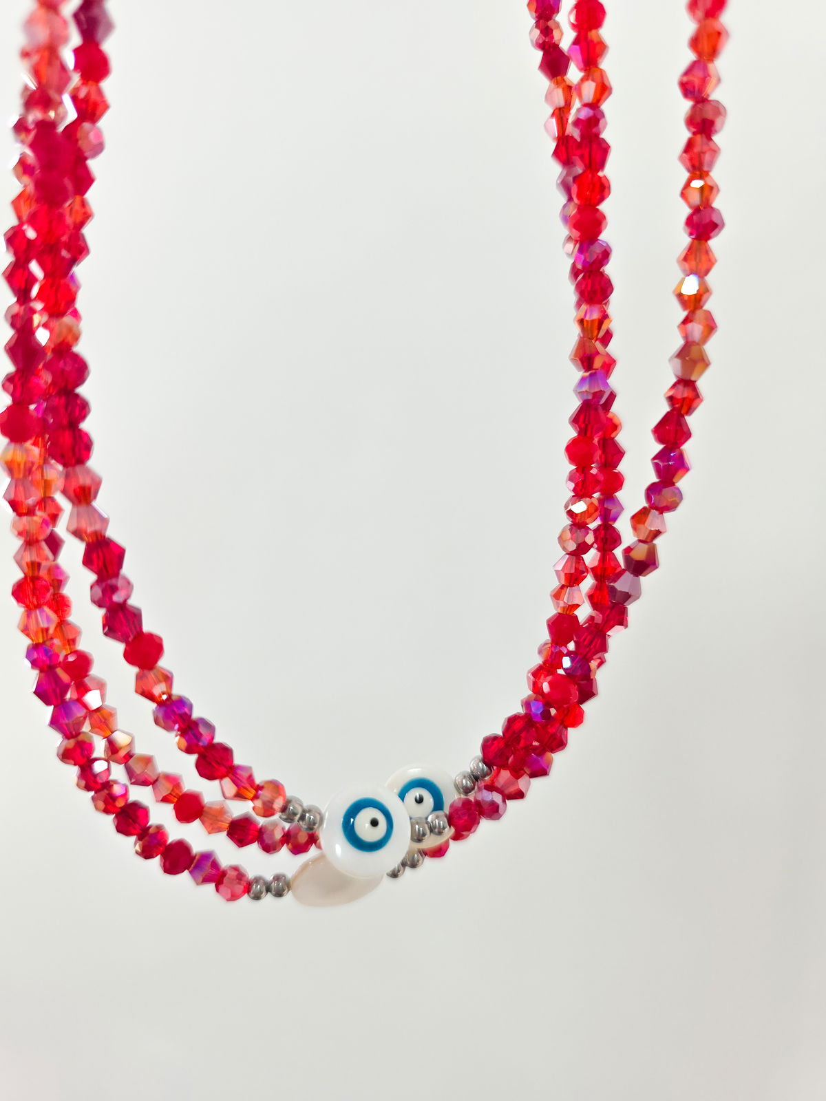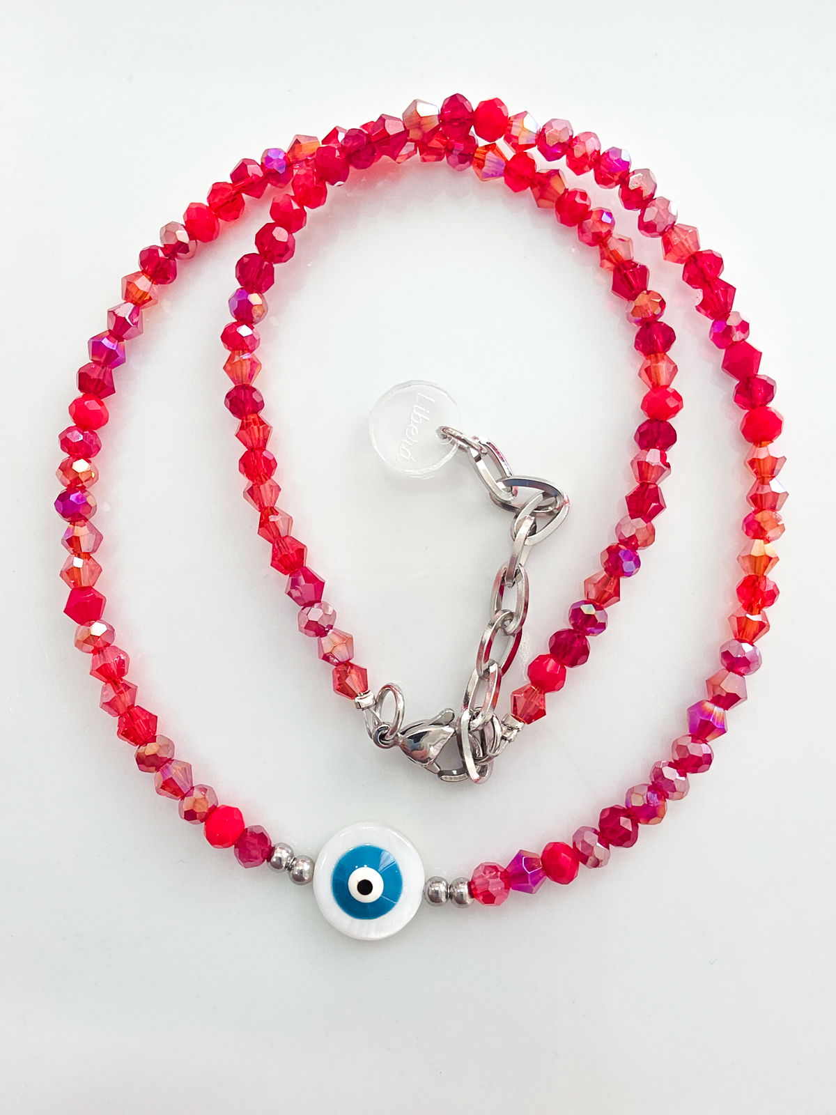 Collar de aproximadamente 40 cm (más cadena de alargue) compuesto por cristales de diferentes tonalidades de rojos. Ojito de Nácar.