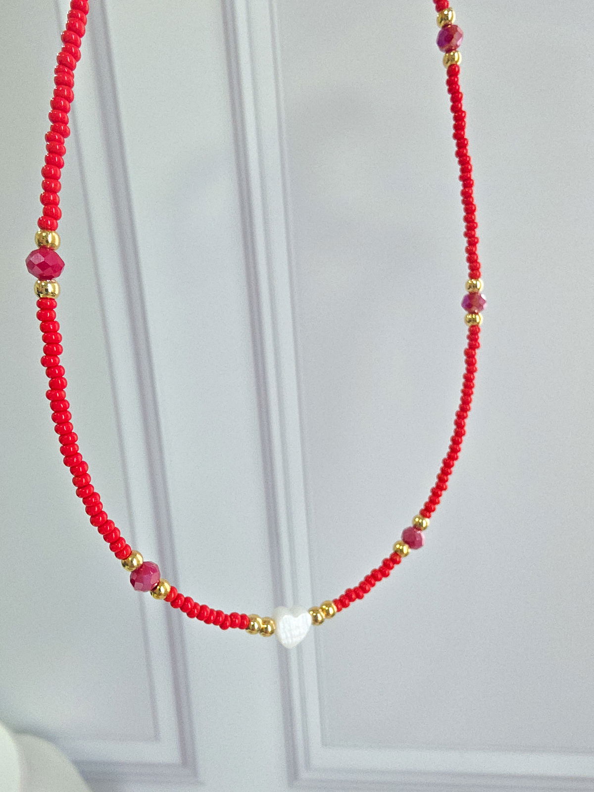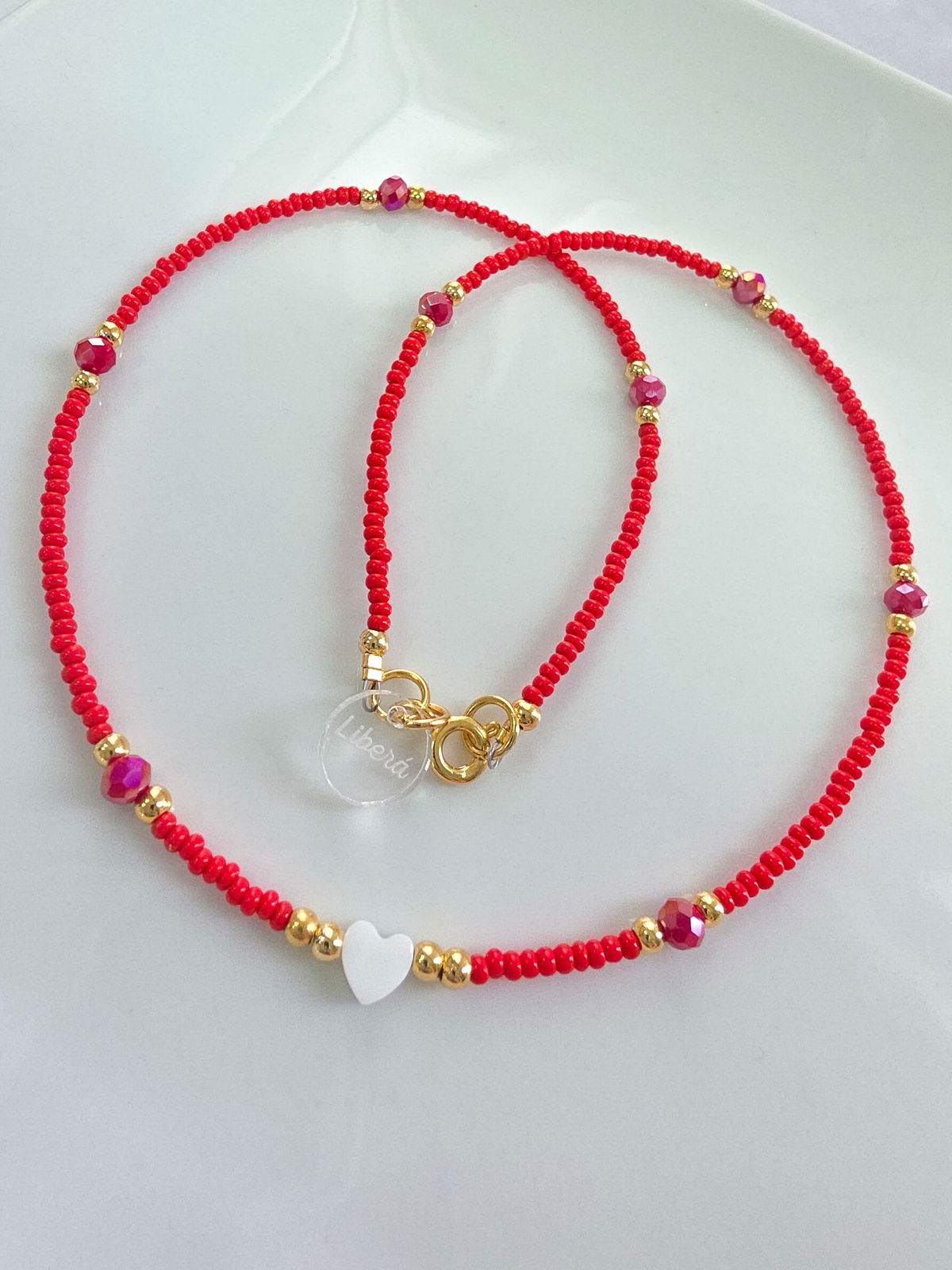 Collar de aproximadamente 40 cm. Compuesto por mini mostacillas Checas calibradas marca Preciosa, cristales y corazón de Nácar. Detalles y terminaciones laminadas en Oro 18k.