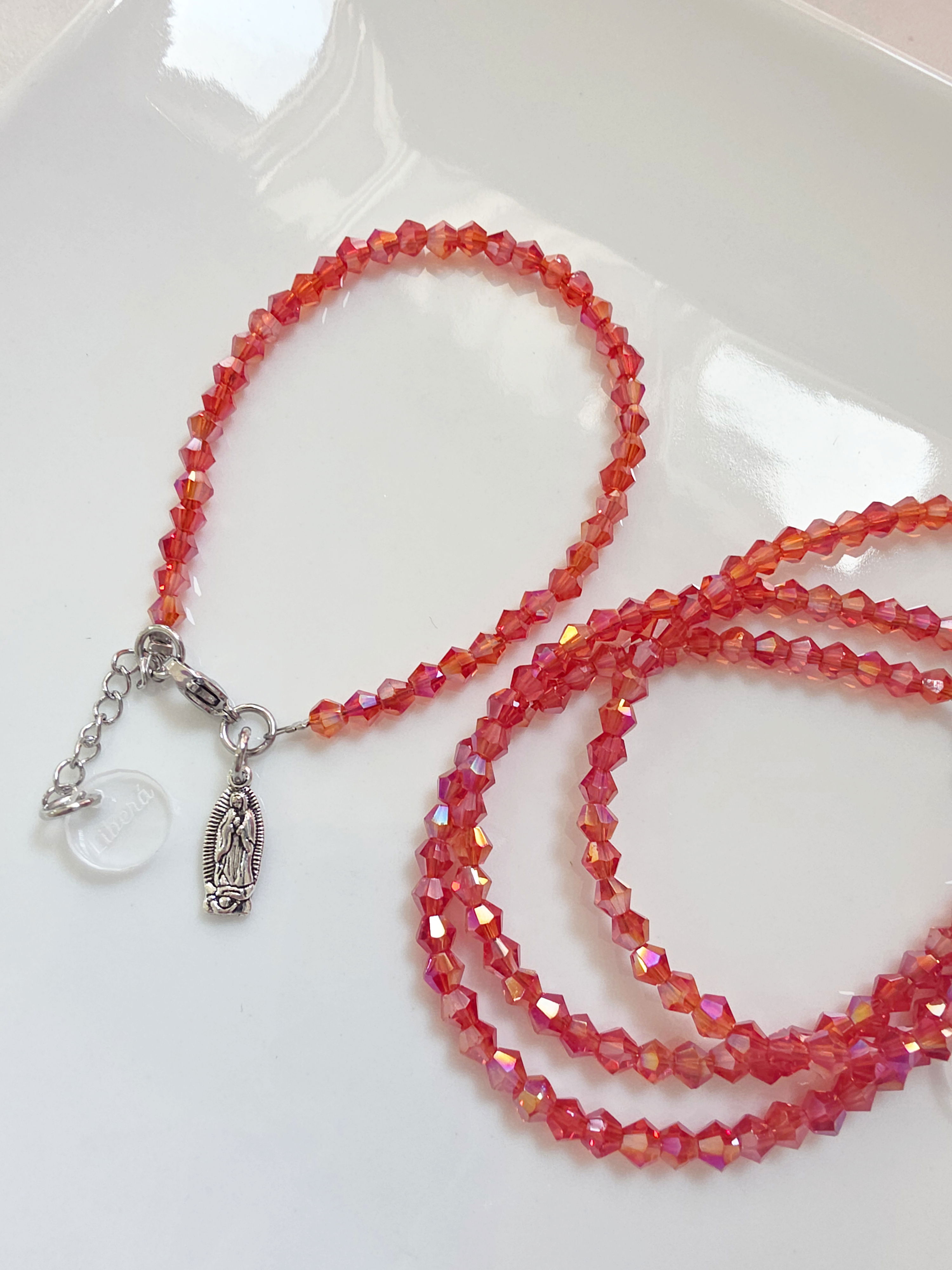 Pulsera compuesta por cristales. Cierre y cadena de alargue de Acero Quirúrgico 316l. Dije Virgencita de fundición (excelente calidad)