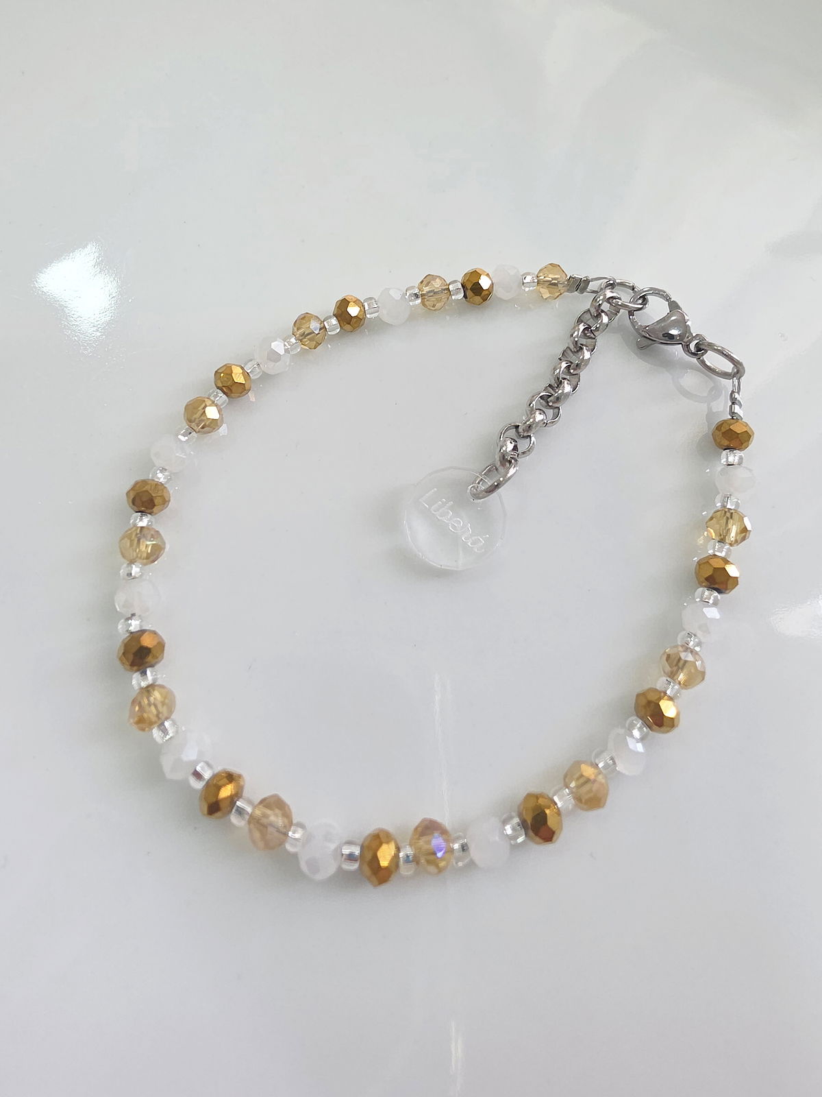 Pulsera compuesta por cristales de diferentes tonos intercalados con mostacillas checas marca Preciosa. Detalles, terminación y cadena de Acero Quirúrgico 316l.