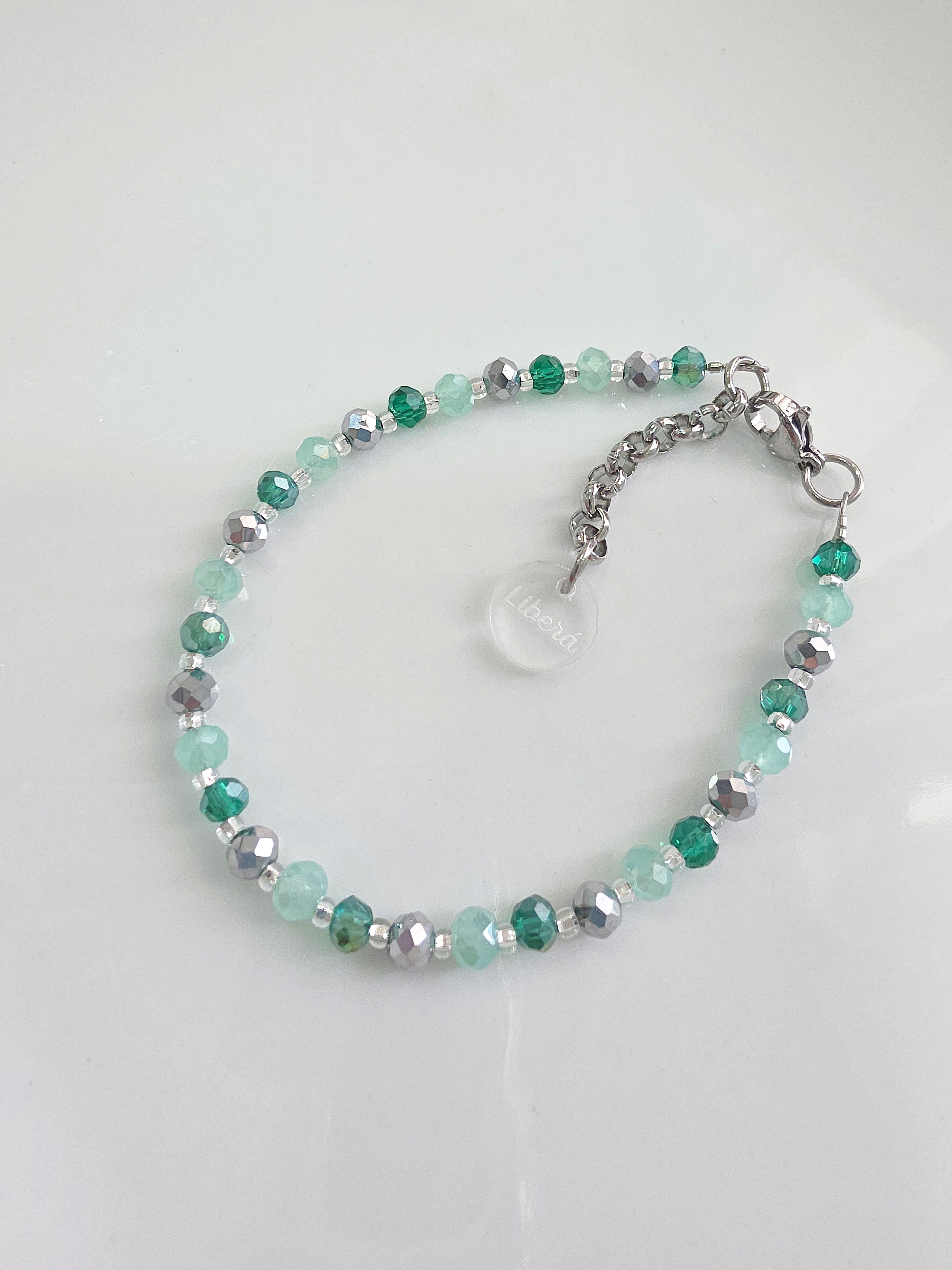 Pulsera compuesta por cristales de diferentes tonos intercalados con mostacillas checas marca Preciosa. Detalles, terminación y cadena de Acero Quirúrgico 316l.