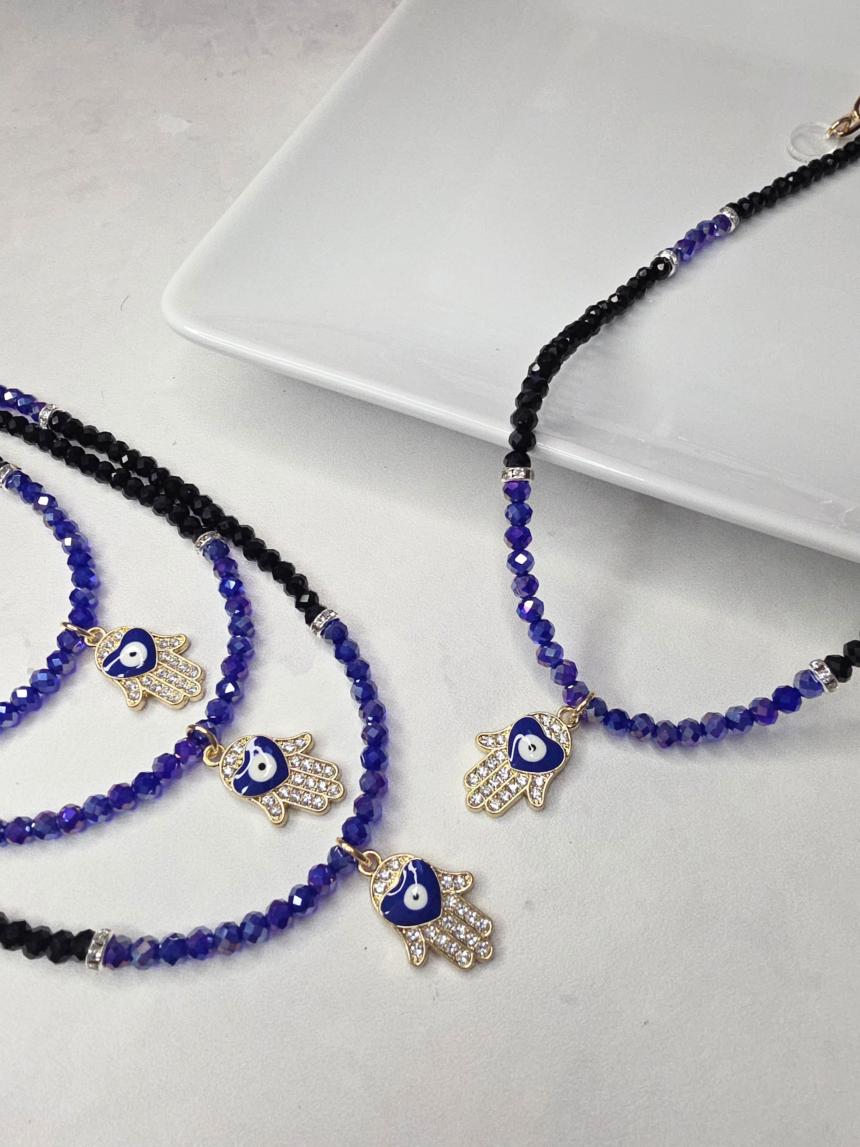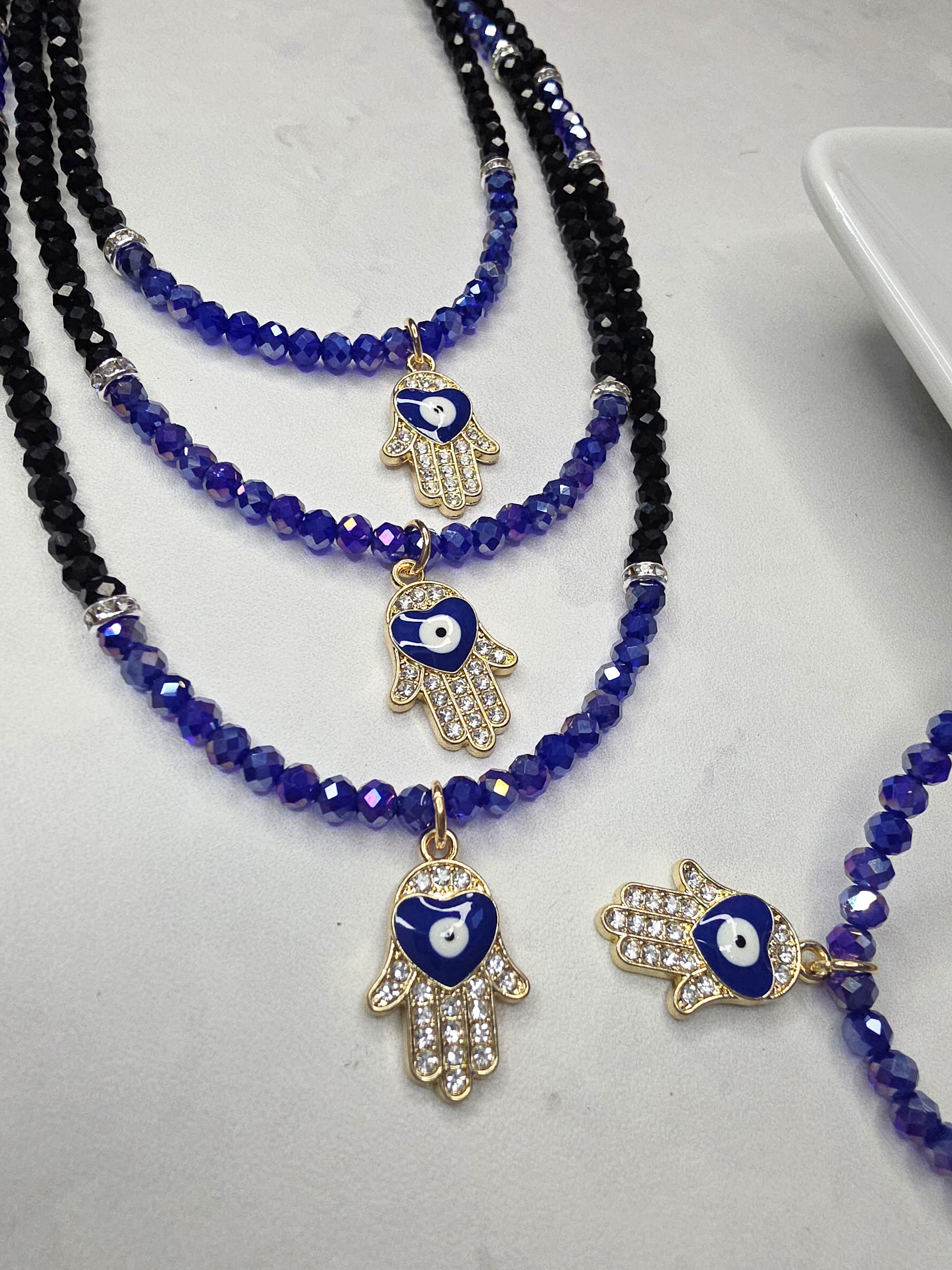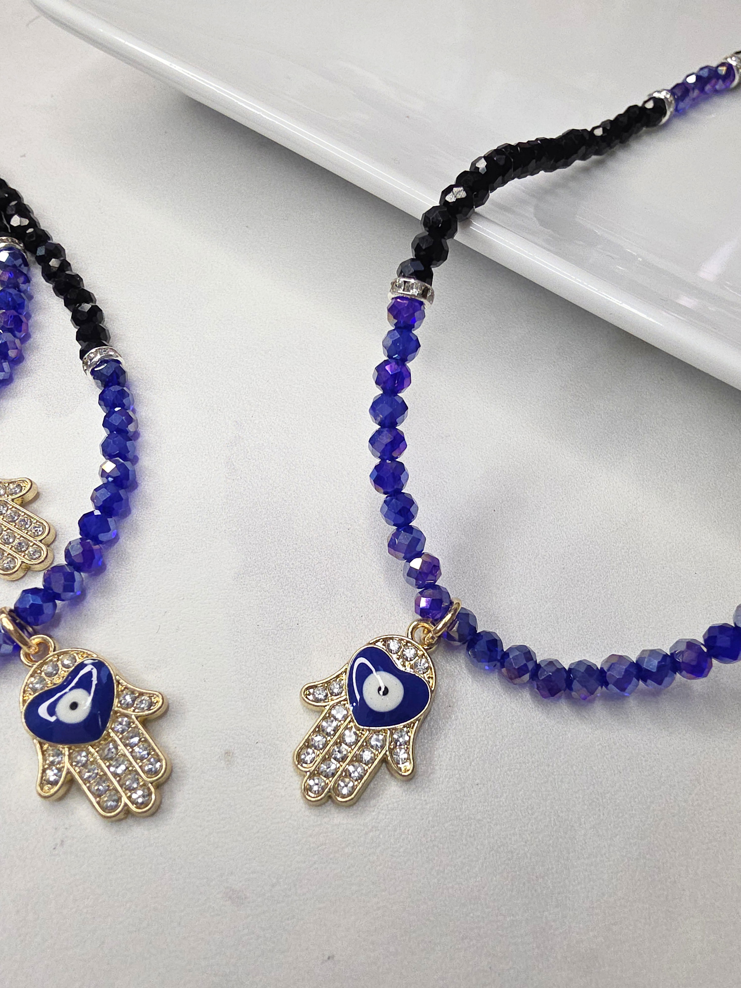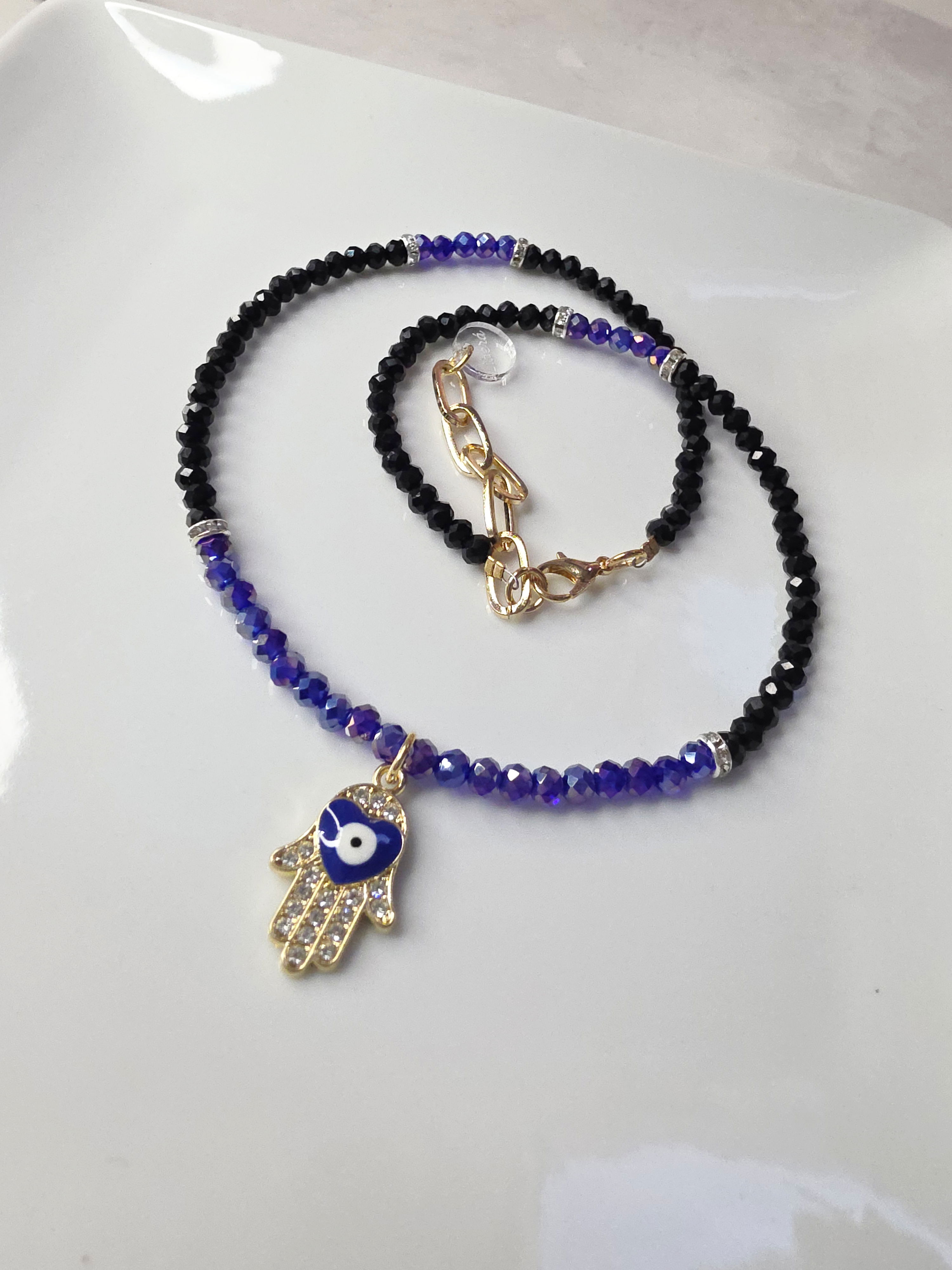 Collar de aproximadamente 45 cm (más cadena de alargue) compuesto por cristales, arandelas de strass y fije Fátima de strass con corazón y ojito