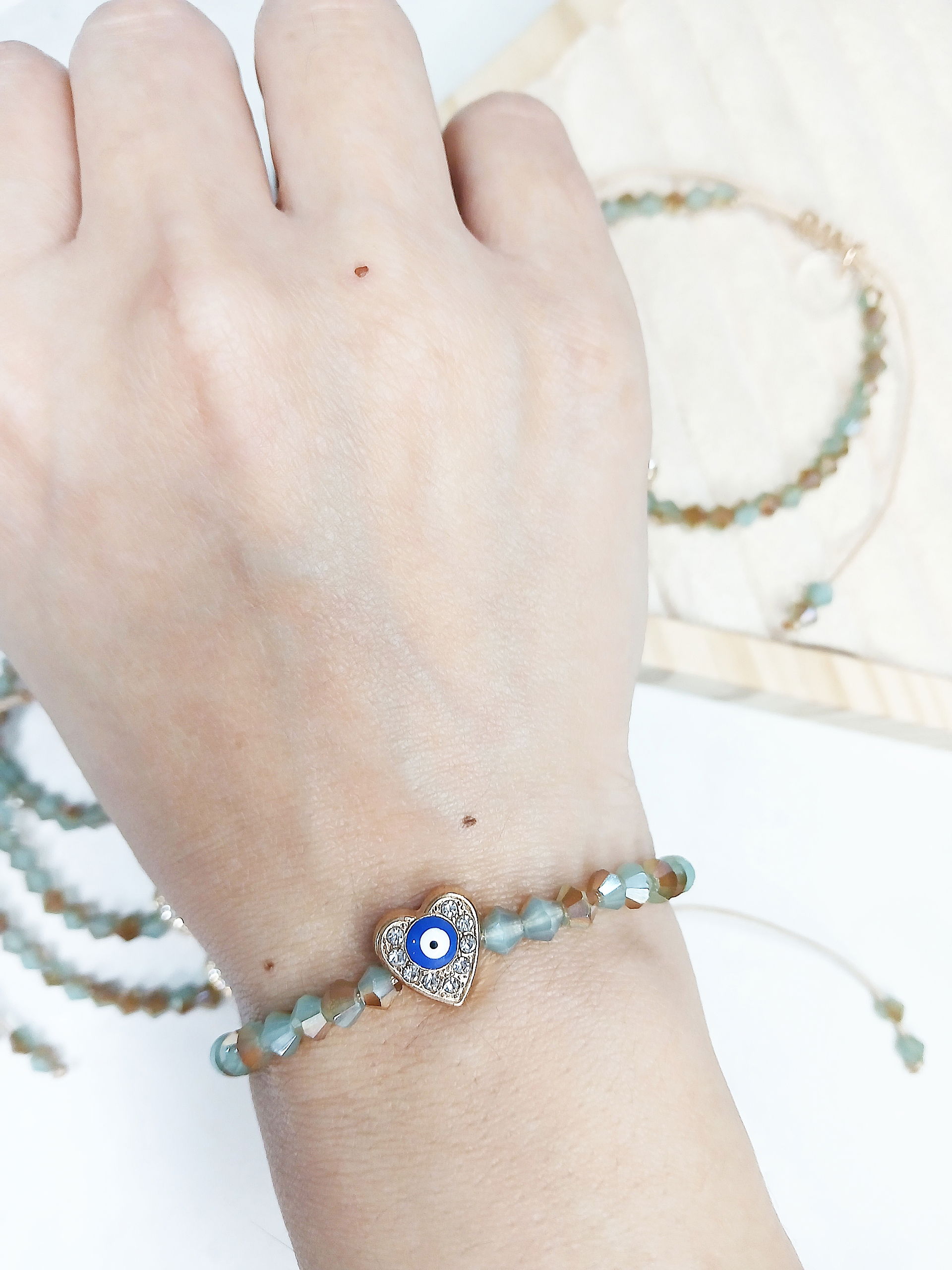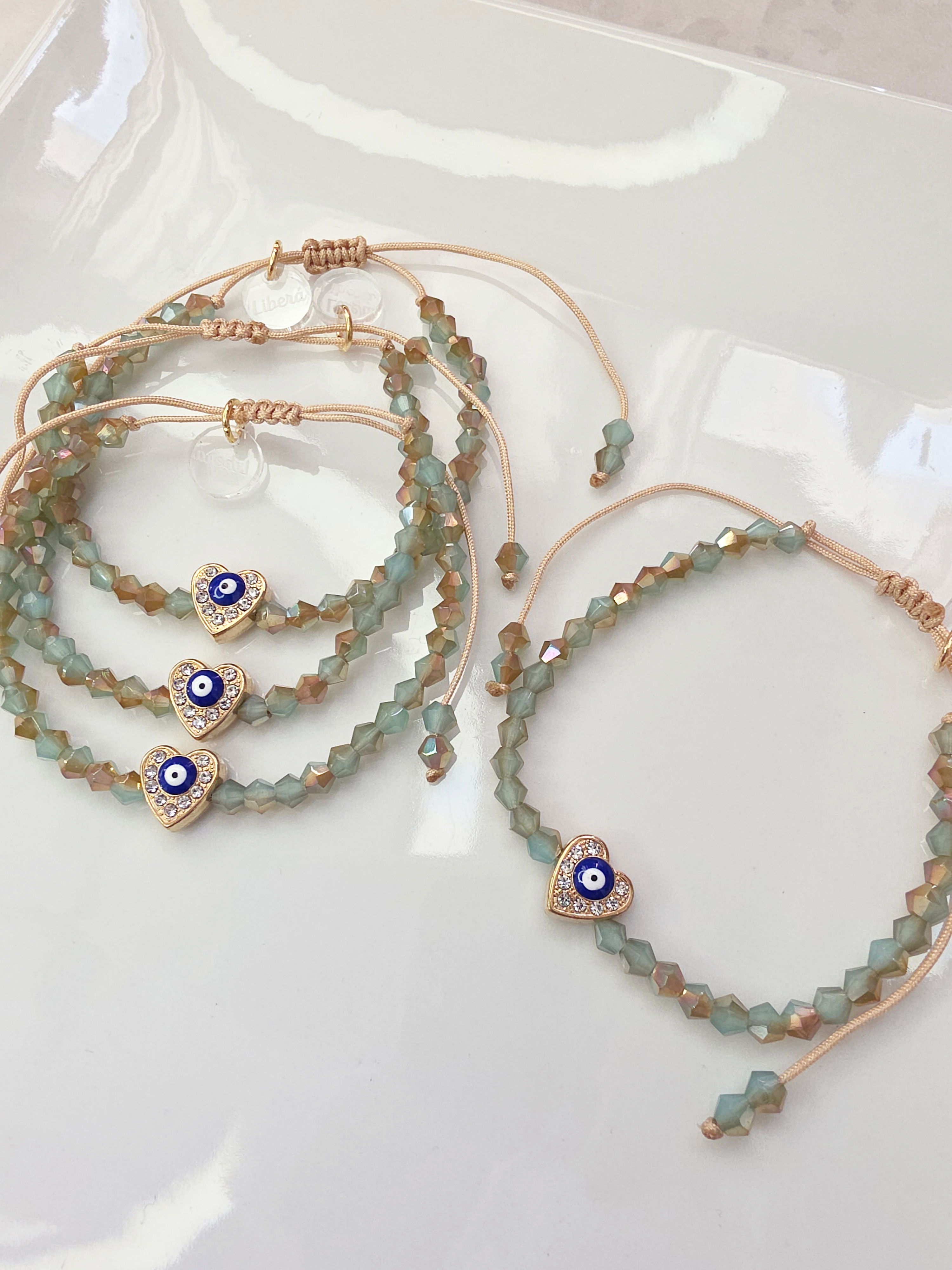 Pulsera compuesta por cristales y dije con Strass. Cierre regulable en Macramé, se adapta a todas las medidas.