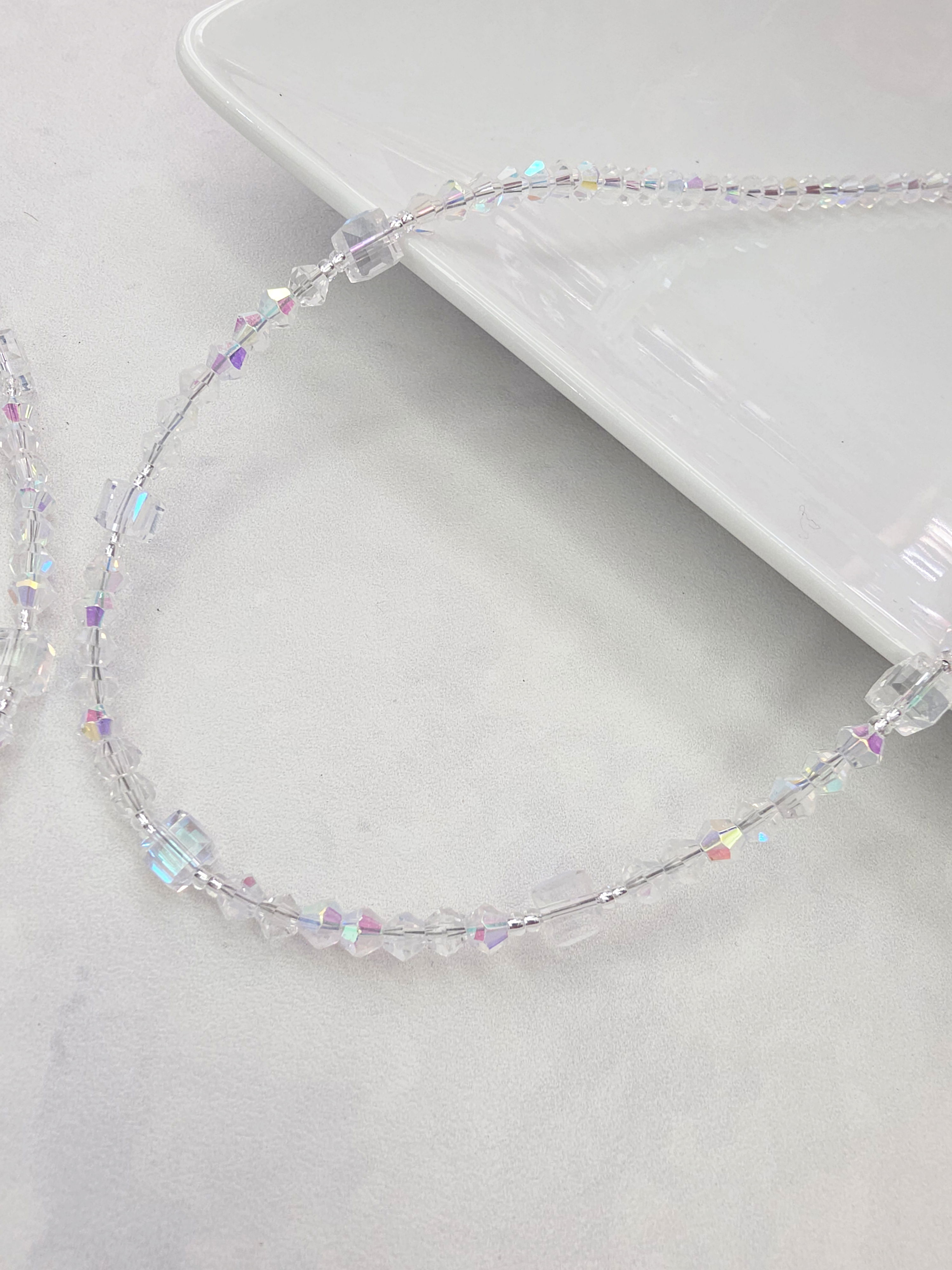 Collar de aproximadamente 40 cm (más cadena de alargue) compuesto por cristales cónicos, Mostacillas Checas calibradas marca Preciosa y Cubos de cristal al tono.