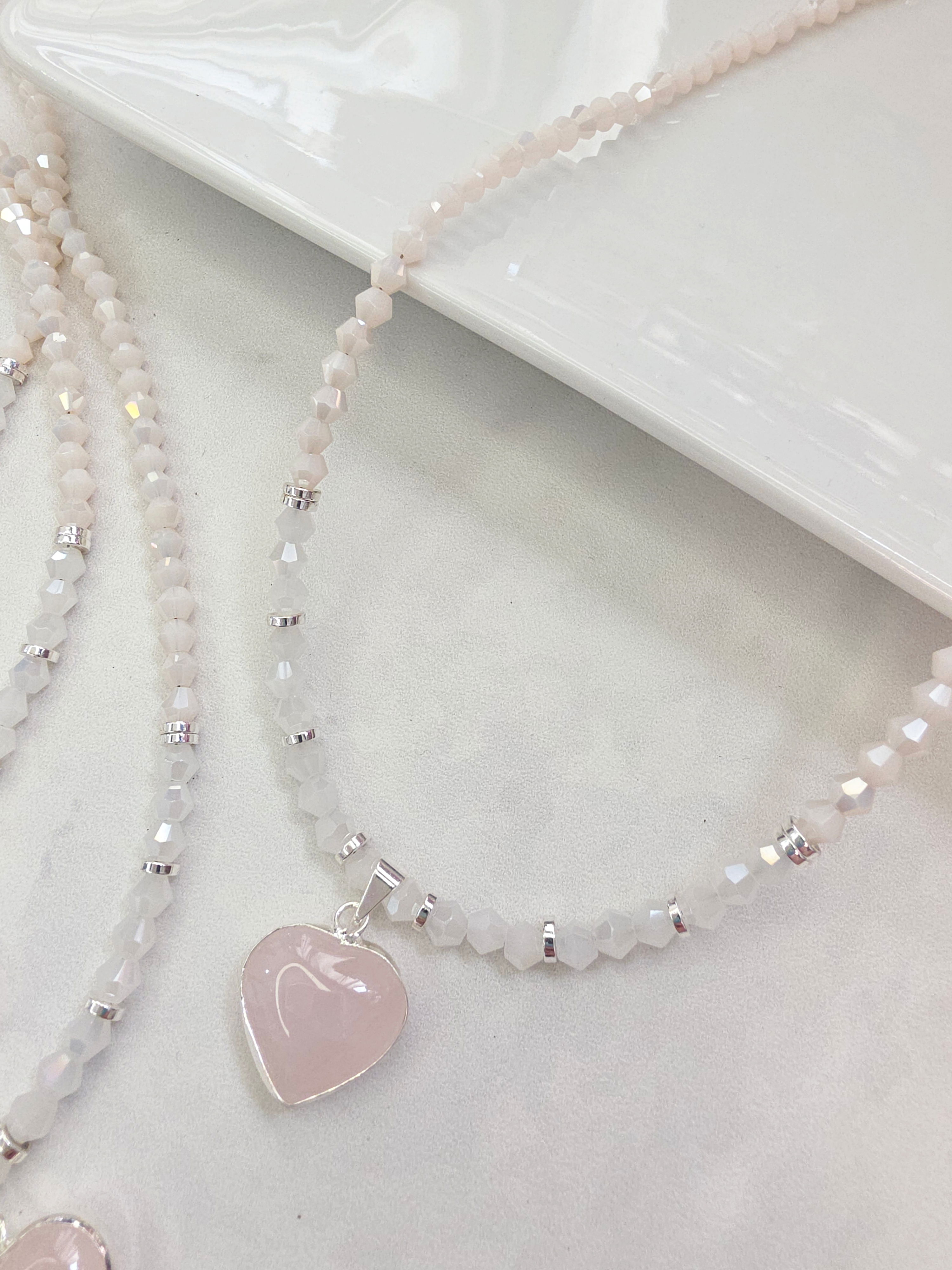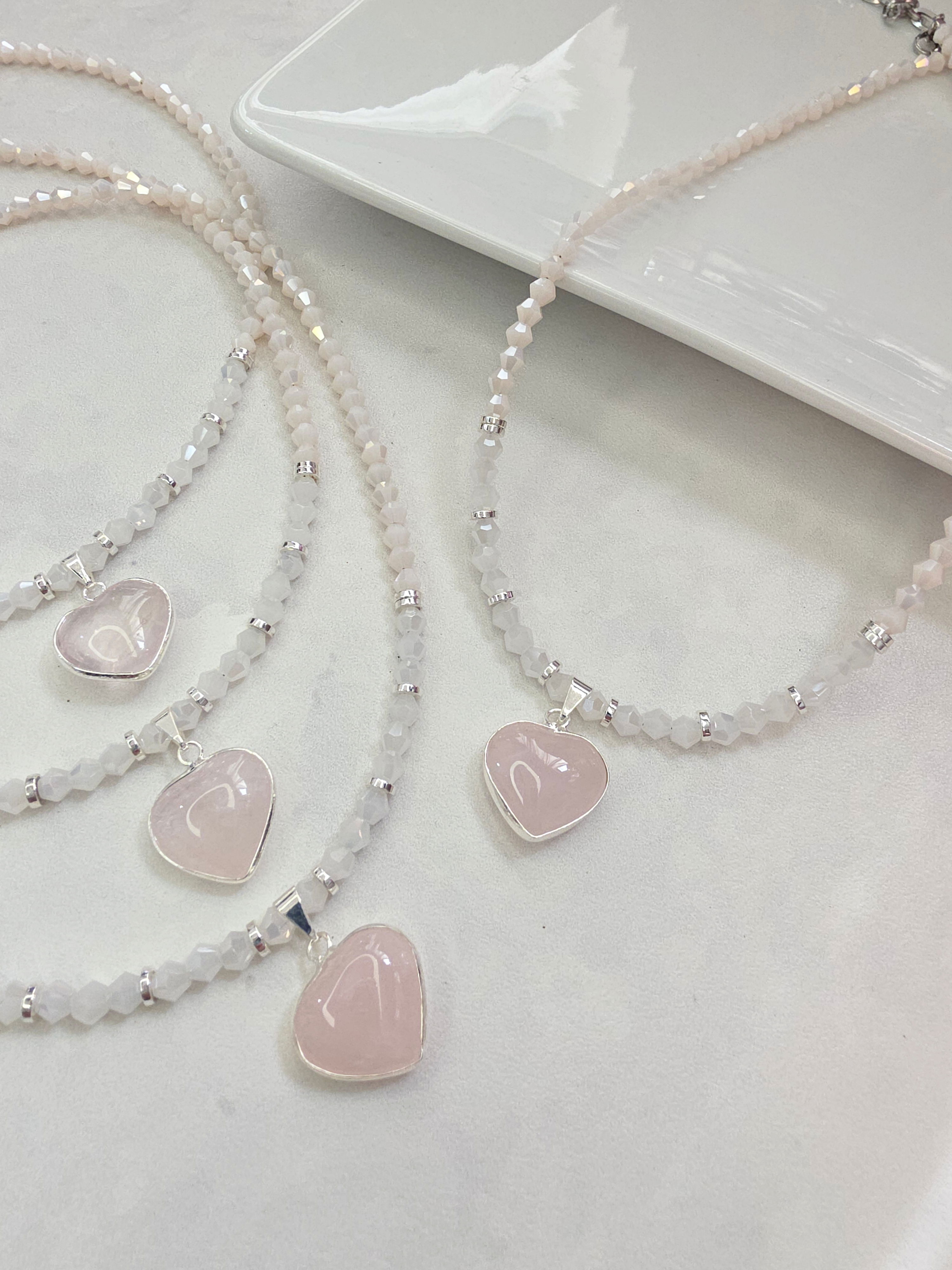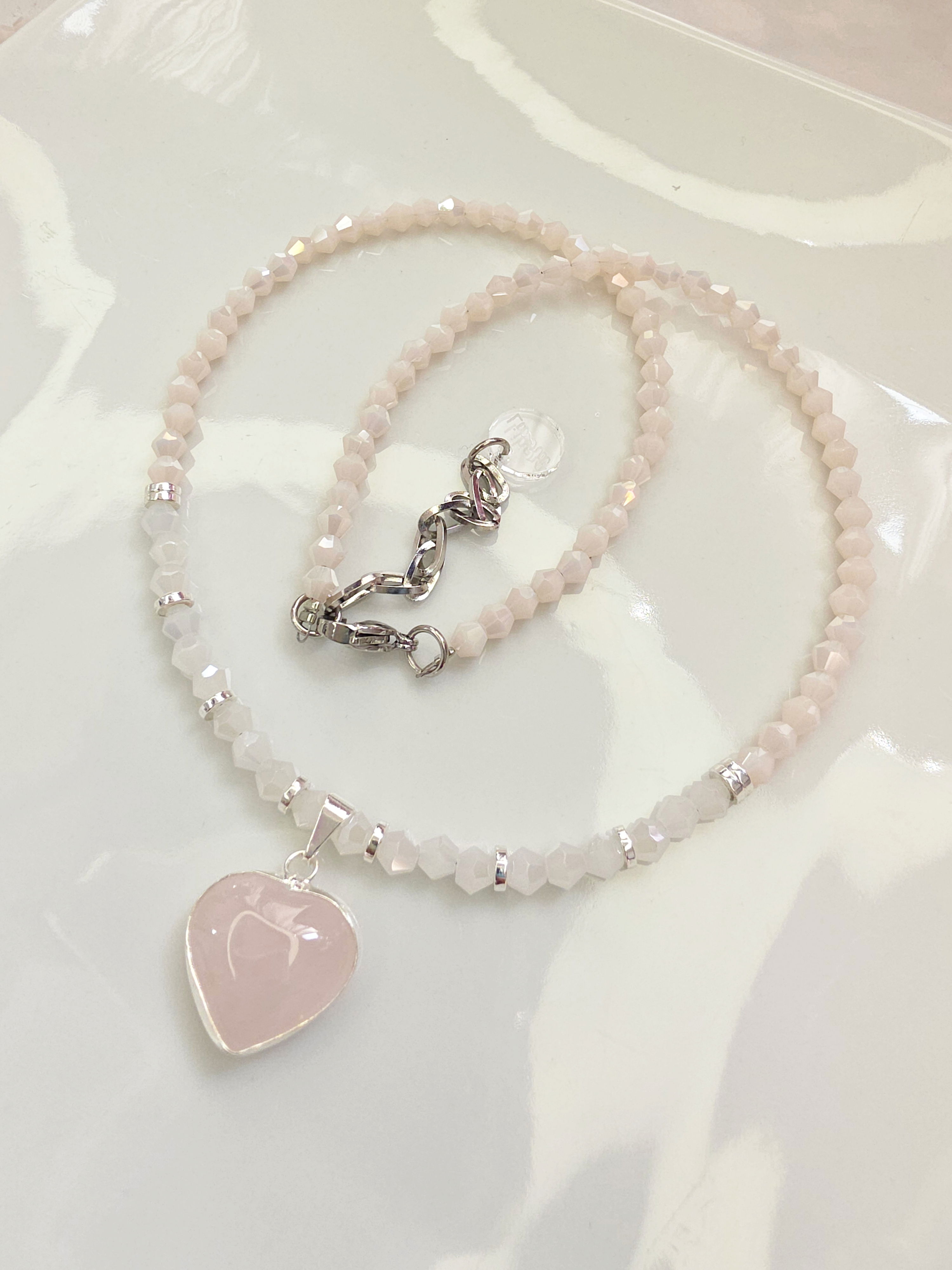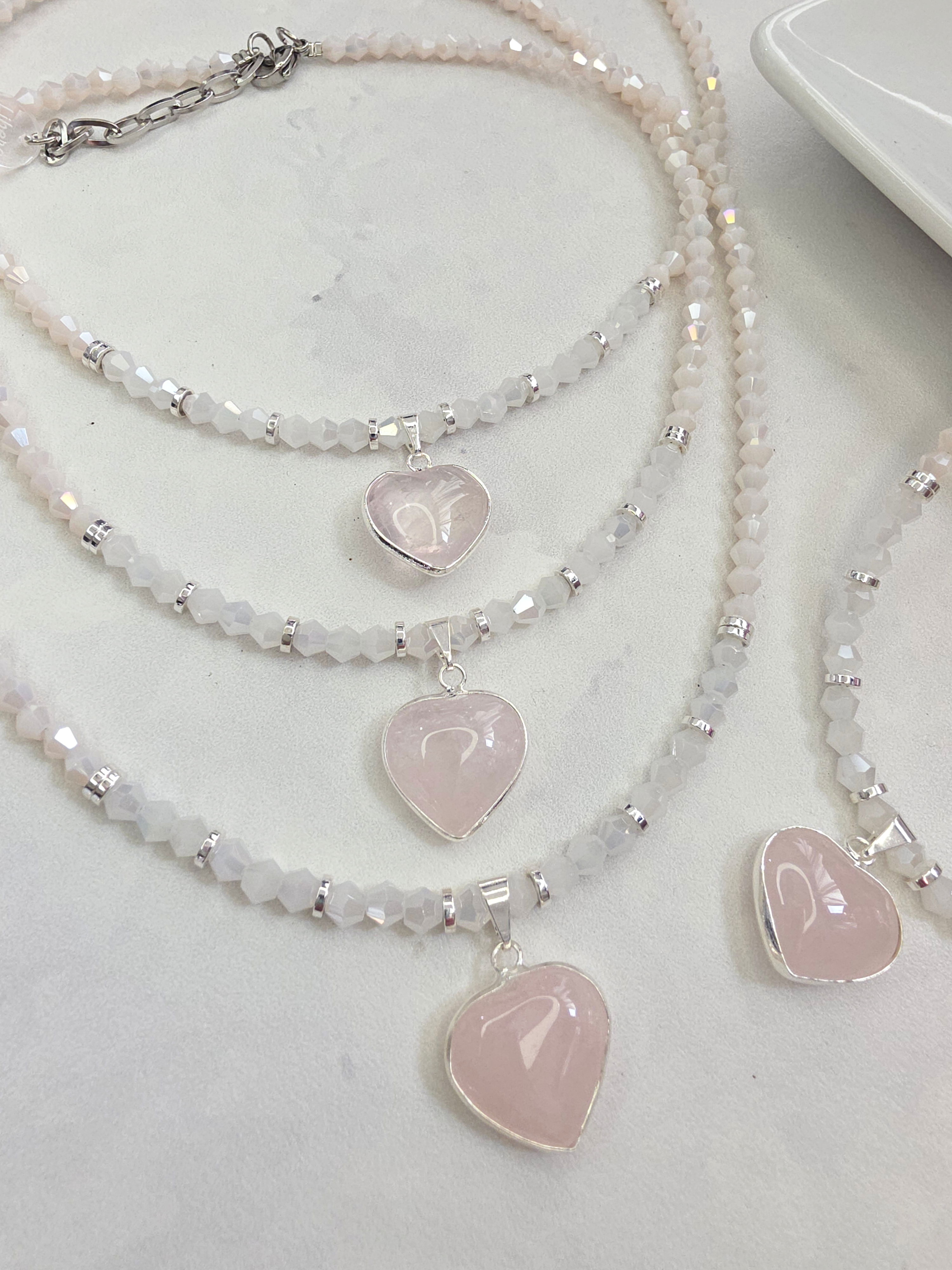 Collar de aproximadamente 40 cm (más cadena de alargue) compuesto por cristales,discos de Hematite y dije en forma de corazón de Piedra Natural Cuarzo Rosa con virola baño en Plata.