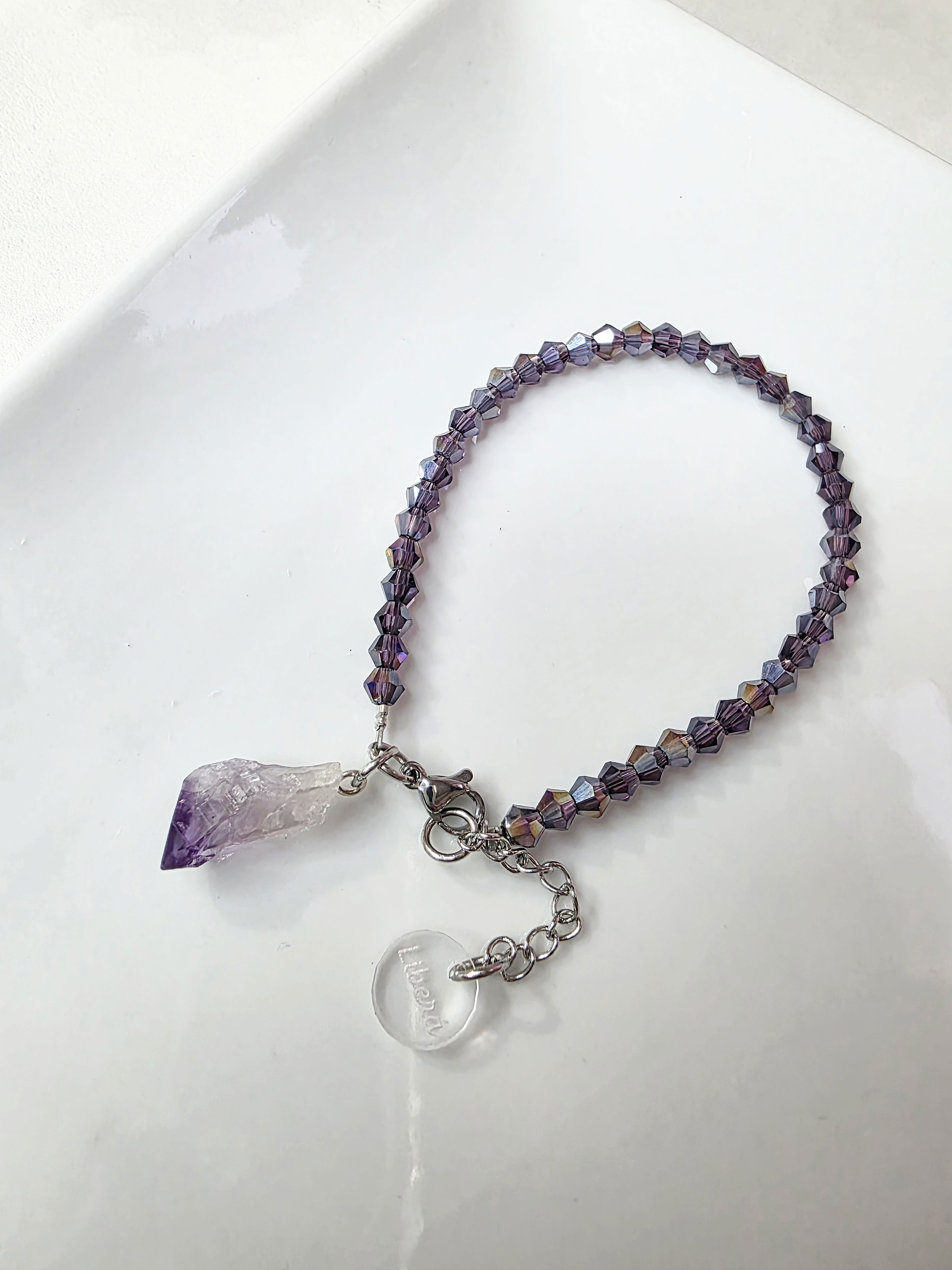 Pulsera de cristal con Dije de Piedra Natural Amatista. Detalles, cierre y cadena de Acero Quirúrgico 316l.
