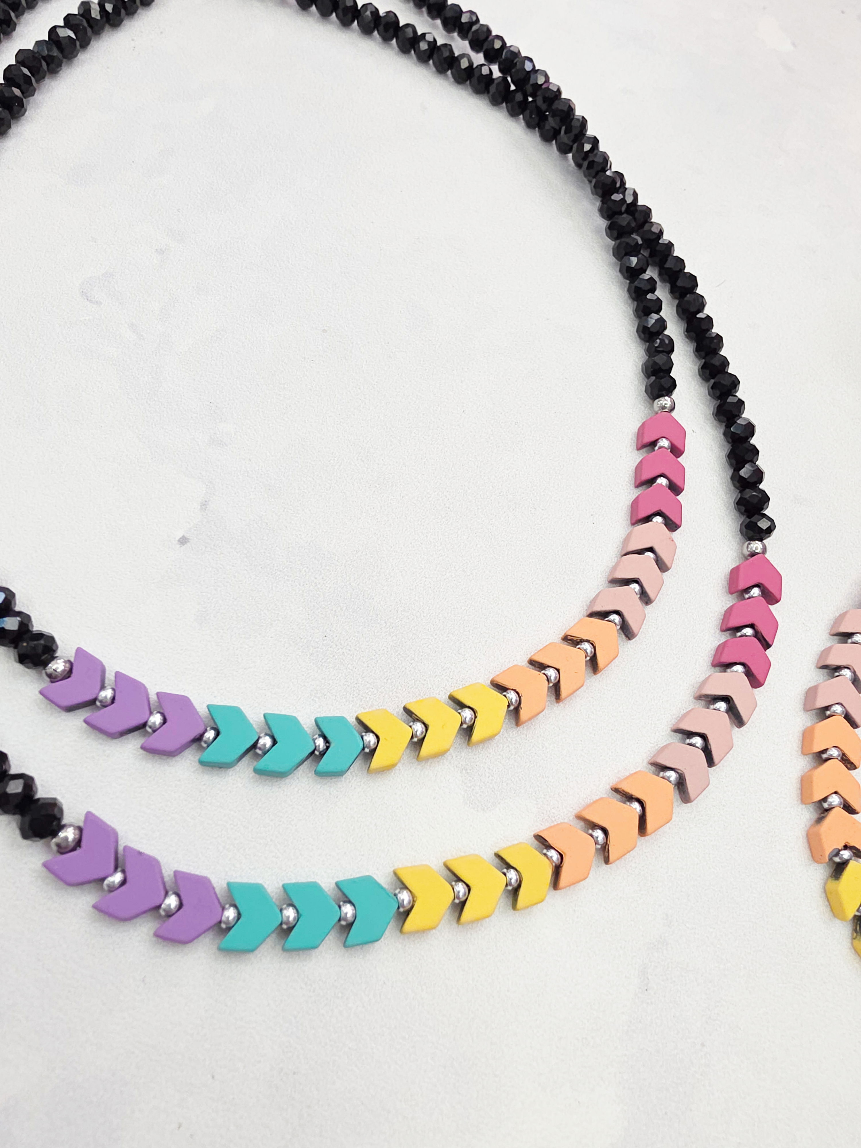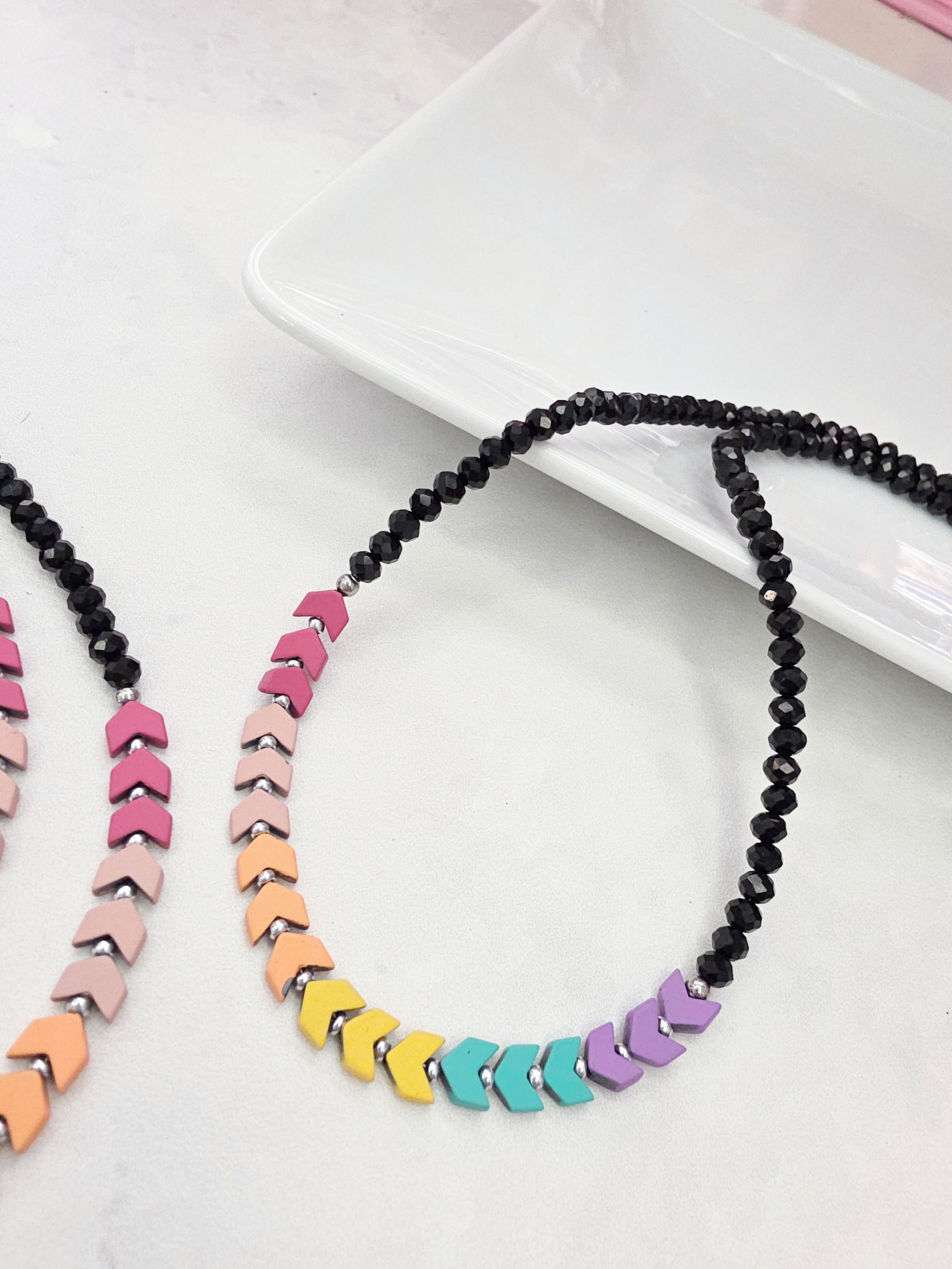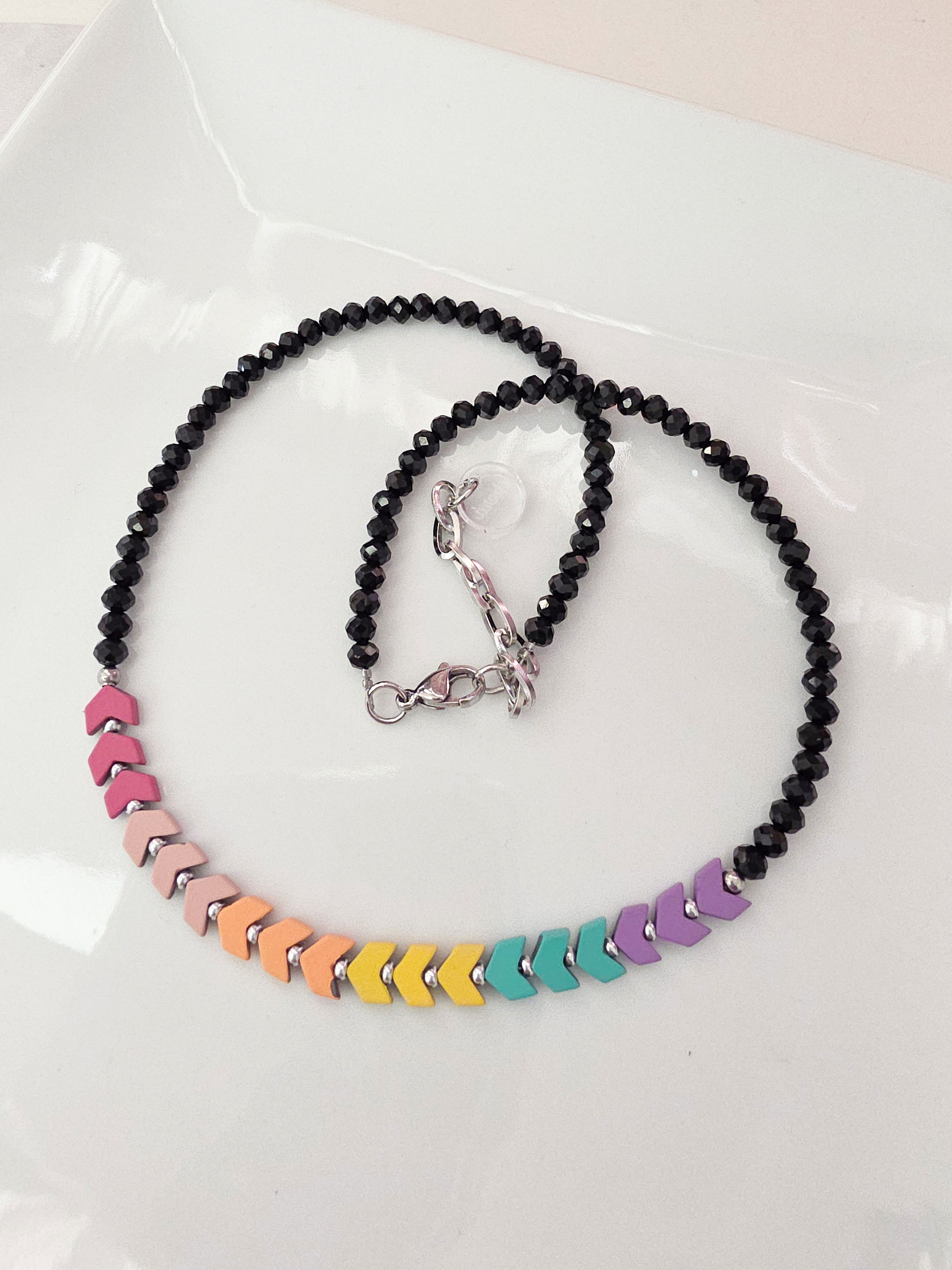 Collar de aproximadamente 40 cm (más cadena de alargue) compuesto por cristales, mostacillas Checas calibradas marca Preciosa y Flechitas de Hematite en tonos pastel.