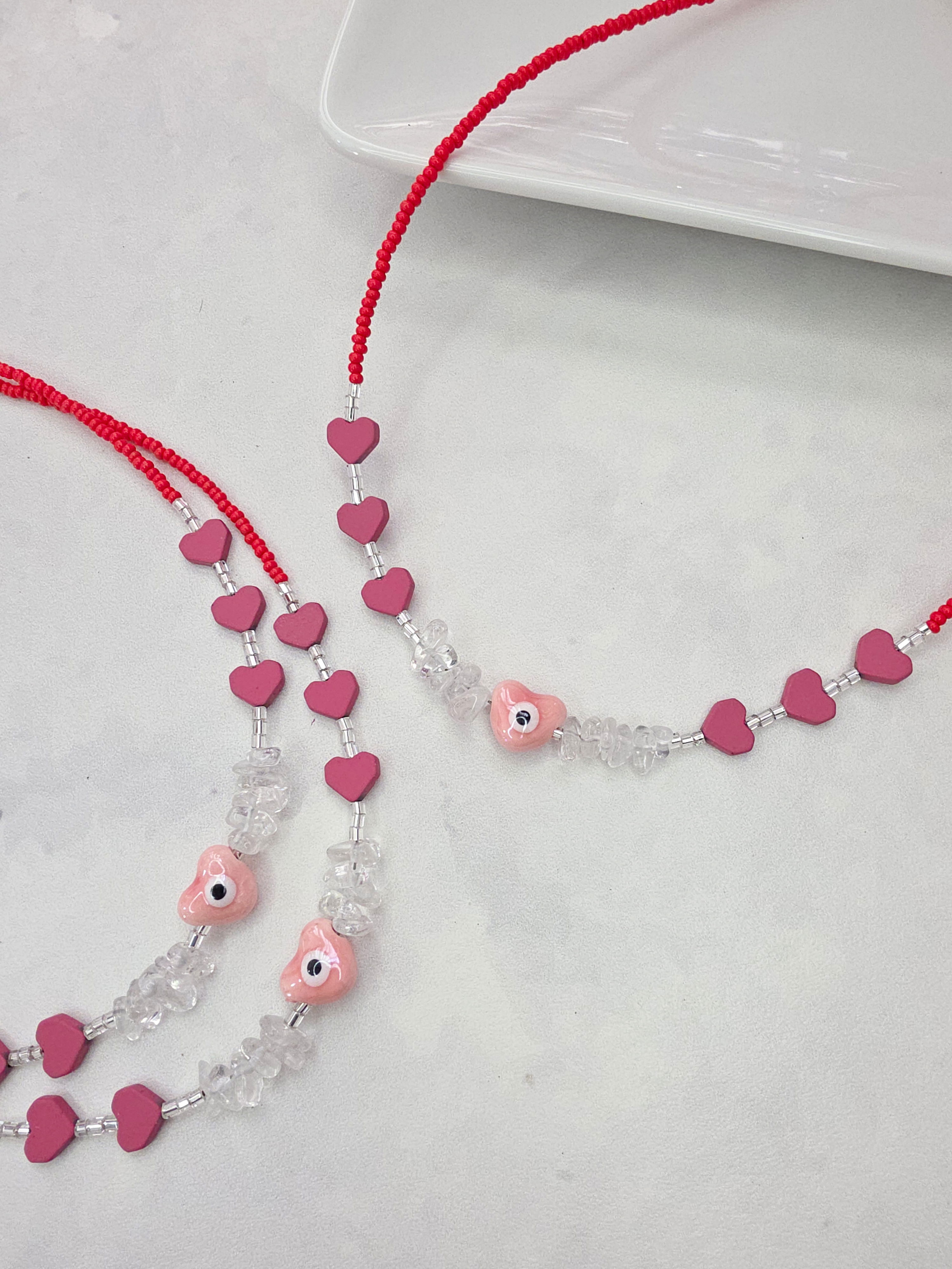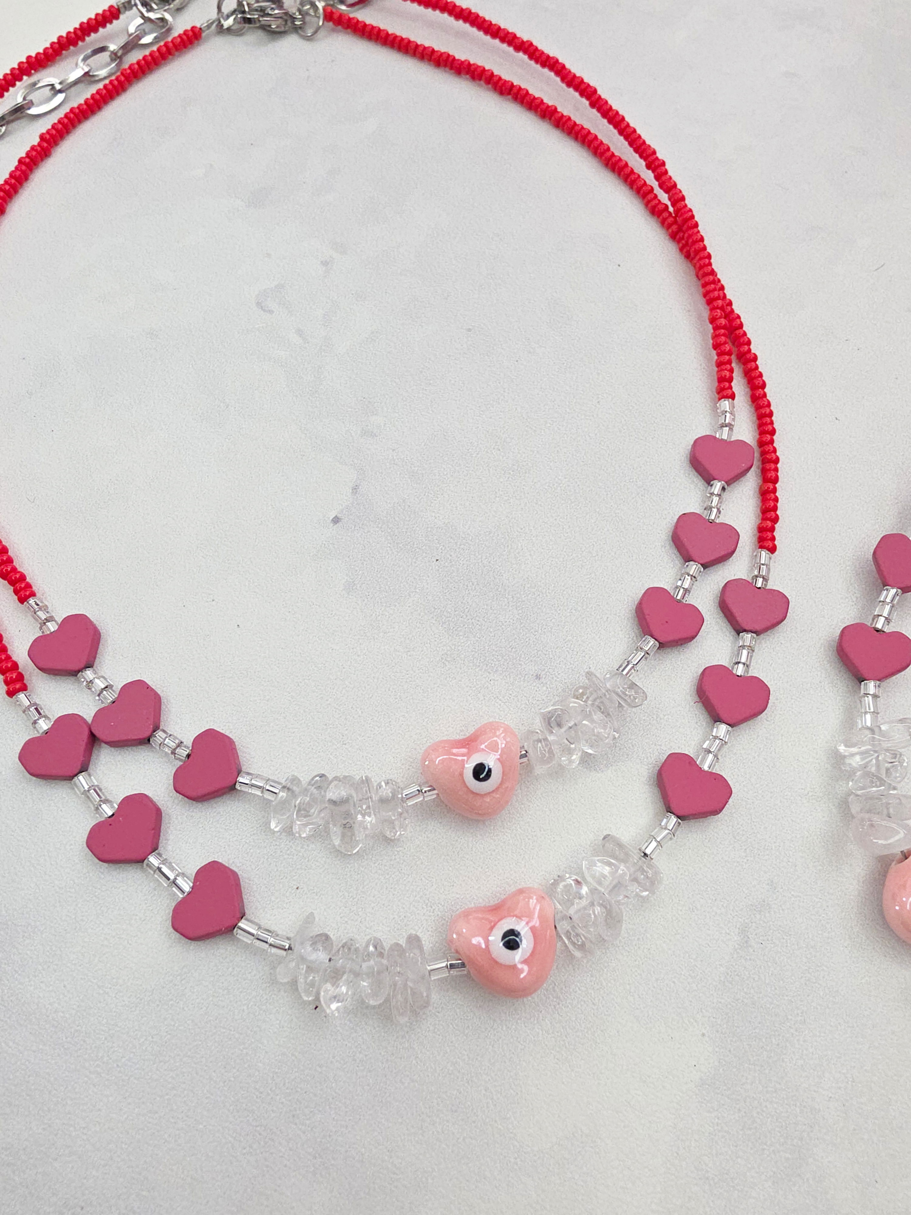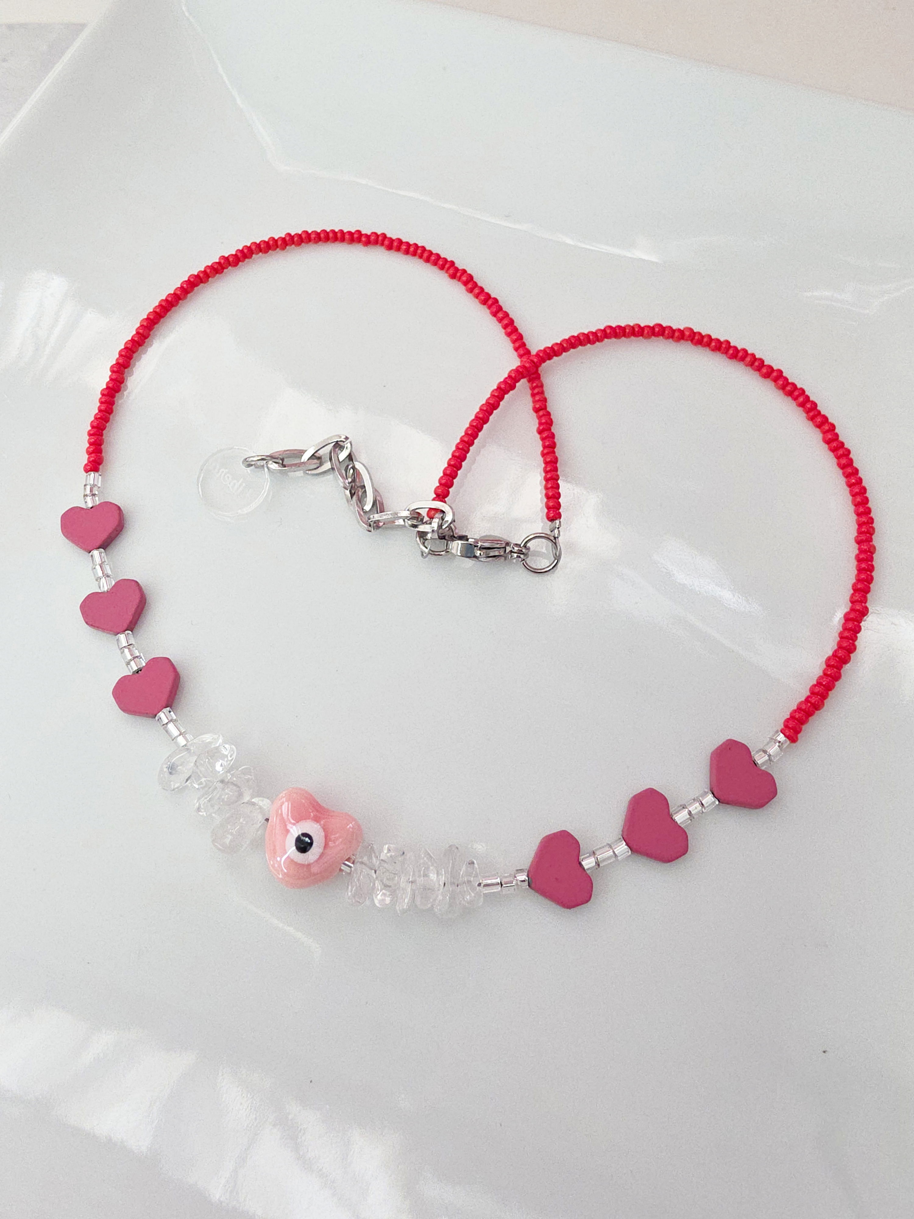Collar de aproximadamente 40 cm (más cadena de alargue) compuesto por mostacillas checas calibradas marca Preciosa, canutillos de la misma Marca, corazones de Hematite, Escallas de Cuarzo Cristal y dije central Corazón con Ojito de Cerámica.