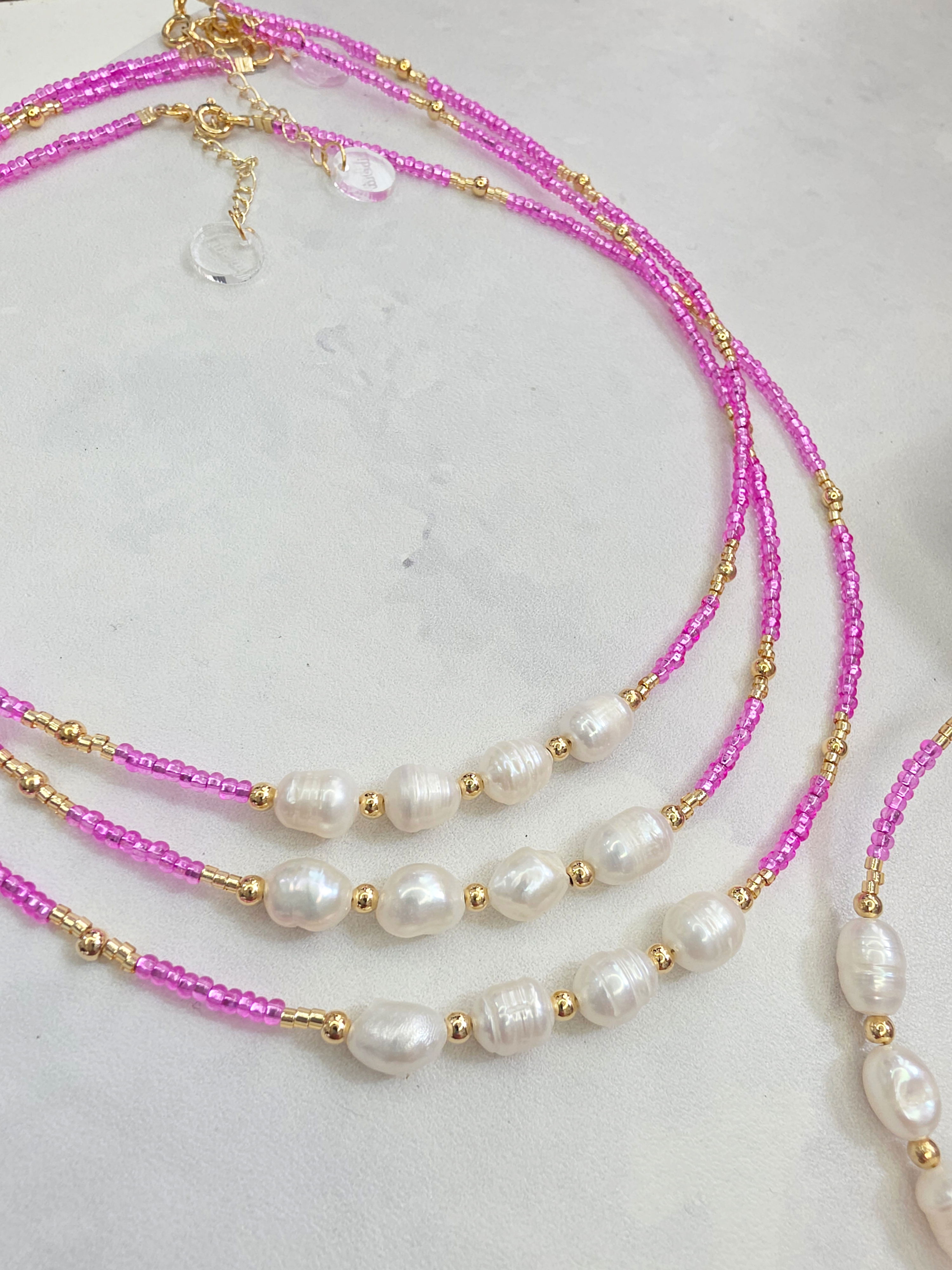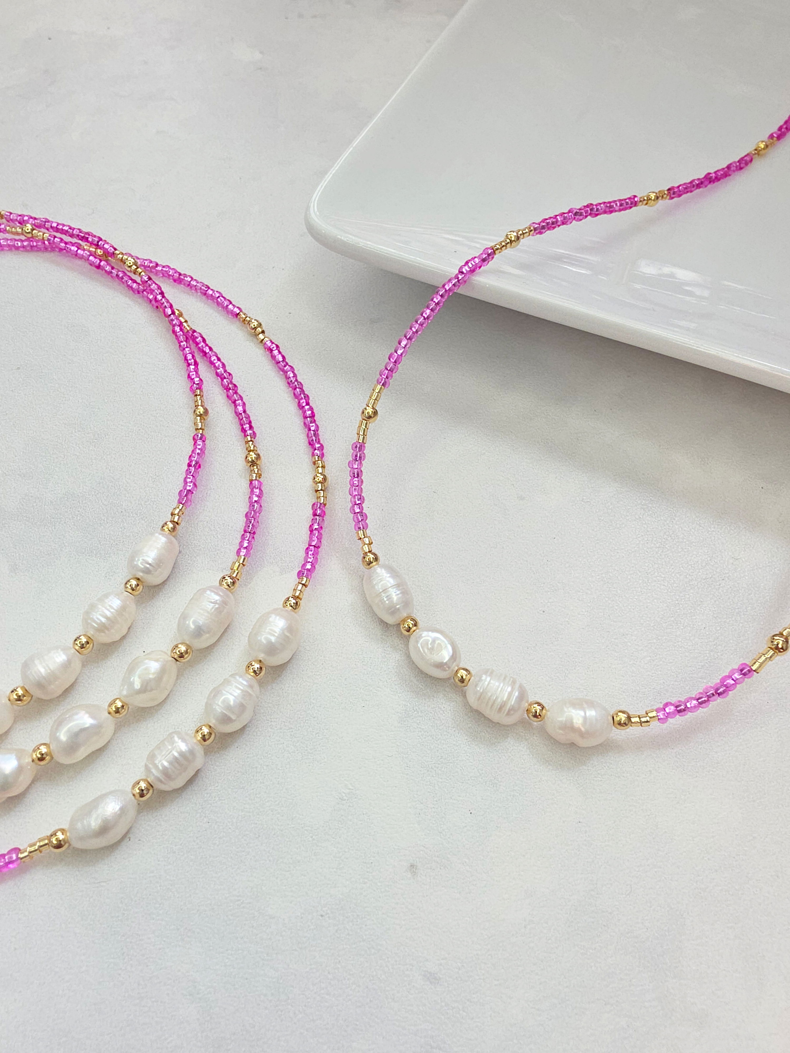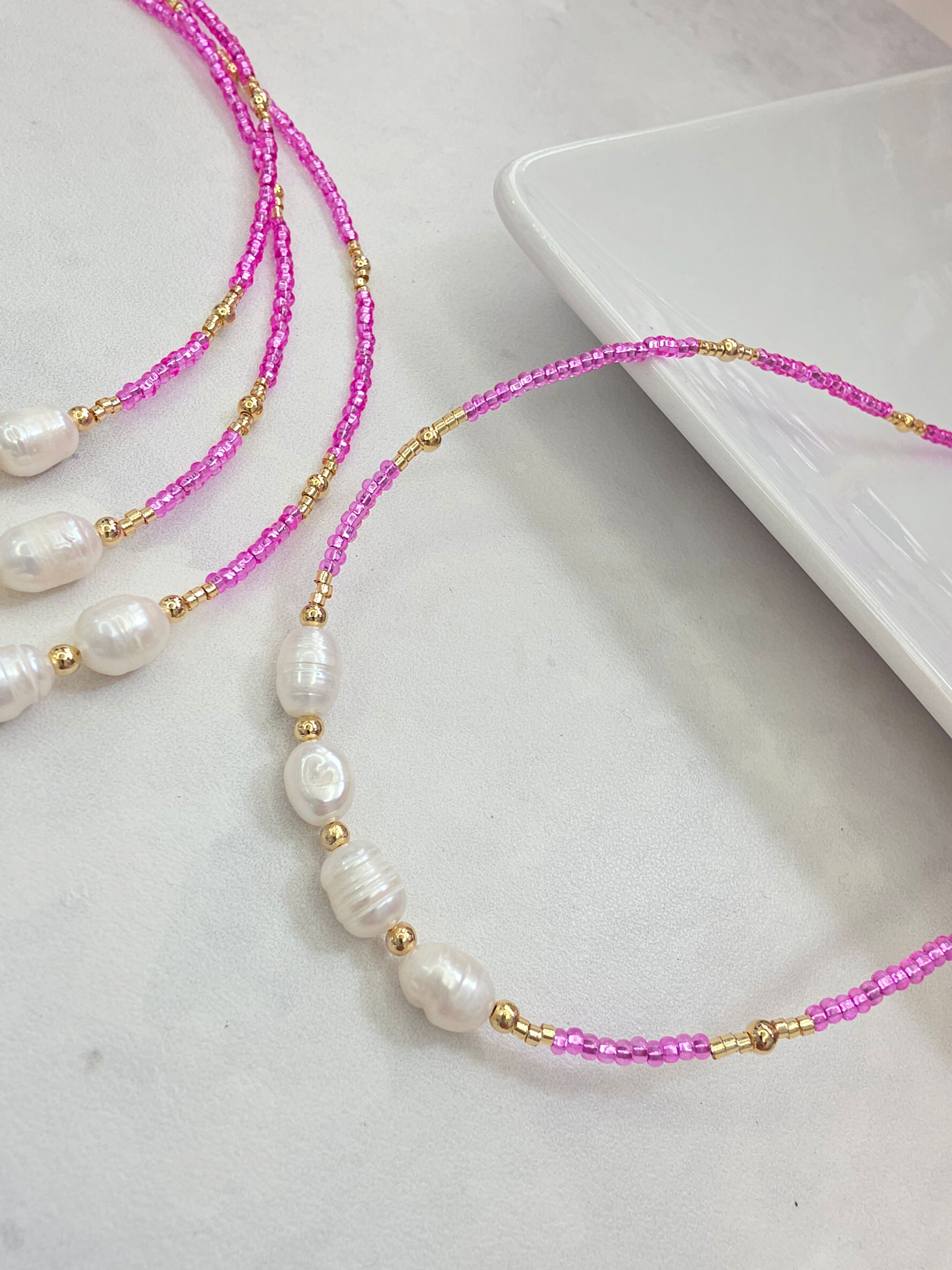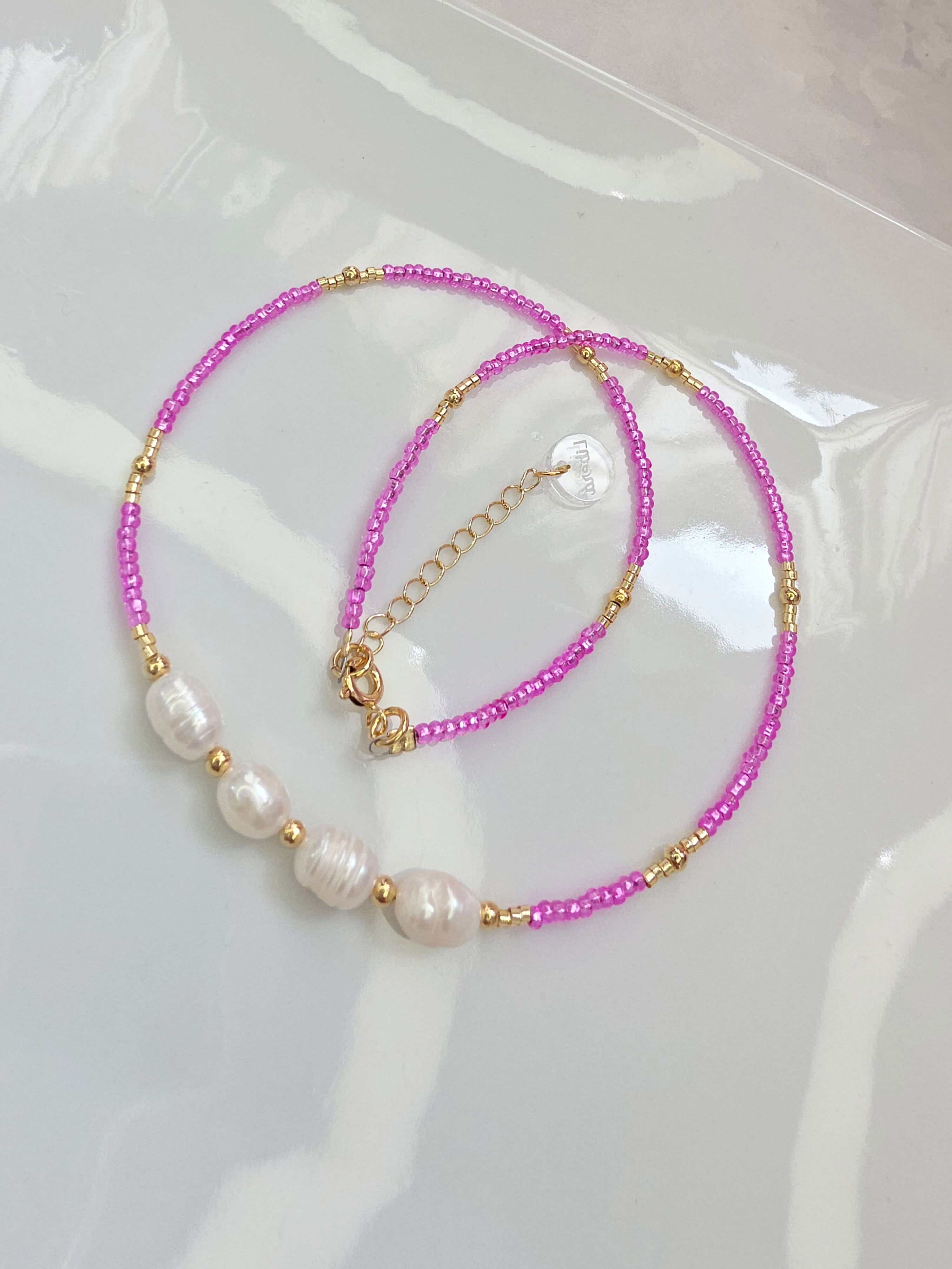 Collar de aproximadamente 40 cm más cadena de alargue. Compuesto por mostacillas checas calibradas marca Preciosa, bolitas laminadas en oro, delicas mikuyis y Perlas de Río Cultivadas.