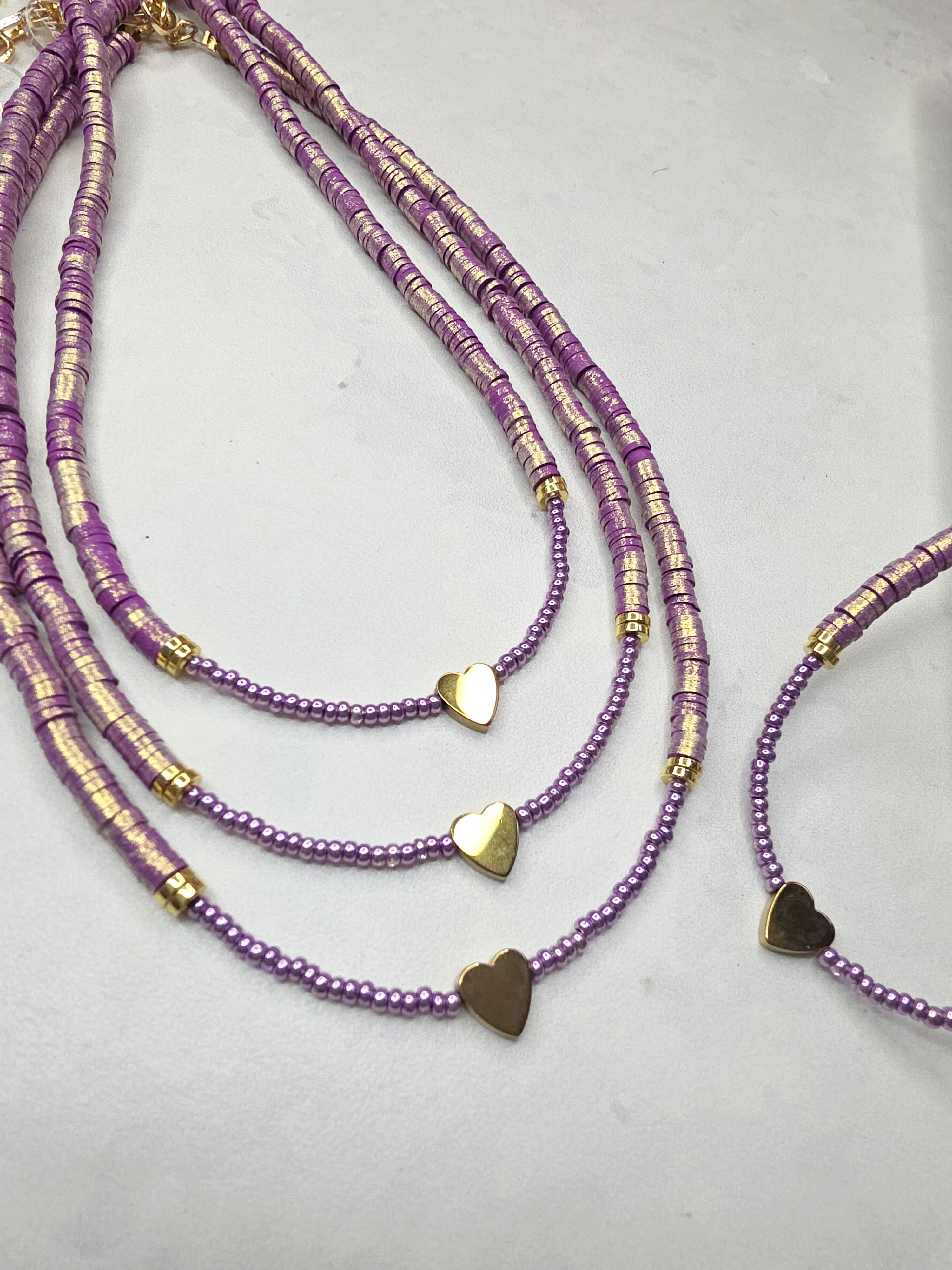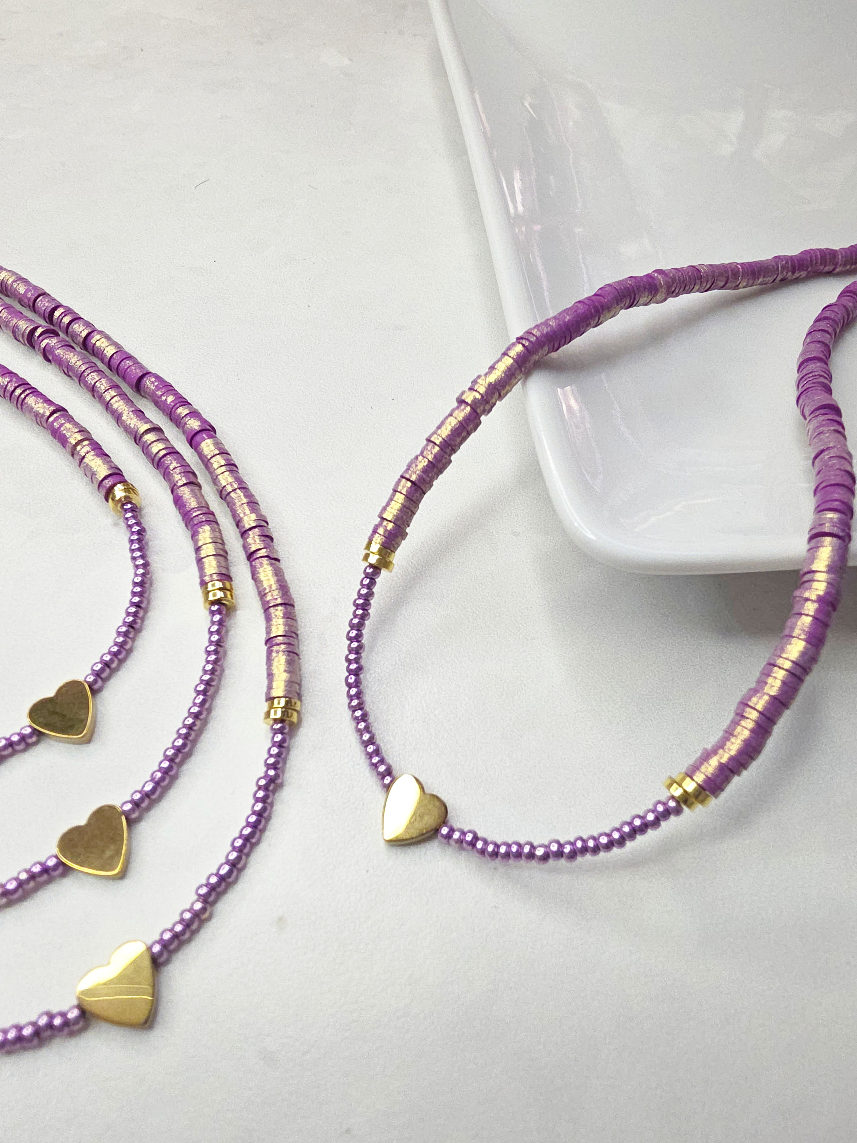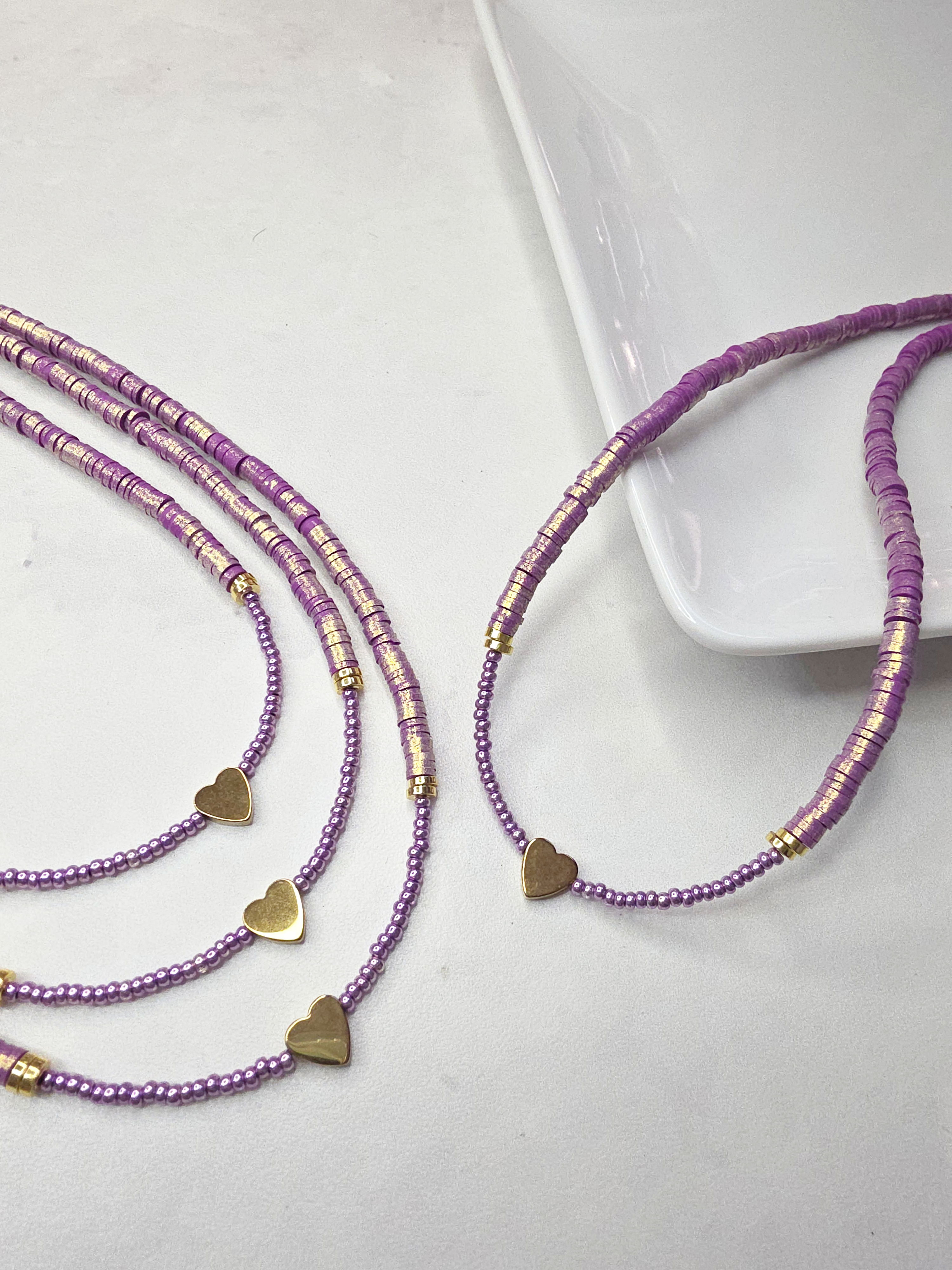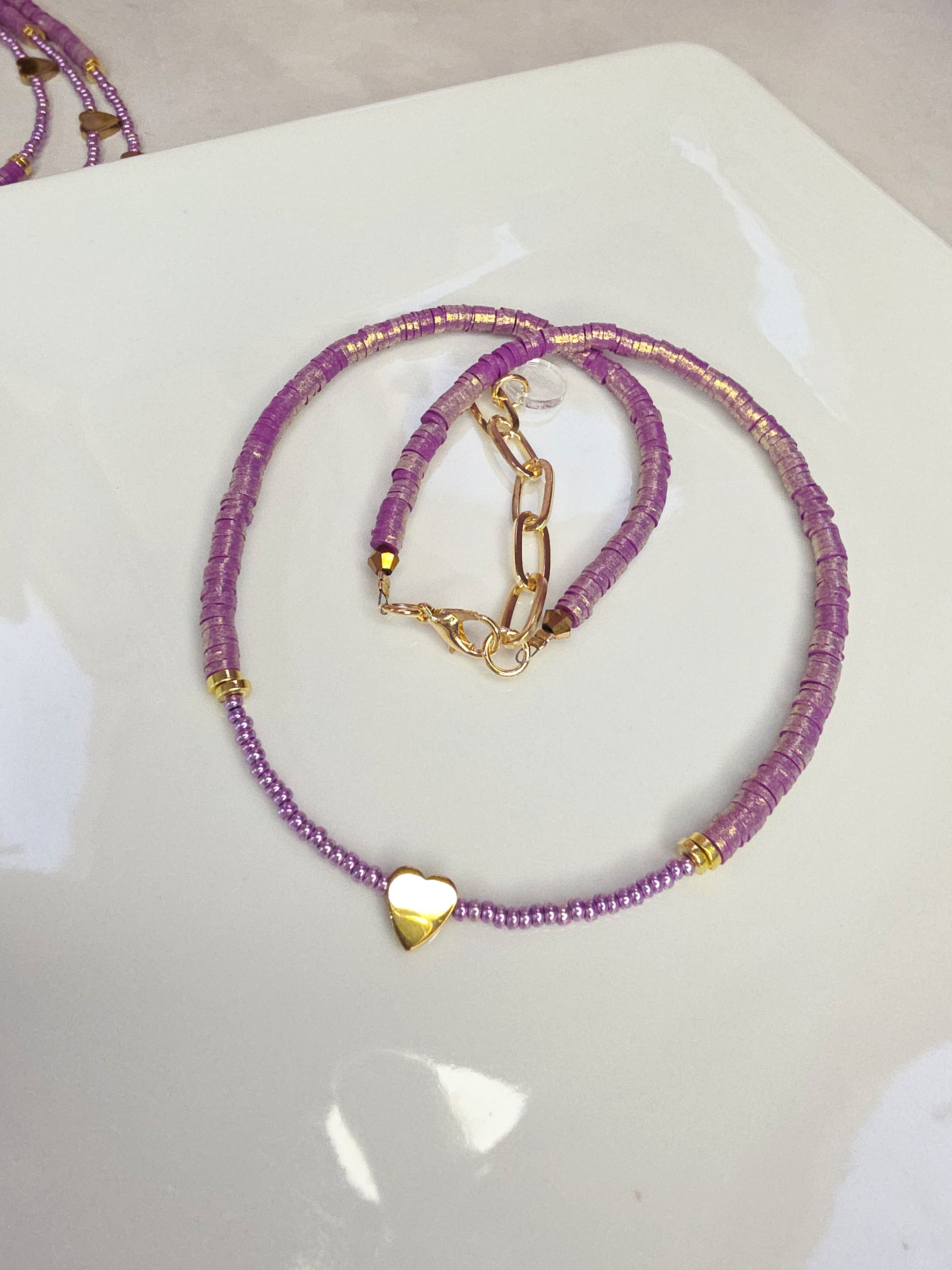 Collar de aproximadamente 40 cm (más cadena de alargue) compuesto por arandelitas de fimo (arcilla polimerica) perladas, donitas de Hematite, mostacillas Checas calibradas marca Preciosa y corazón de Hematite Dorado.