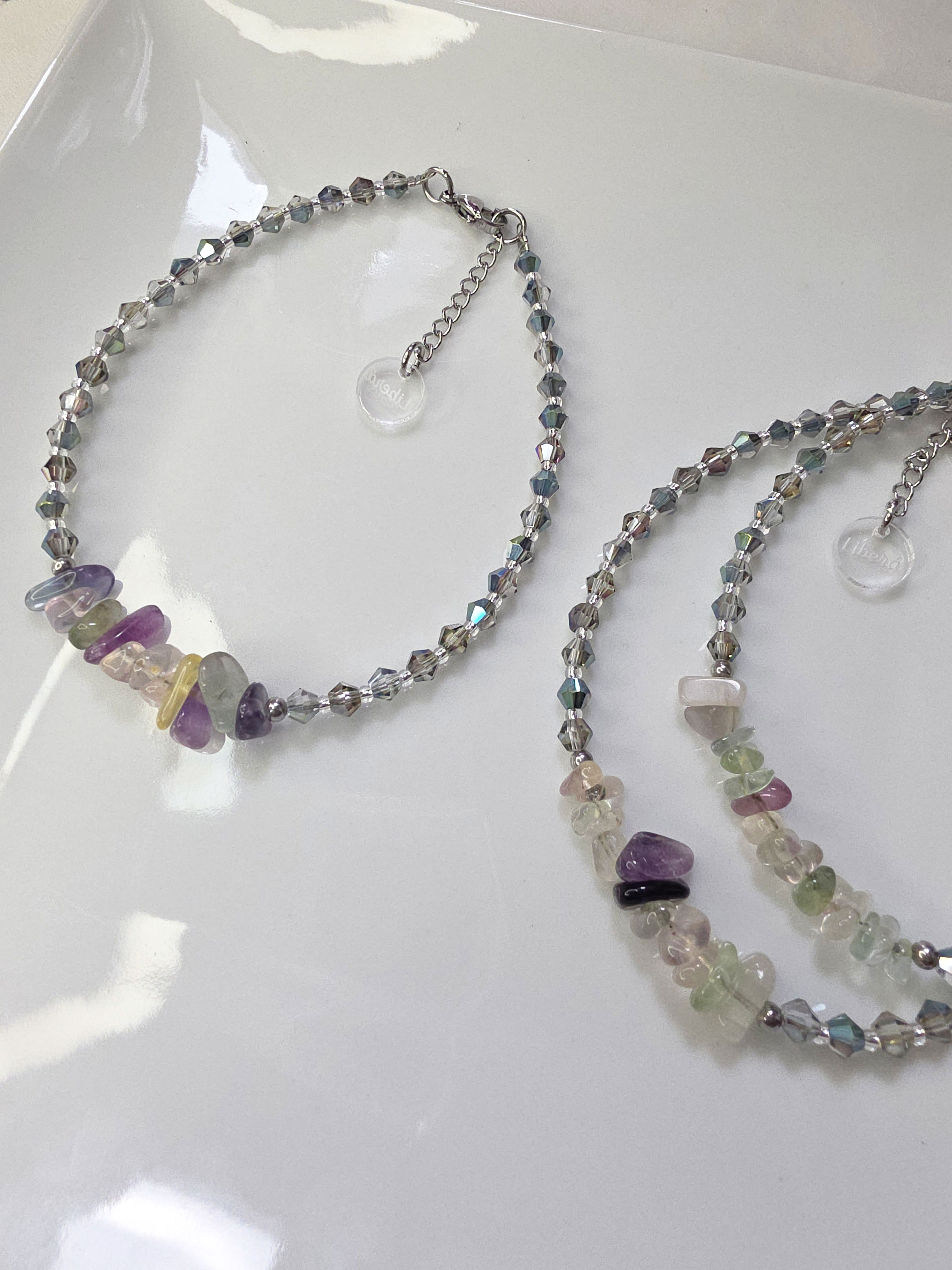 Tobillera compuesta de cristales, mostacillas Checas calibradas marca Preciosa, bolitas de Acero Quirúrgico y Piedras Naturales Fluorita.