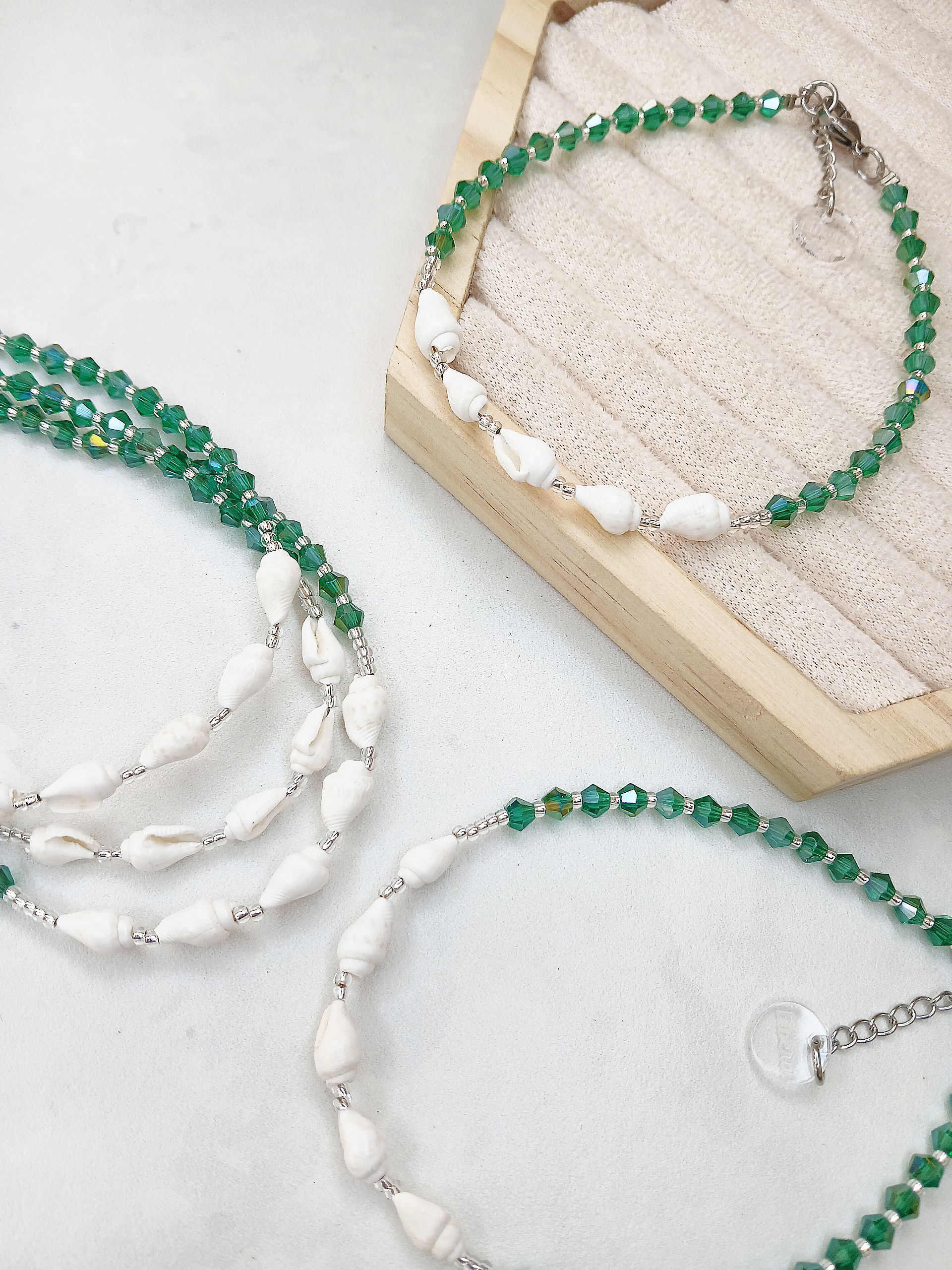 Tobillera compuesta de cristales, mostacillas checas calibradas marca Preciosa y caracolitos naturales.