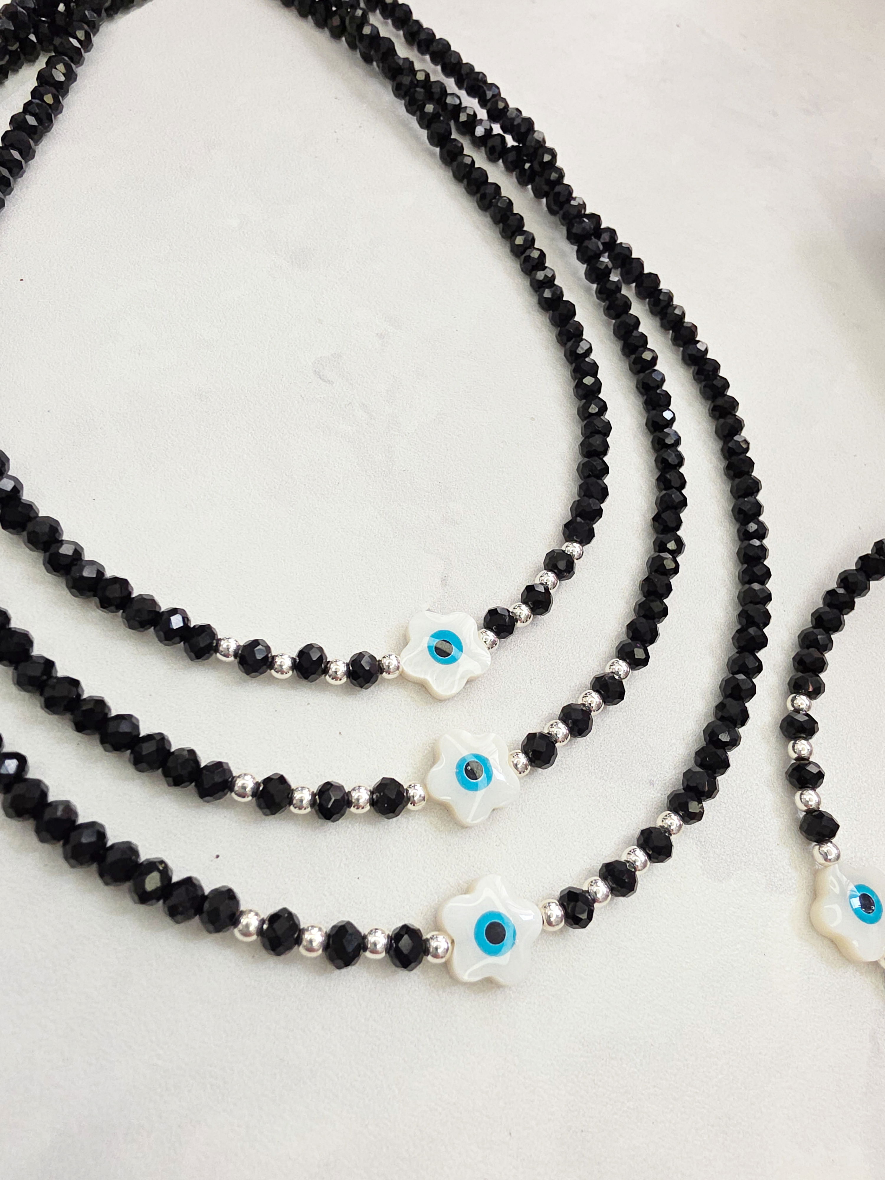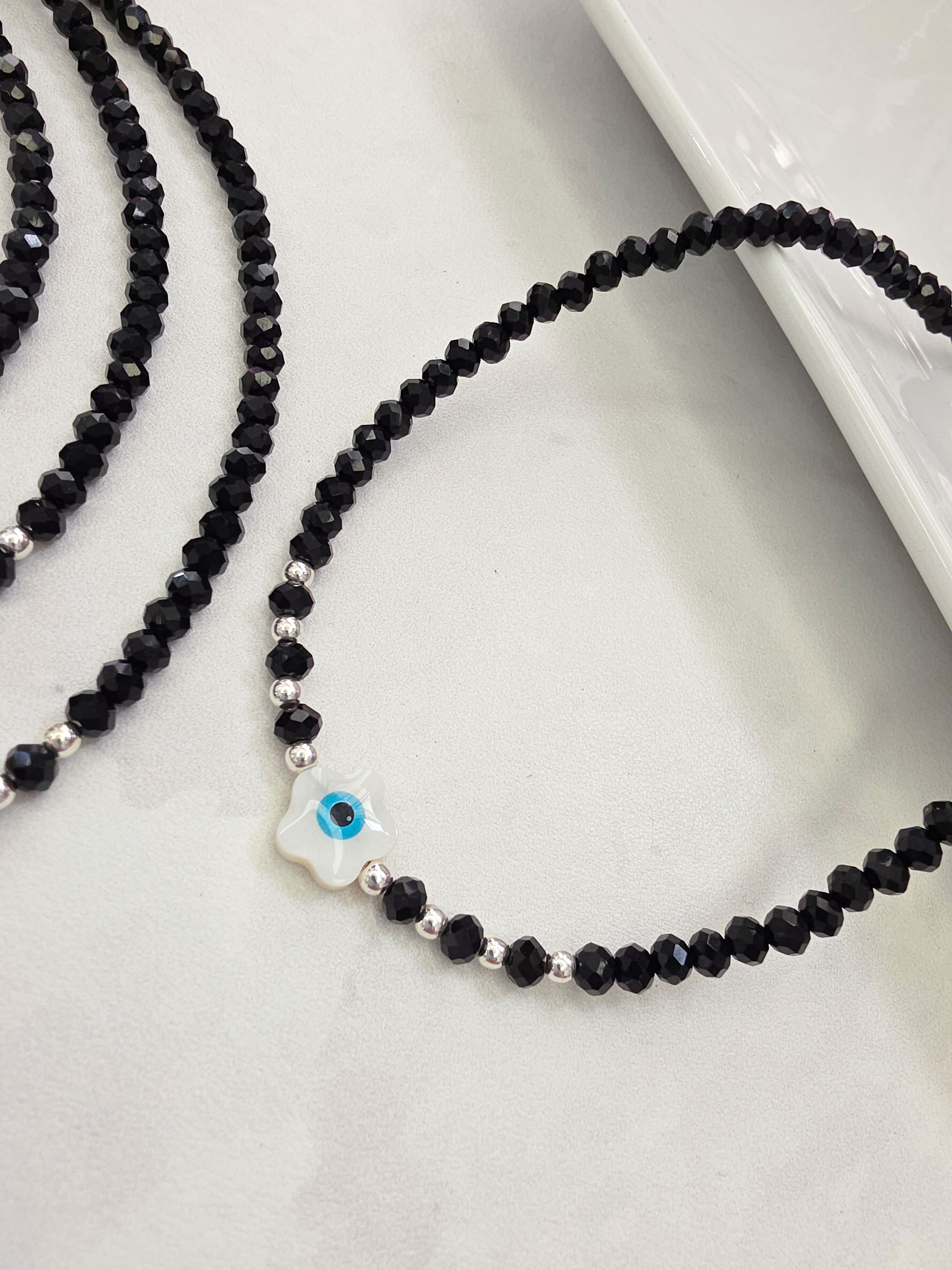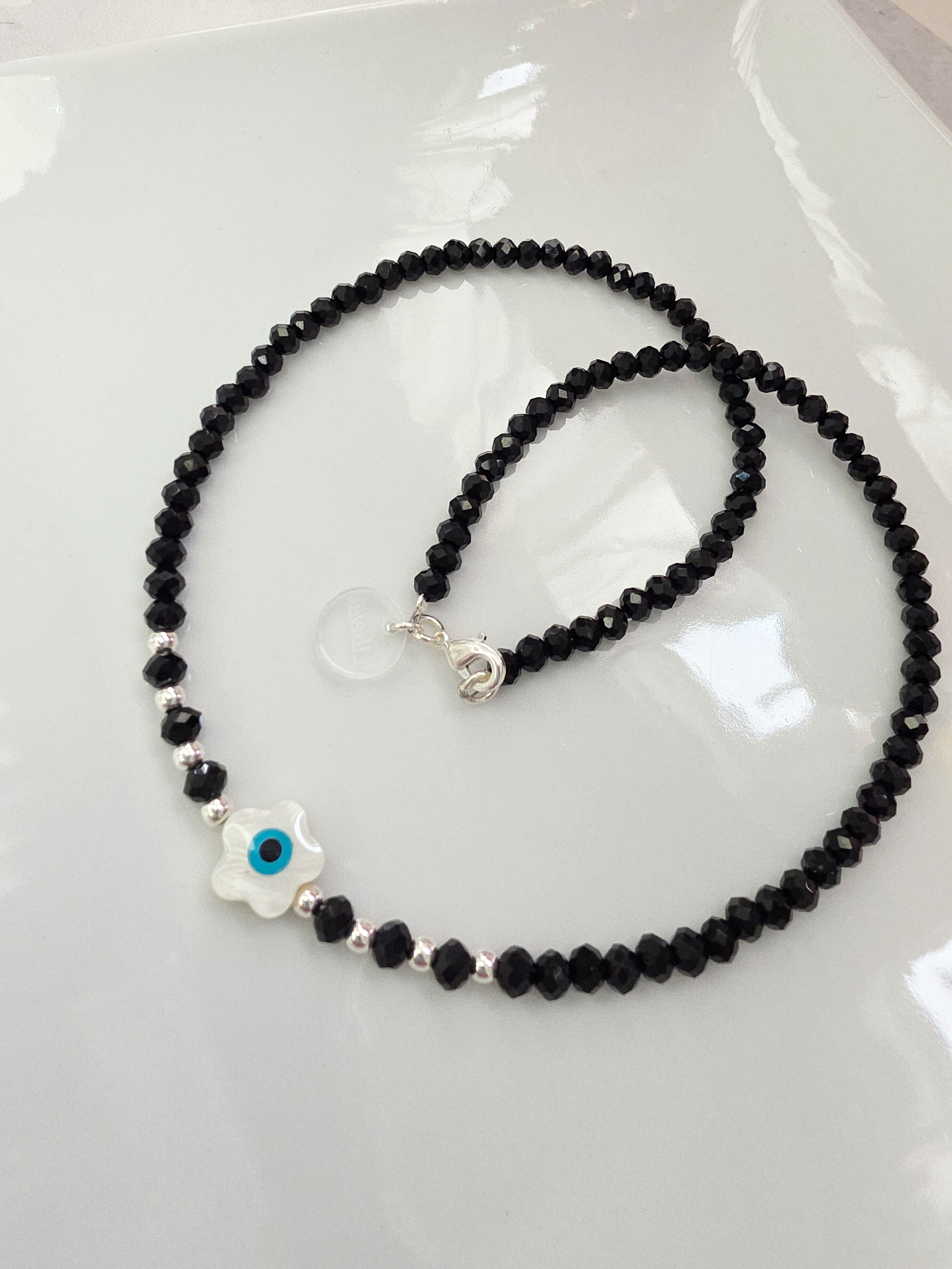 Collar de aproximadamente 40 cm compuesto por donas de cristal, bolitas de Plata 925 y flor de Nácar.