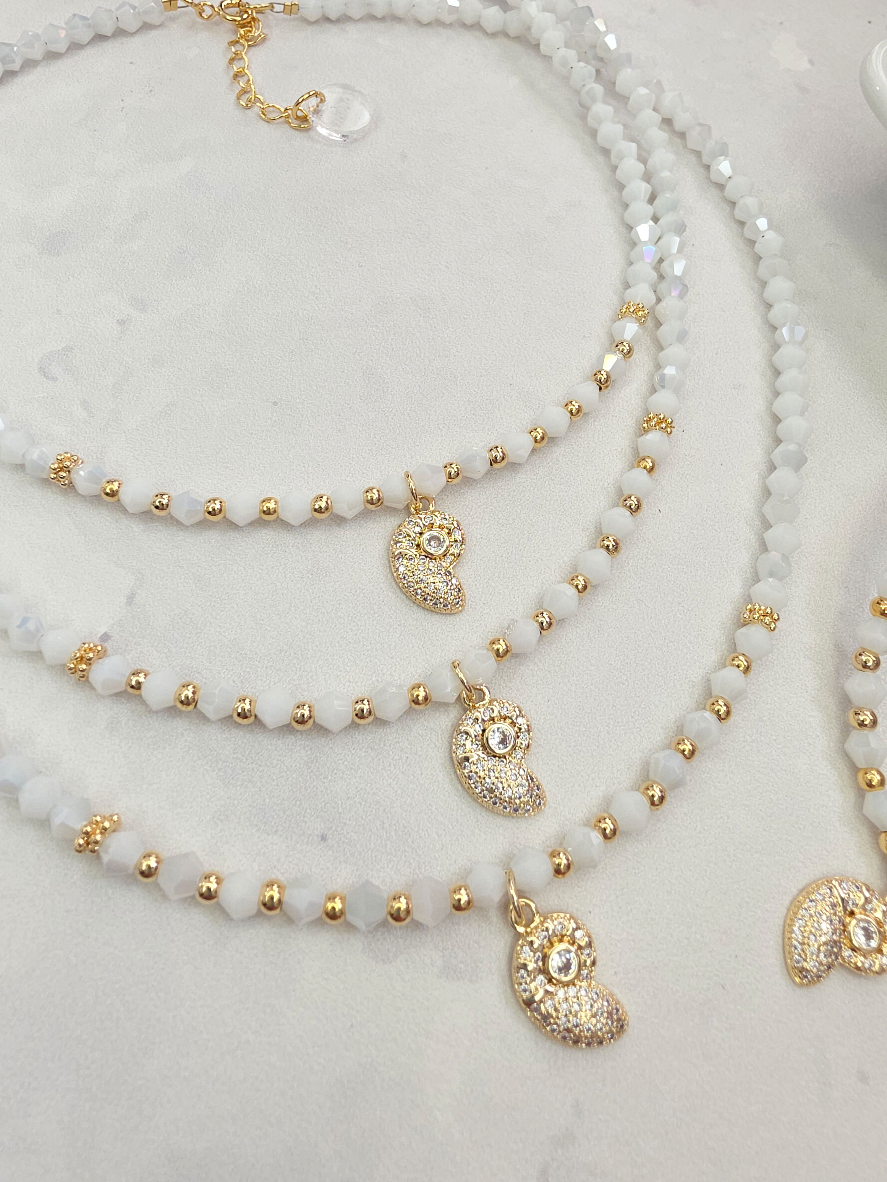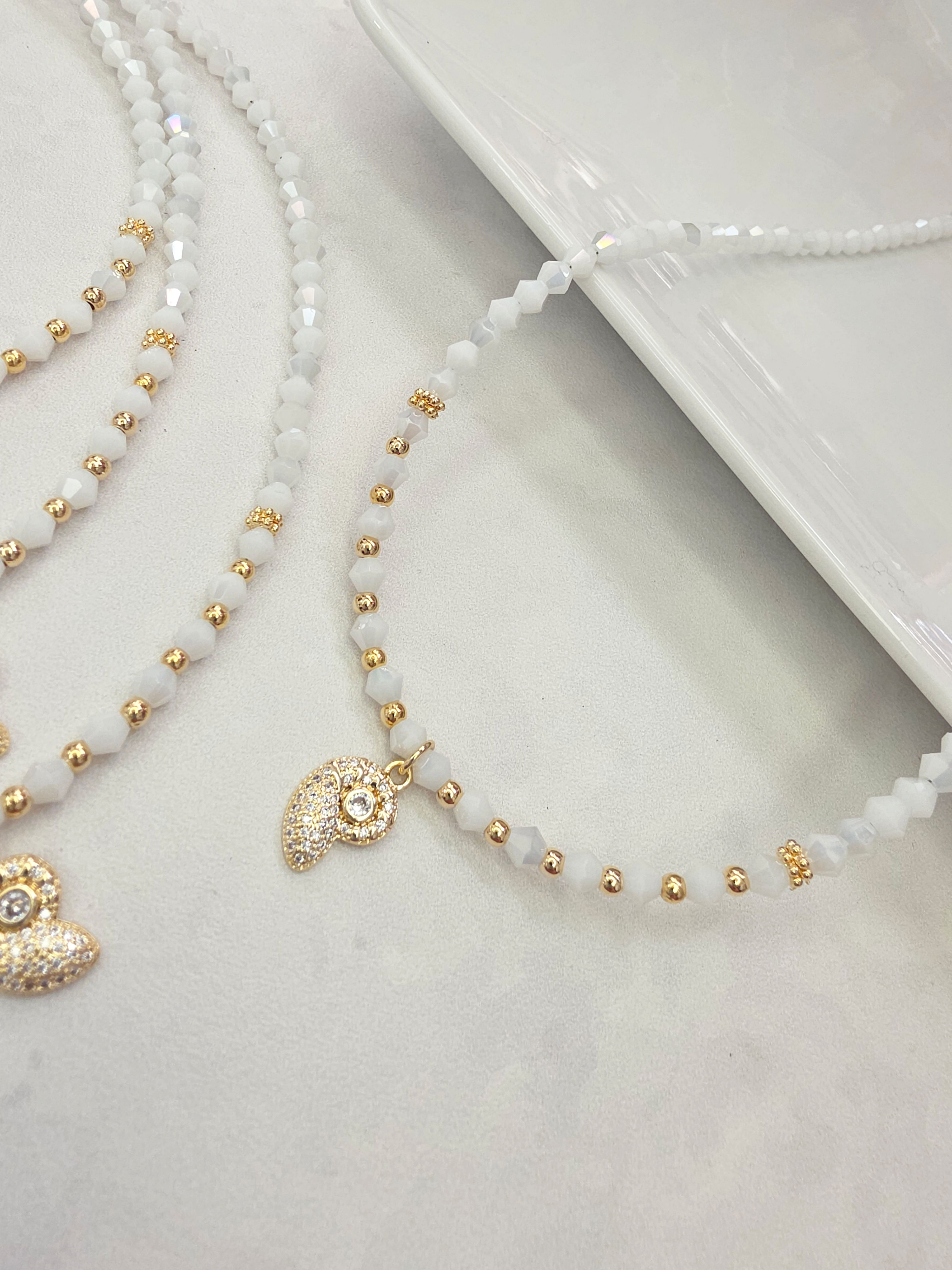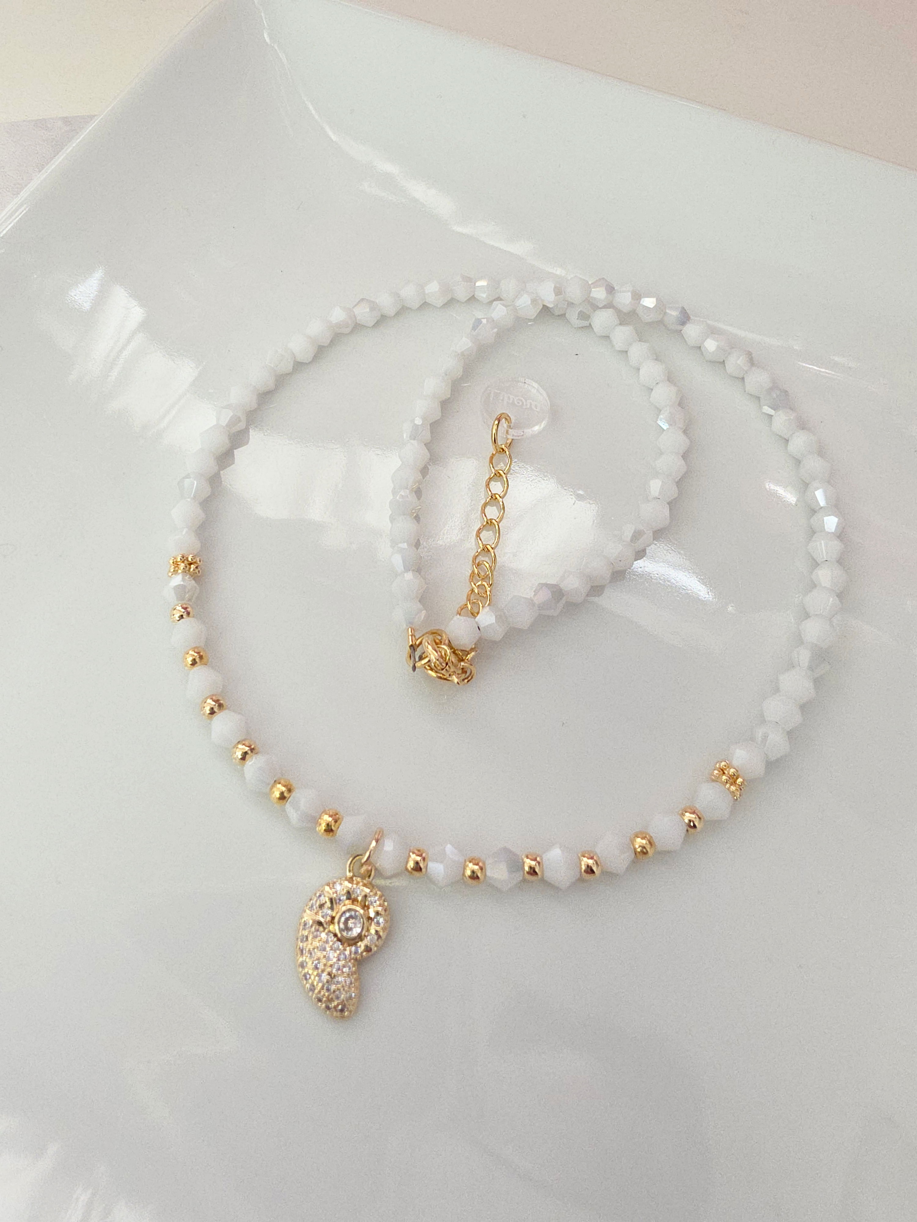 Collar de aproximadamente 40 cm más cadena de alargue. Compuesto por Cristales y dije Laminado en Oro 18k con Microzirconias y Cubic. Detalles, cierre y cadena de Oro Laminado 18k.