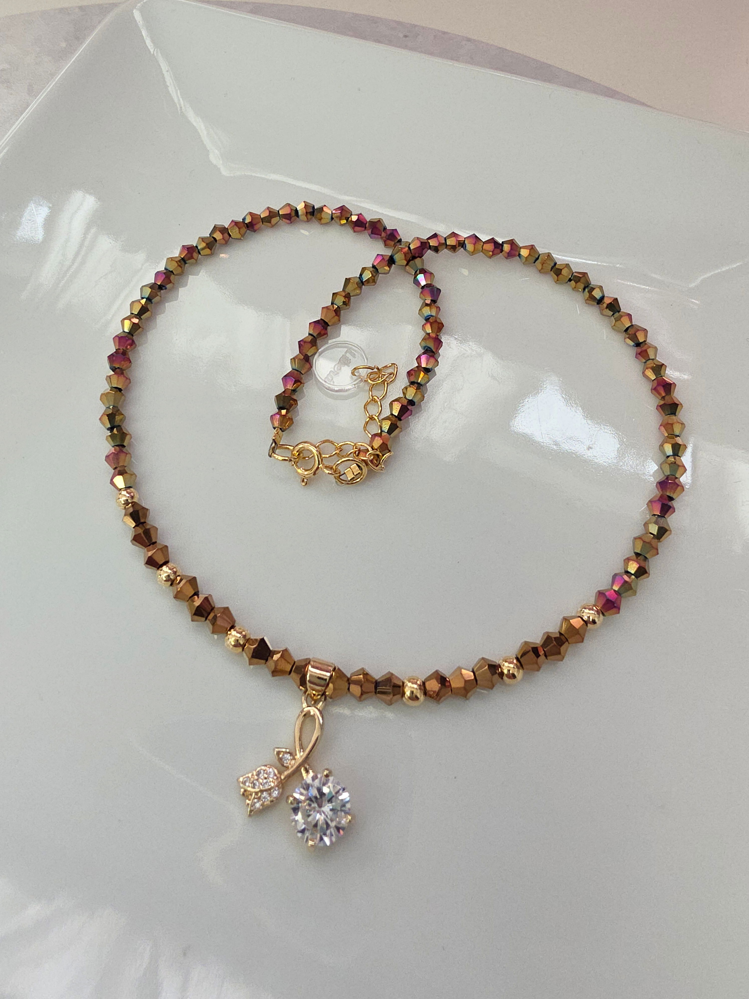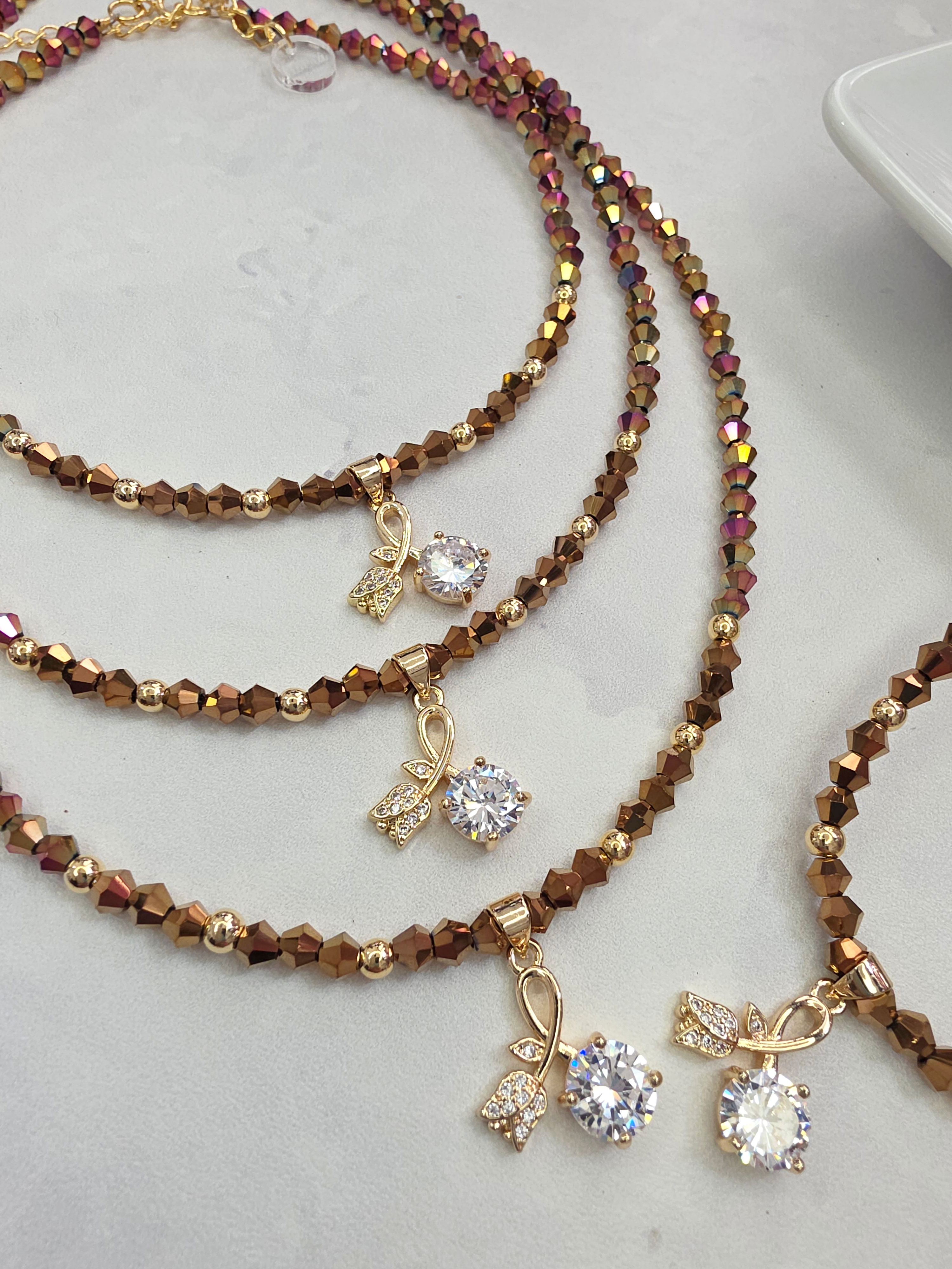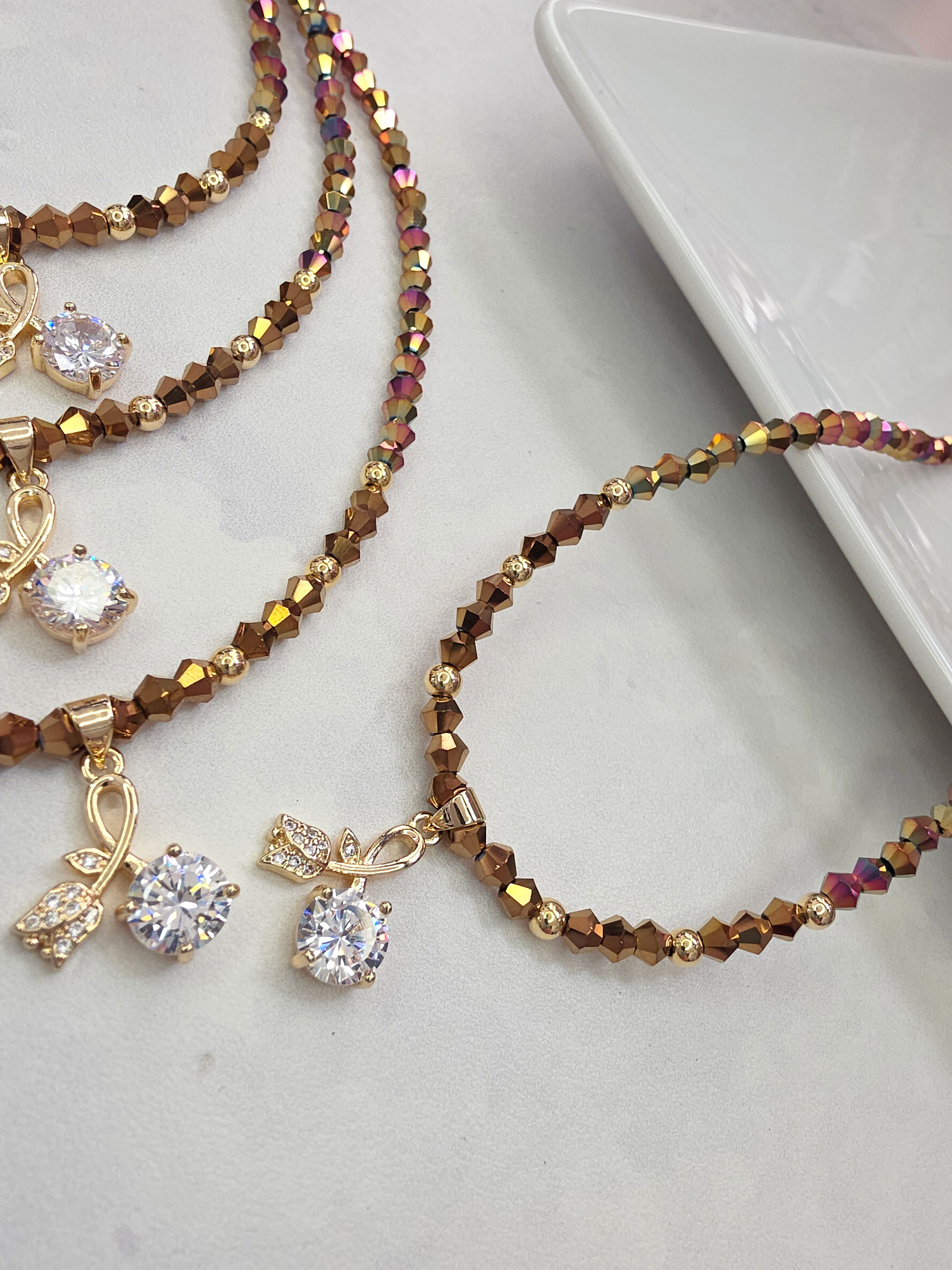 Collar de aproximadamente 40 cm más cadena de alargue. Compuesto por Cristales y dije Laminado en Oro 18k con Microzirconias y Cubic. Detalles, cierre y cadena de Oro Laminado 18k.