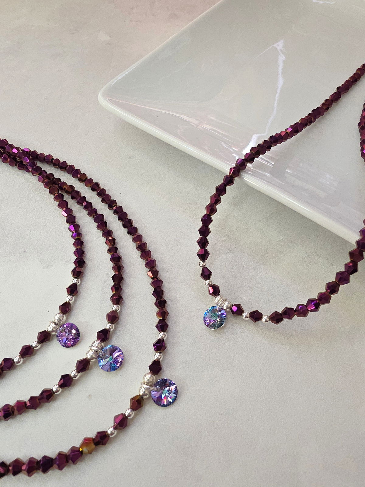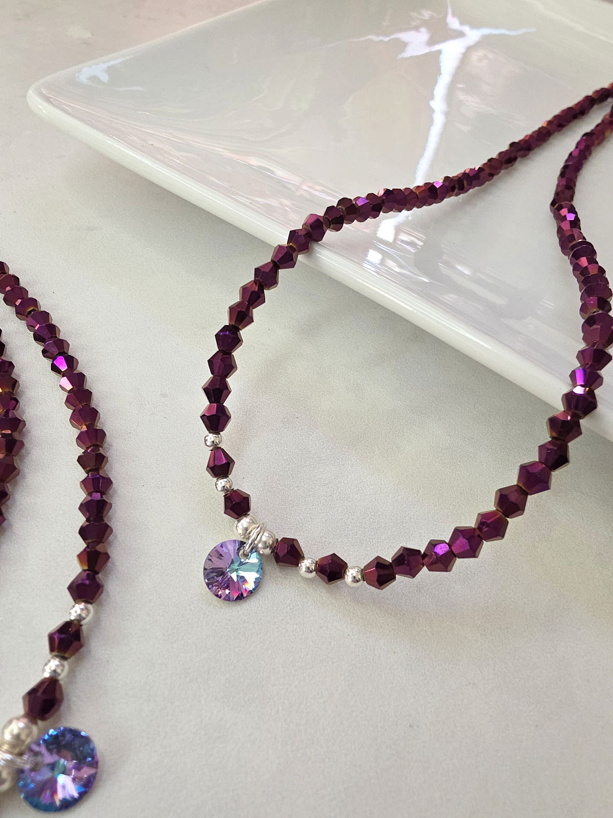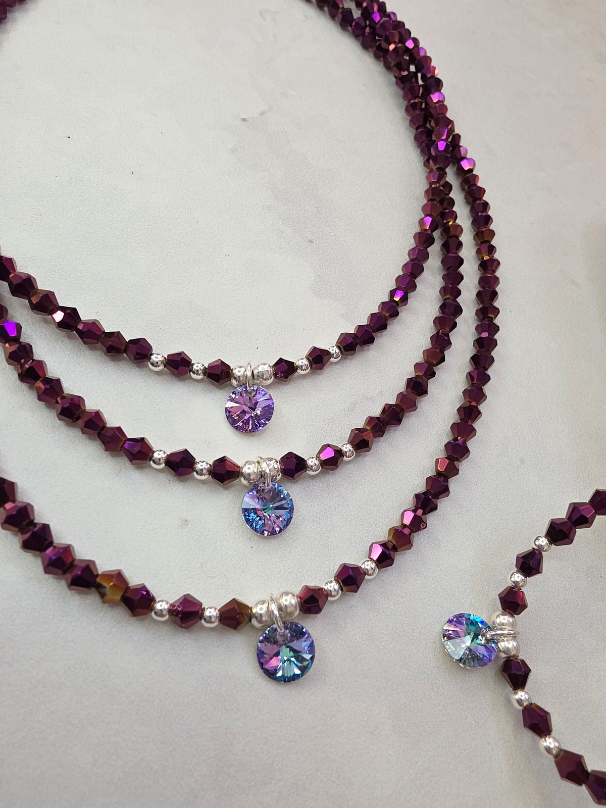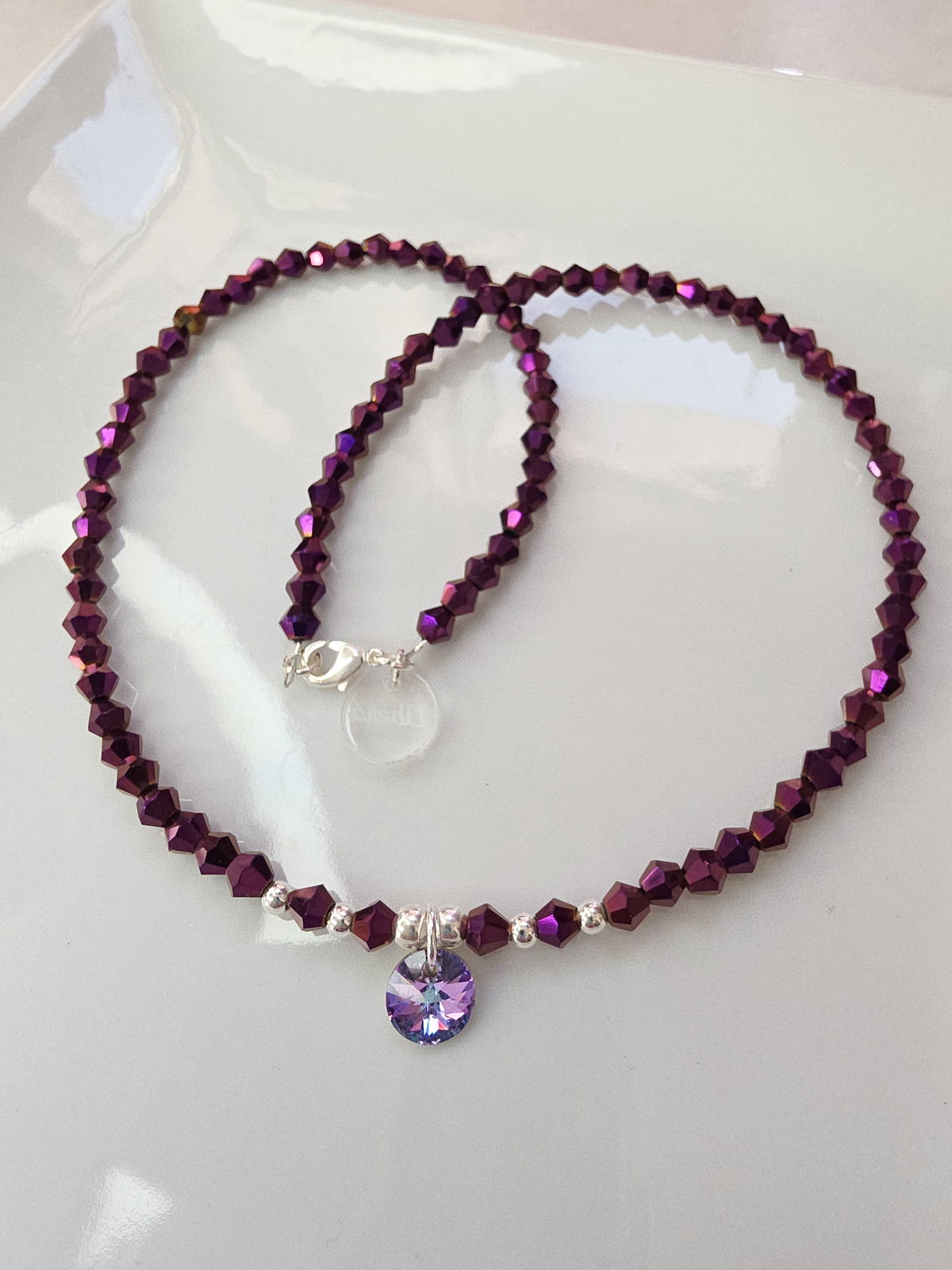 Collar de aproximadamente 40 cm. Compuesto por cristales cónicos, bolitas de Plata 925 y dije Rivoli Swarovski Vitral Light (Genuino, origen Austria).