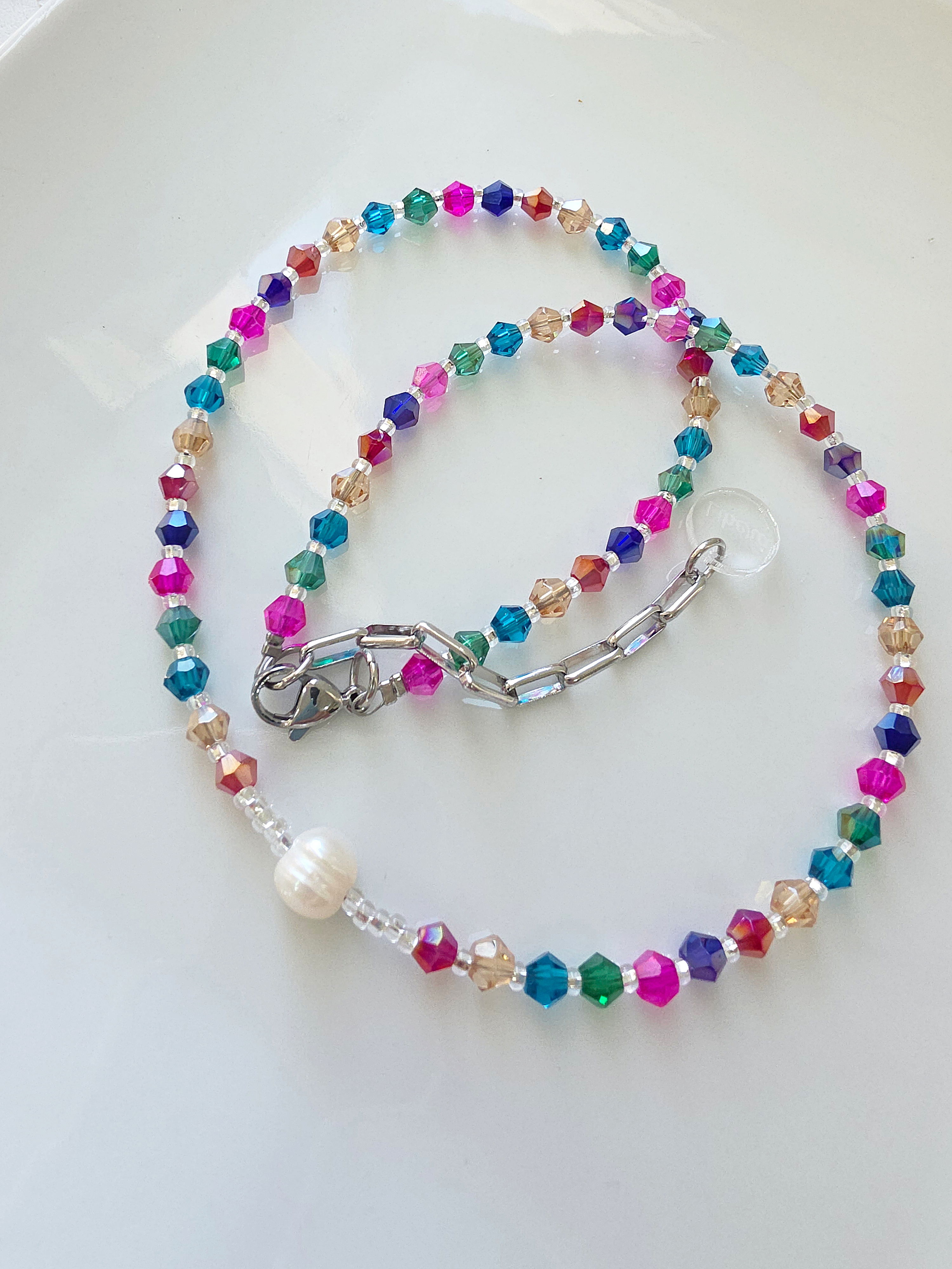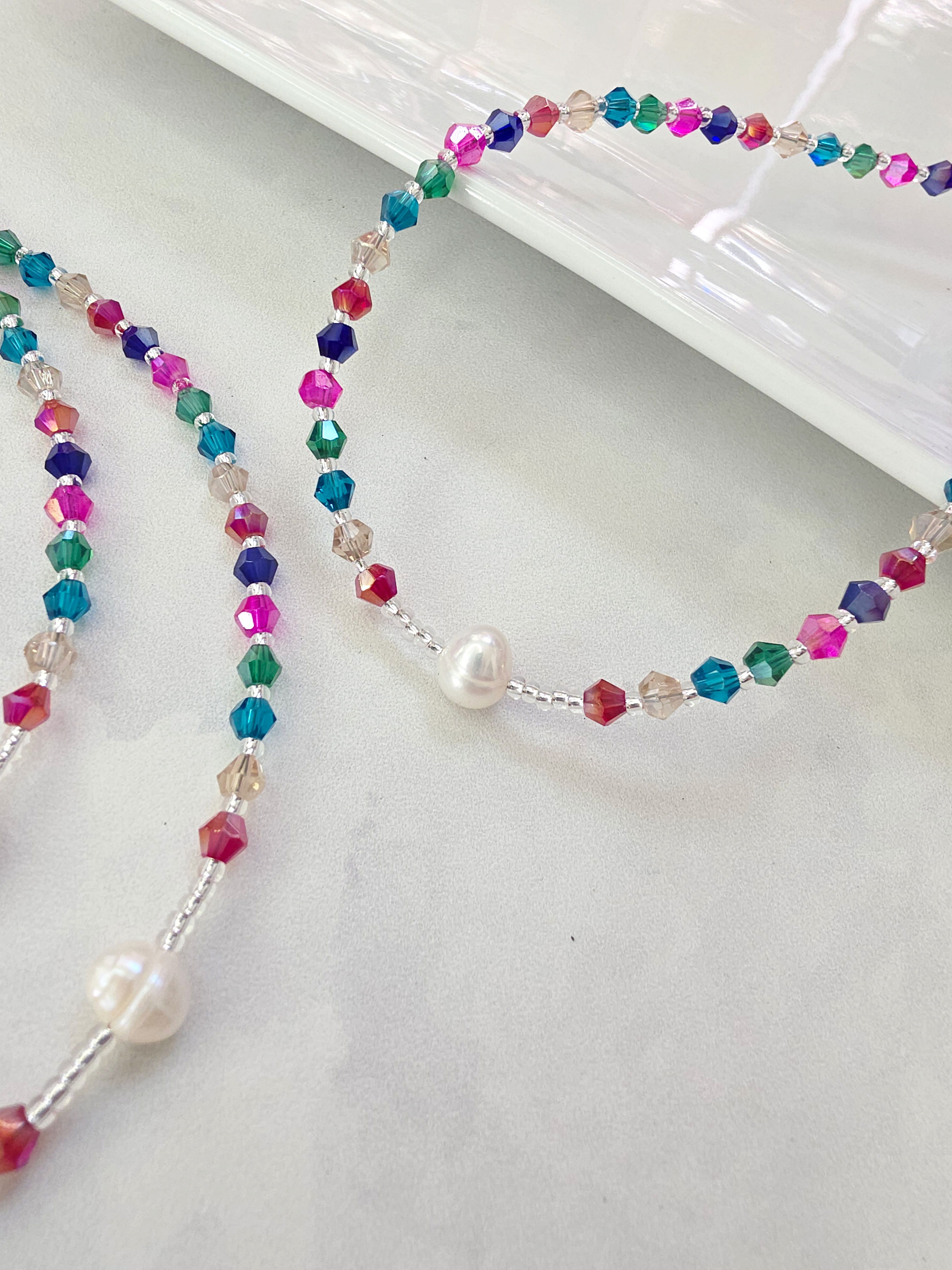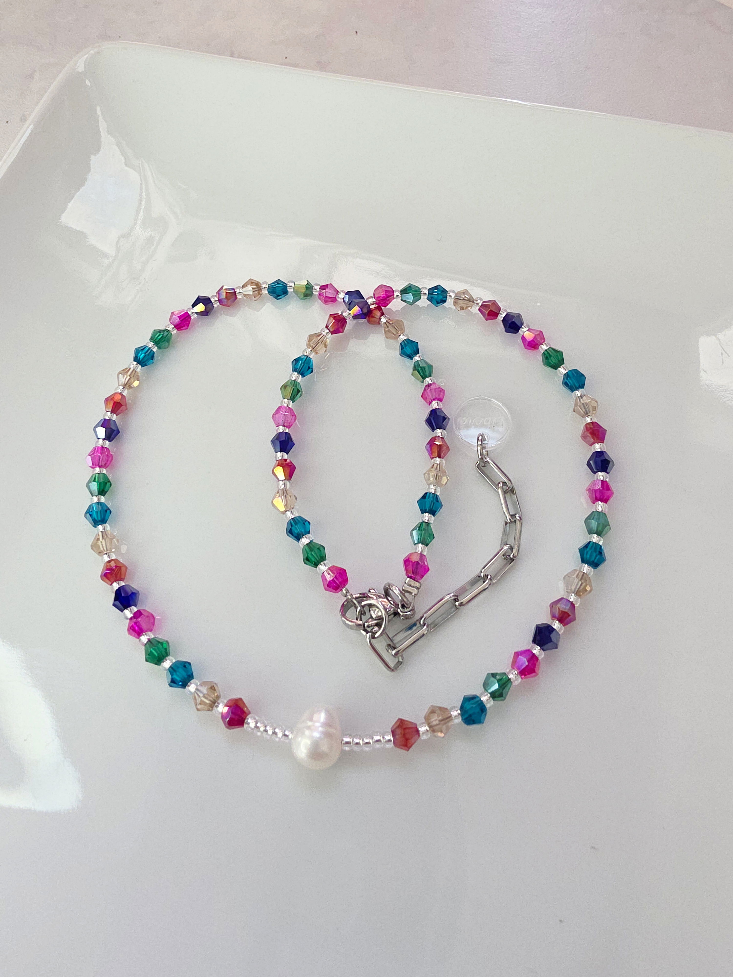 Collar de aproximadamente 40 cm (más cadena de alargue) compuesto por cristales cónicos, mostacillas Checas calibradas marca Preciosa (vidrio) y Perla de Rio Cultivada.