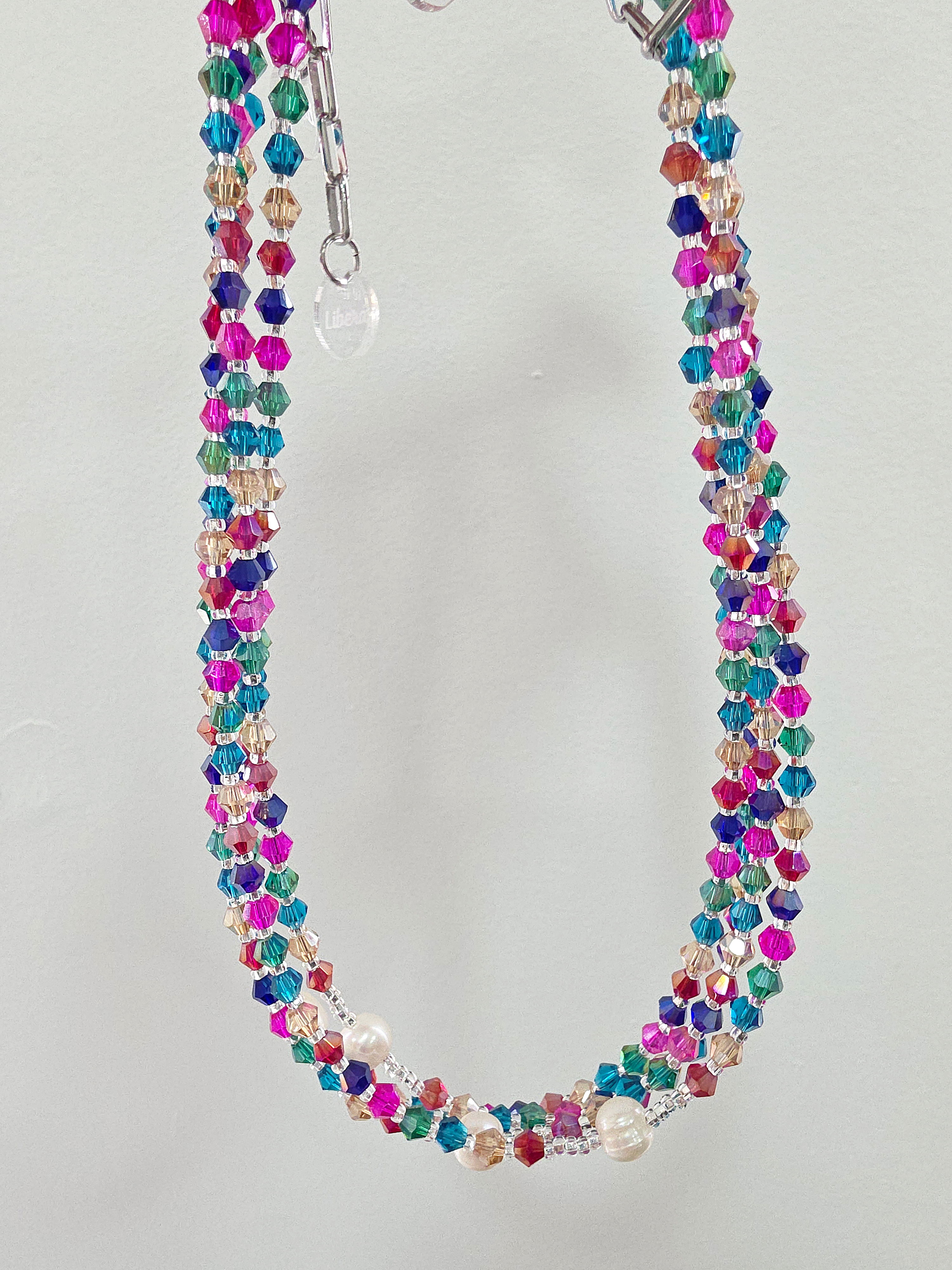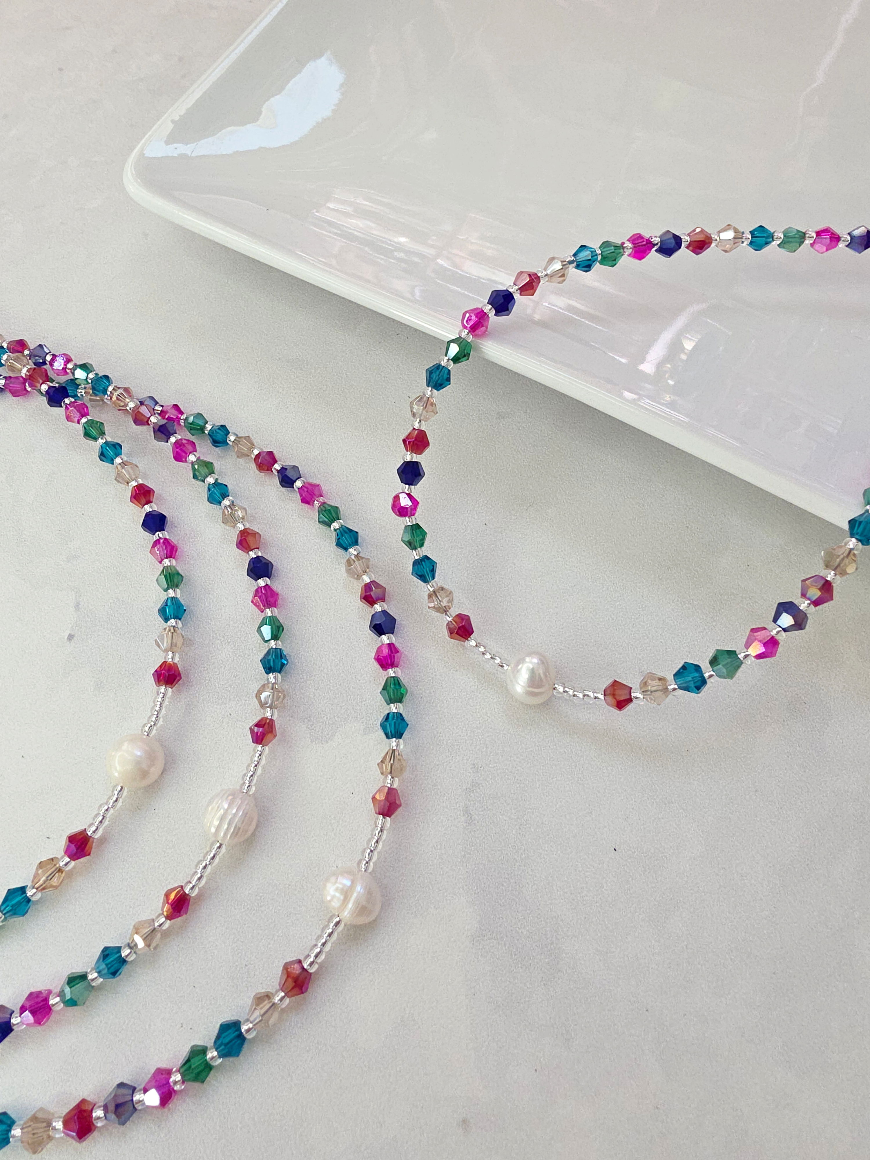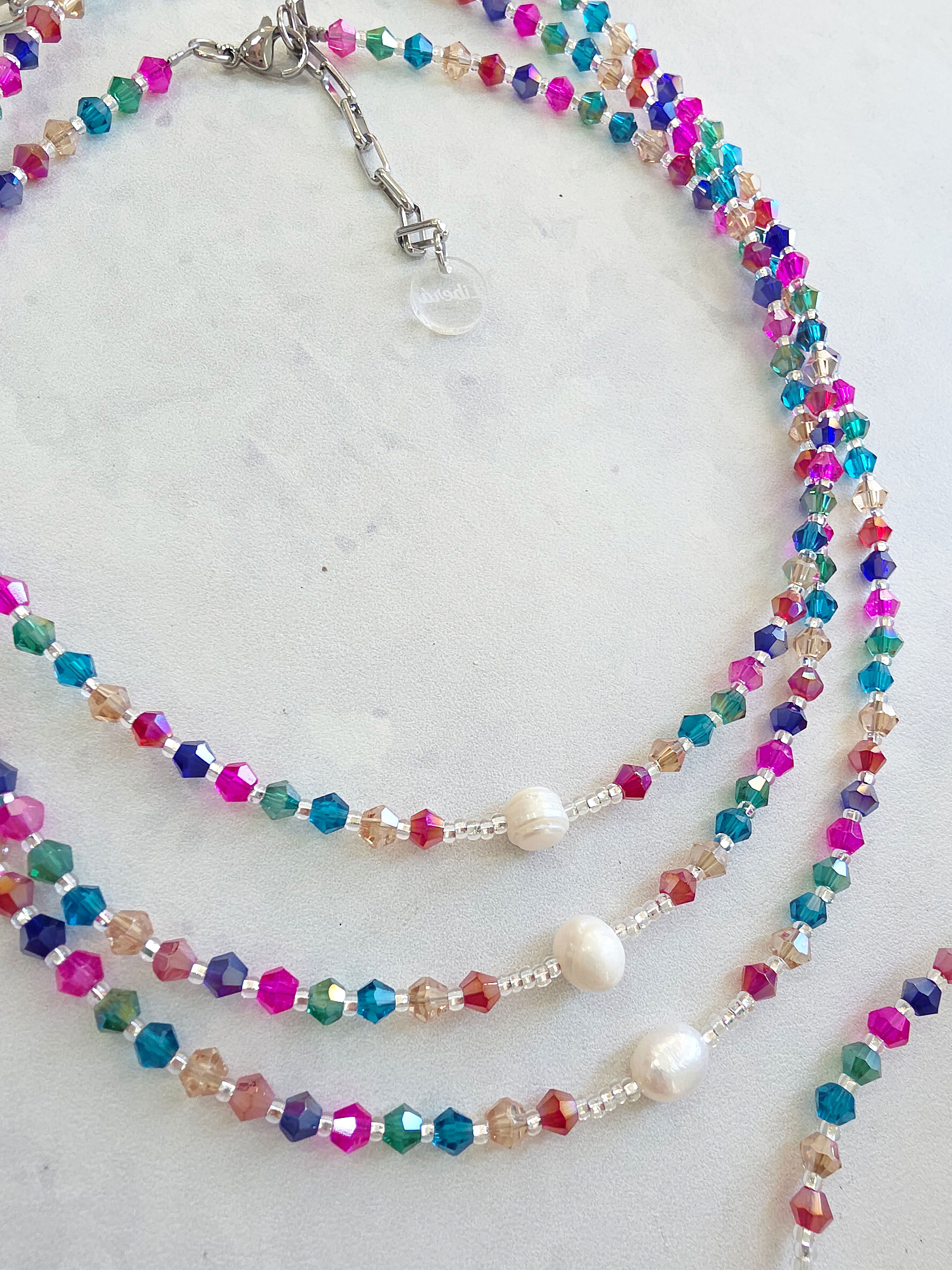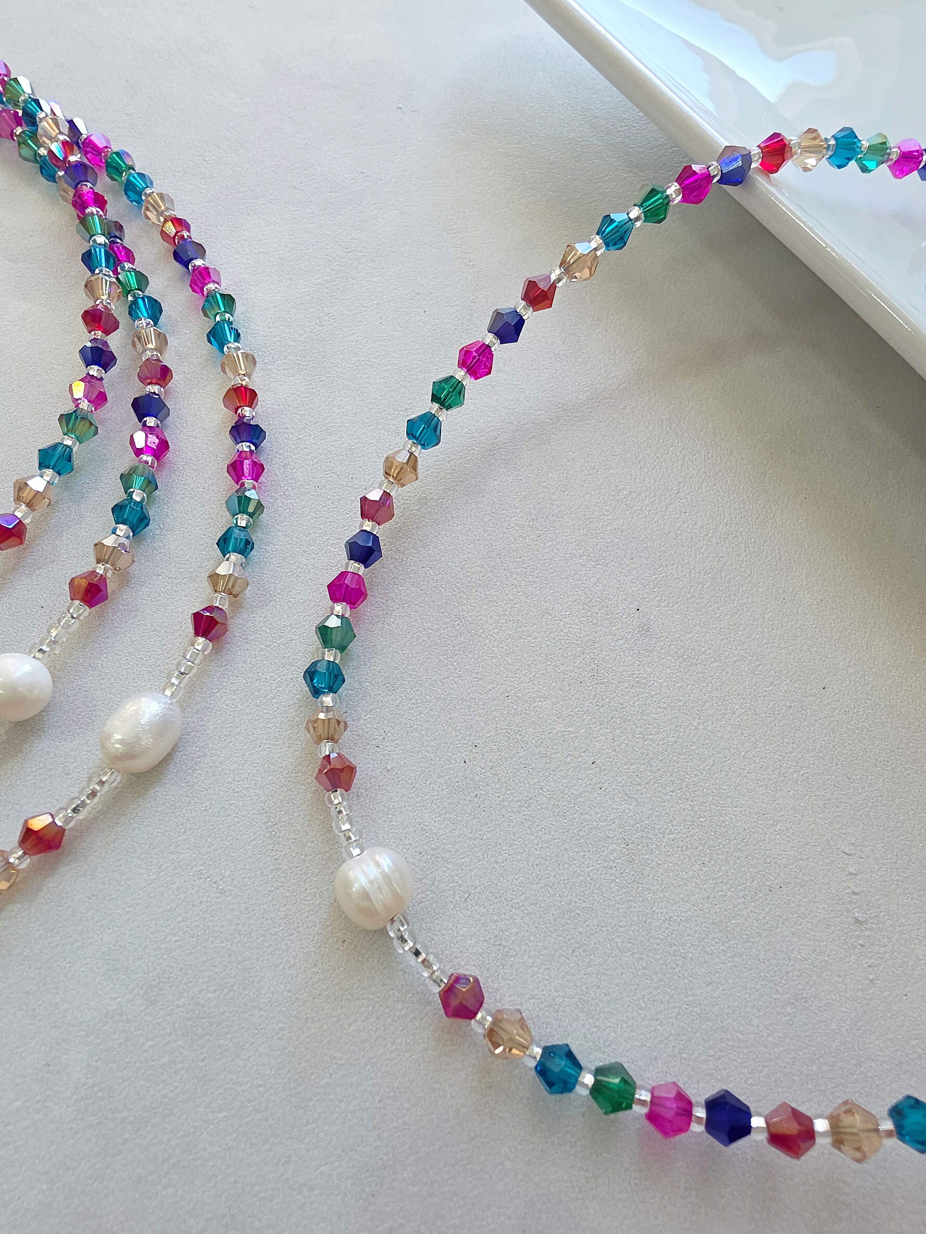 Collar de aproximadamente 40 cm (más cadena de alargue) compuesto por cristales cónicos, mostacillas Checas calibradas marca Preciosa (vidrio) y Perla de Rio Cultivada.