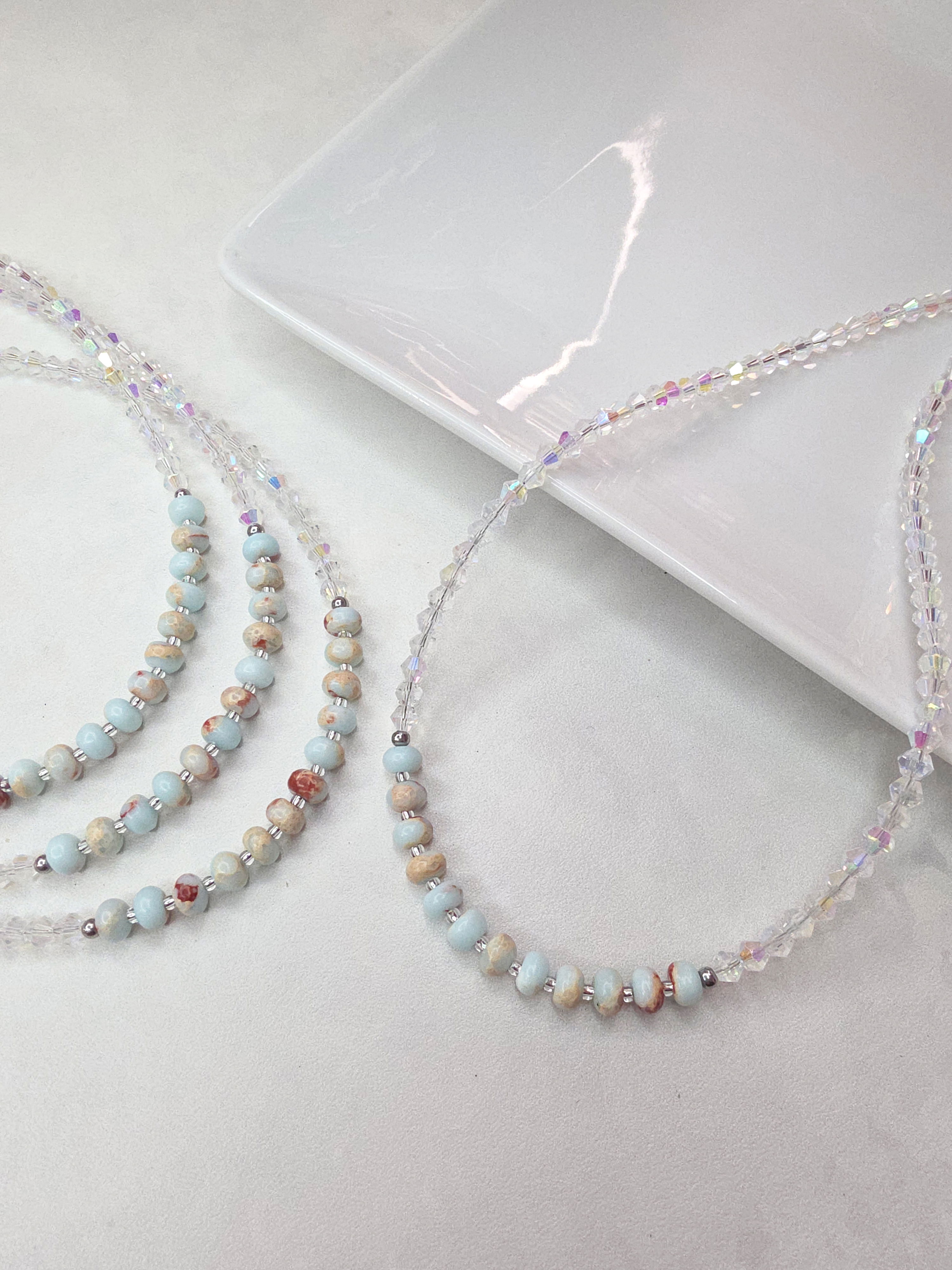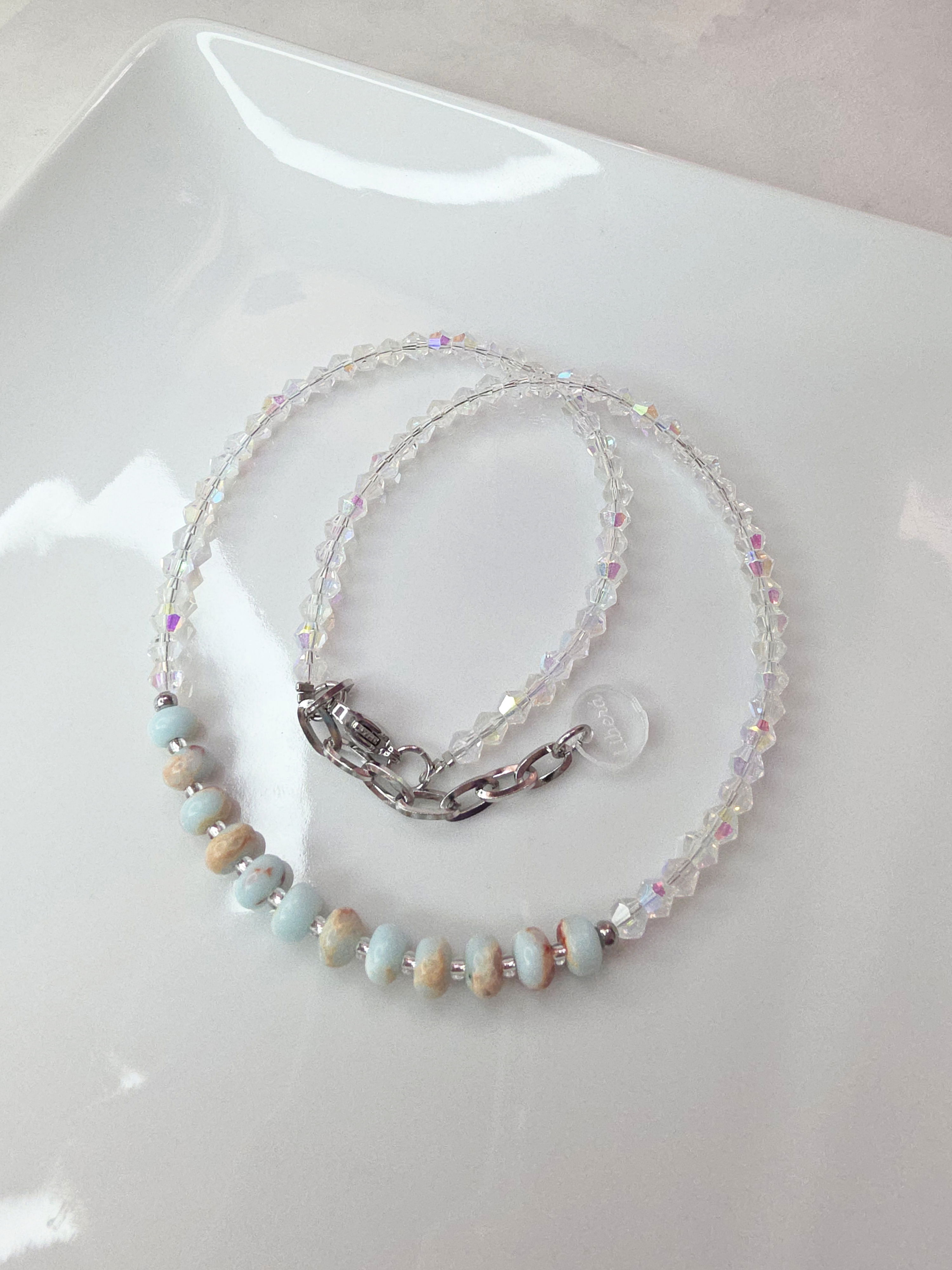 Collar de aproximadamente 40 cm (más cadena de alargue) compuesto por cristales cónicos, bolitas de Acero Quirúrgico, mostacillas Checas calibradas marca Preciosa y donas de Piedra Natural Calcita.