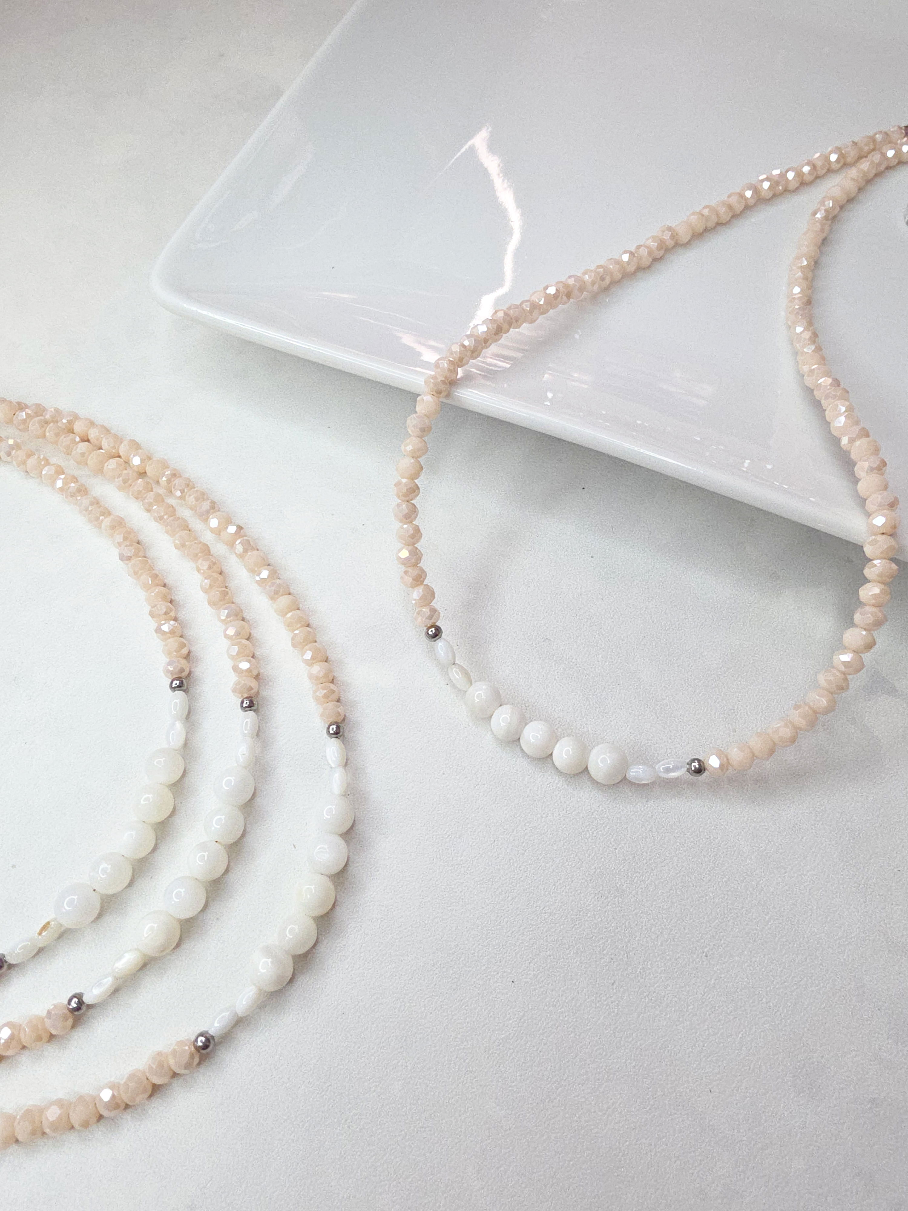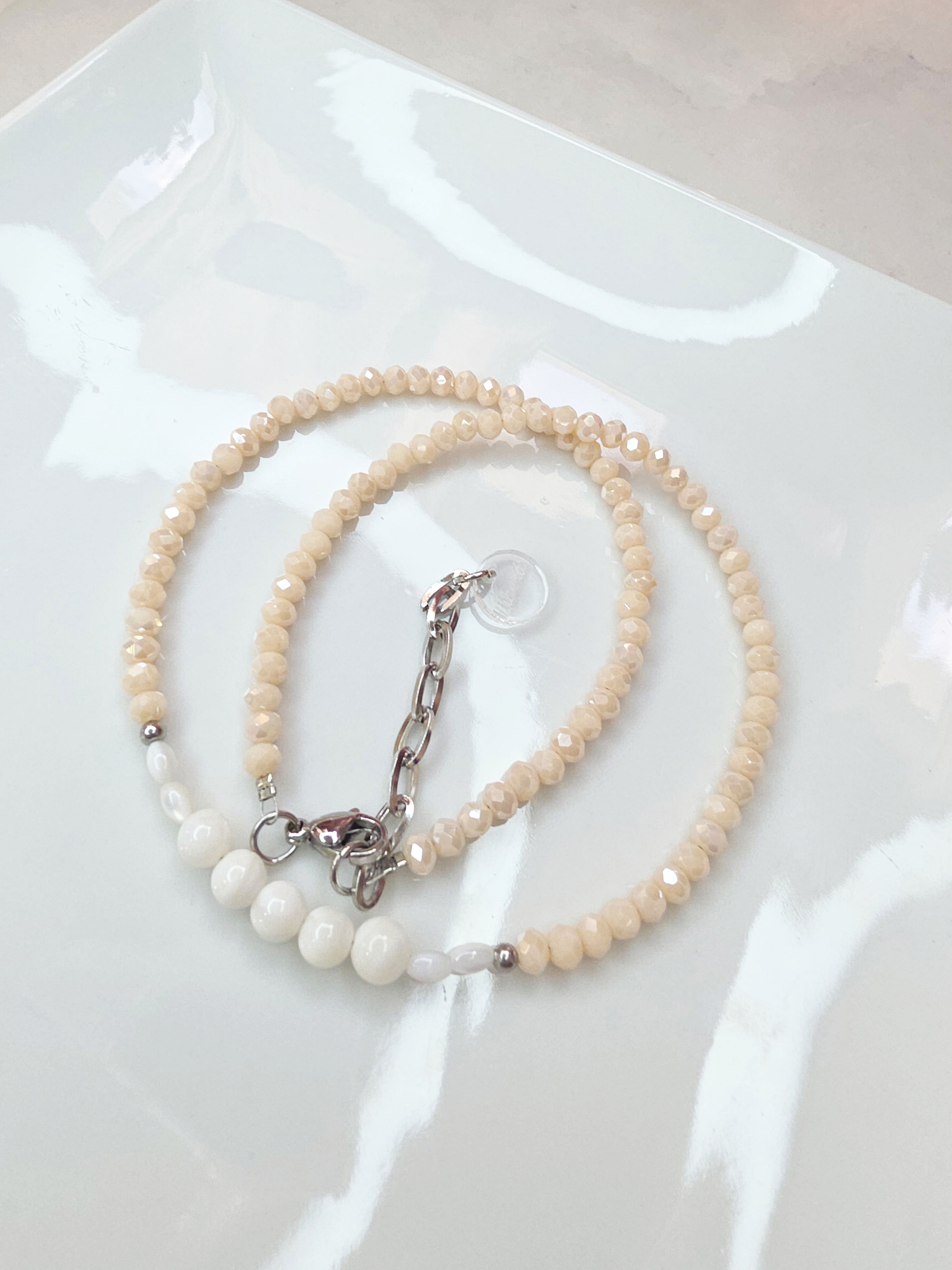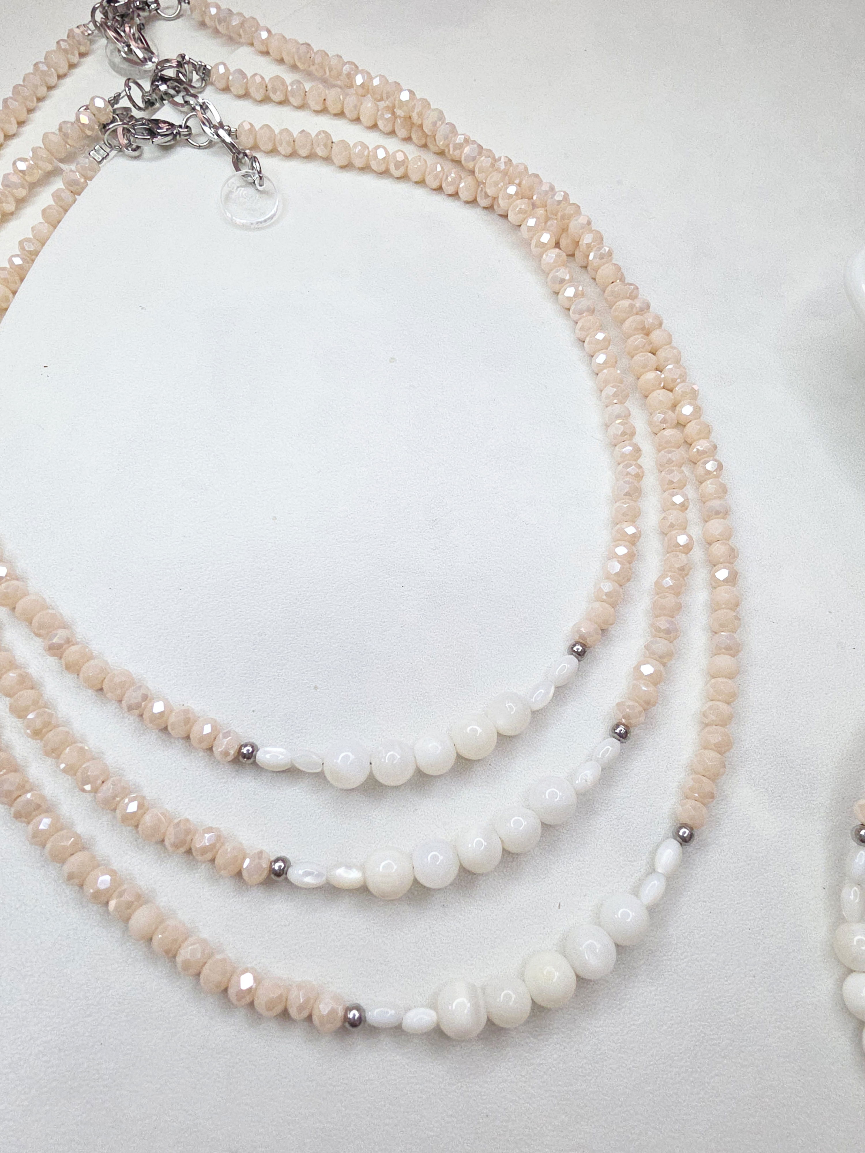 Collar de aproximadamente 40 cm (más cadena de alargue) compuesto por cristales, bolitas de Acero Quirúrgico, y cuentas de Nácar Natural, esferas y arroz.