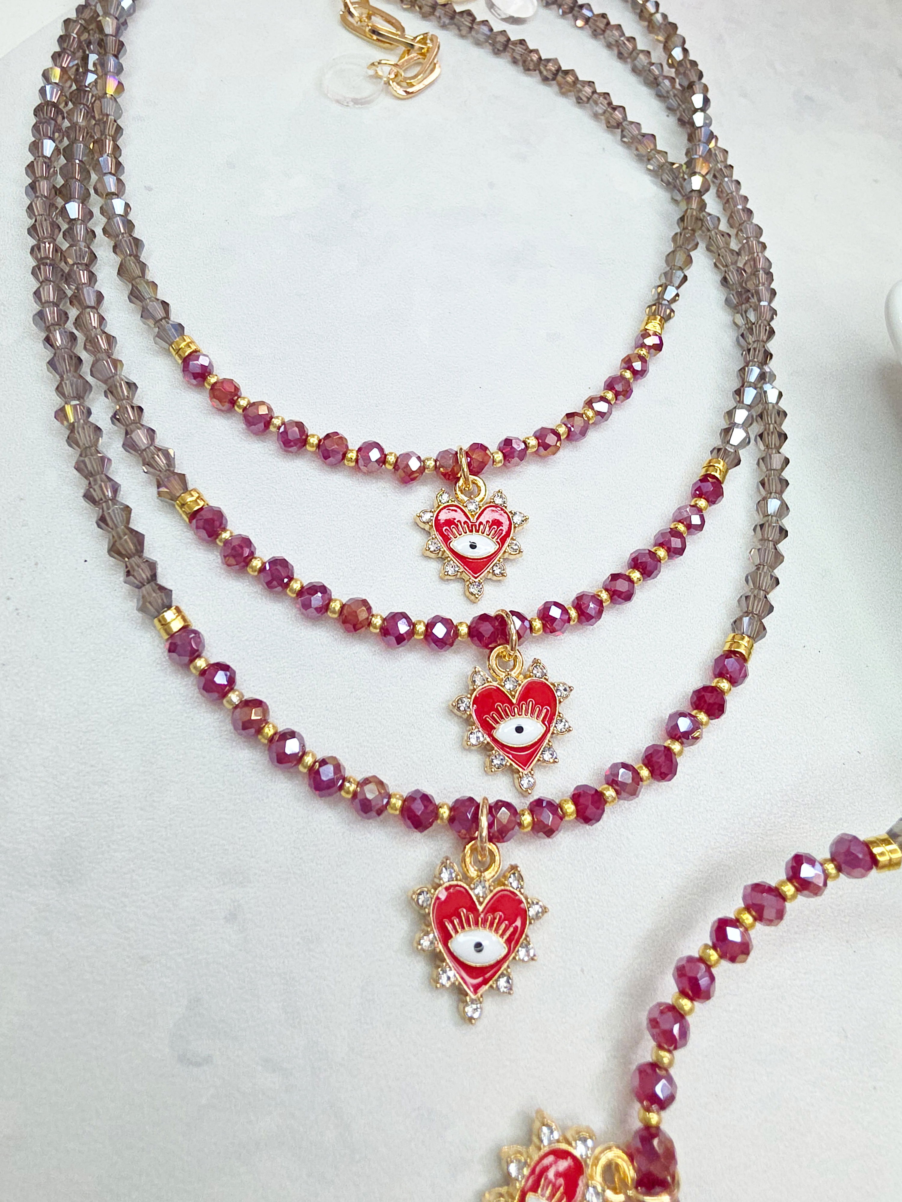 Collar de aproximadamente 40 cm (más cadena de alargue) compuesto por cristales cónicos y donas. Discos de Hematite, mostacillas Checas calibradas marca Preciosa y dije esmaltado con strass.