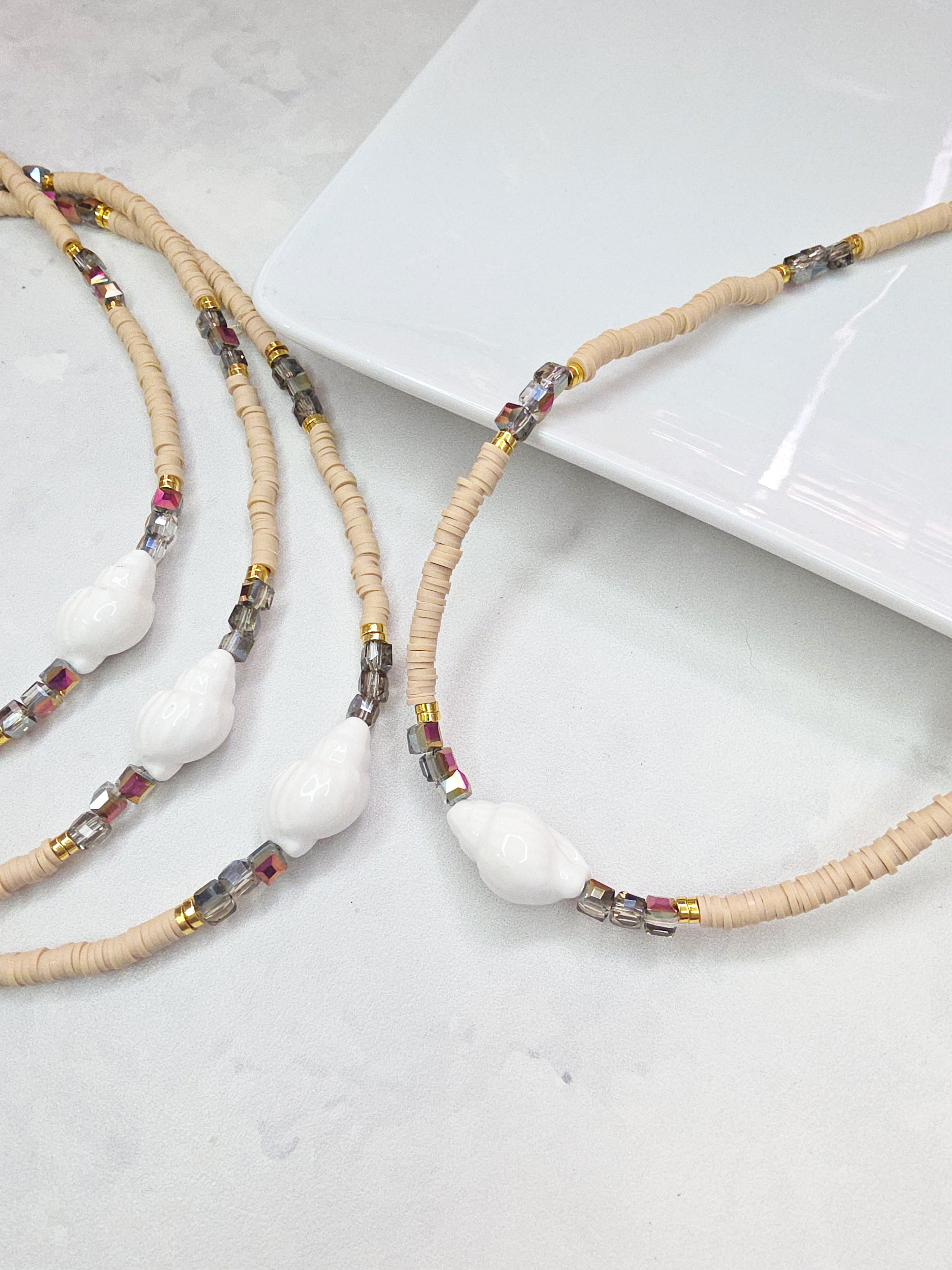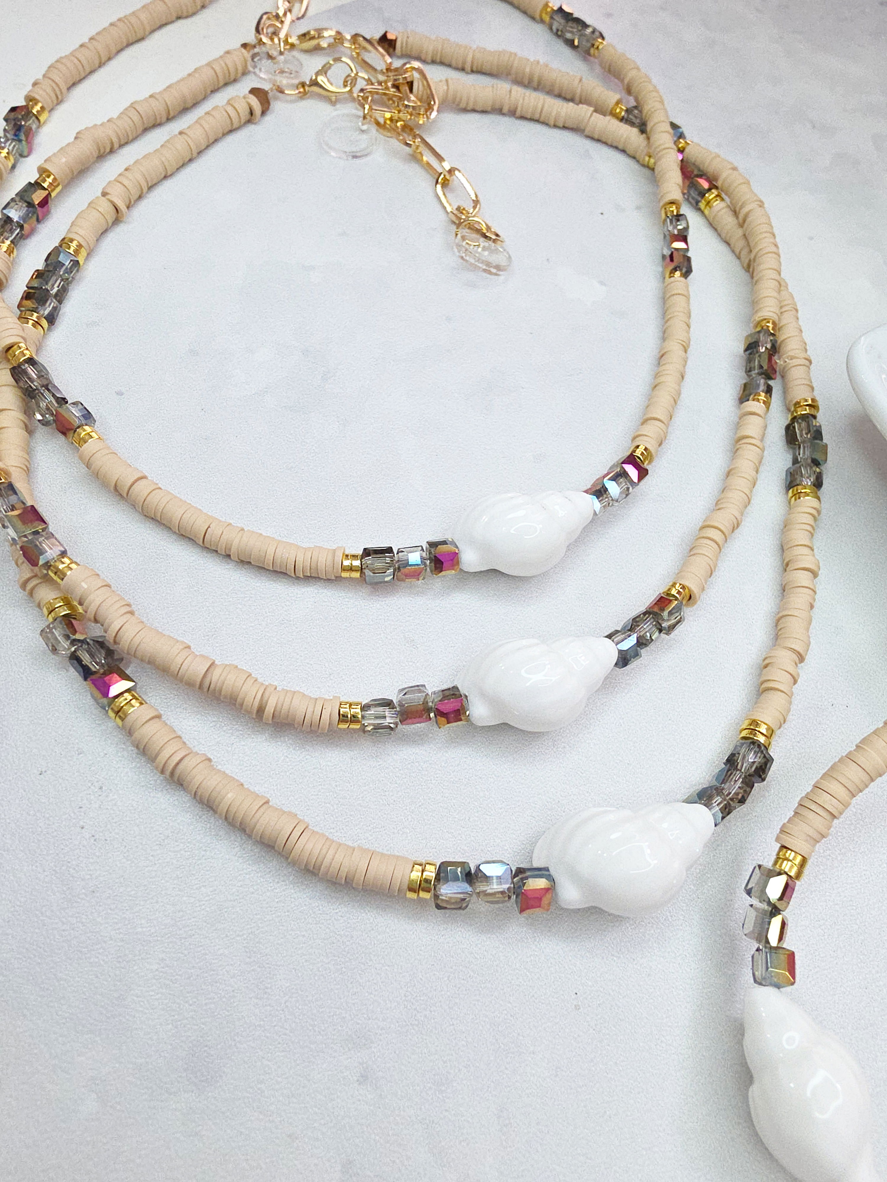Collar de aproximadamente 40 cm (más cadena de alargue) compuesto por Donitas de fimo (arcilla polimérica) separadores de Hematite, cubos de Cristal y Caracol de Cerámica.