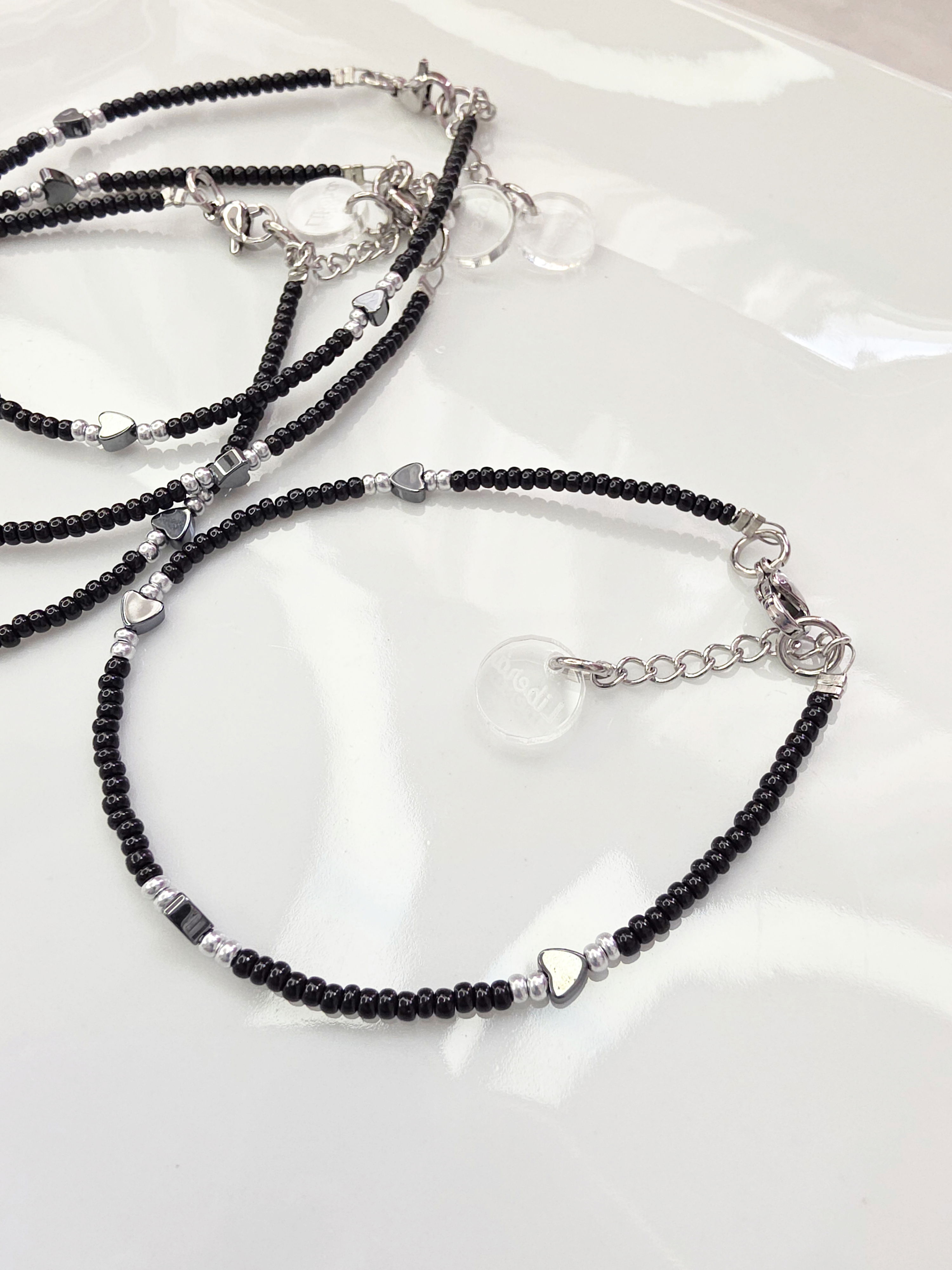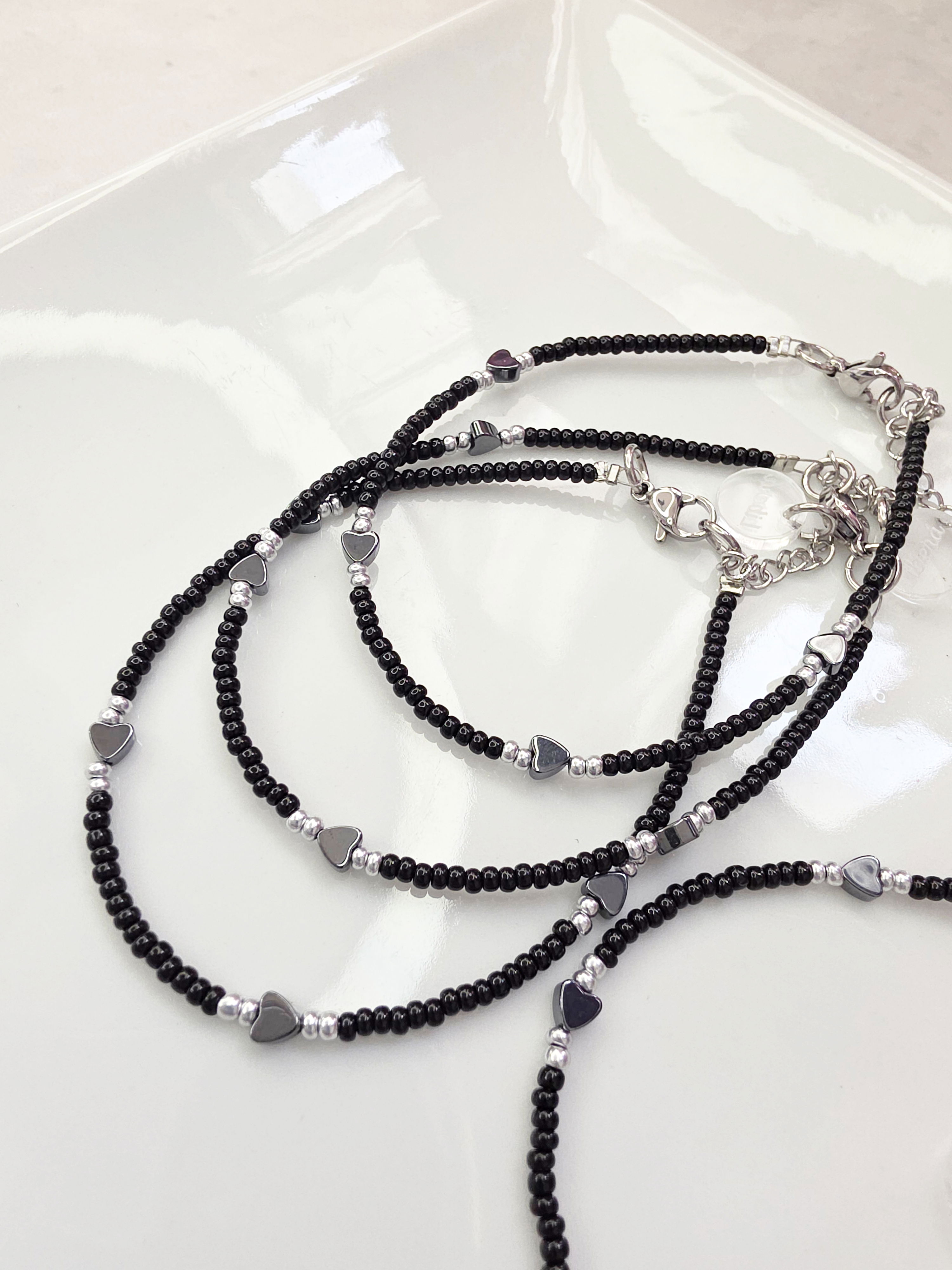 Pulsera compuesta por mostacillas Checas calibradas marca Preciosa (vidrio) y mini piezas de Hematite en forma de corazón.