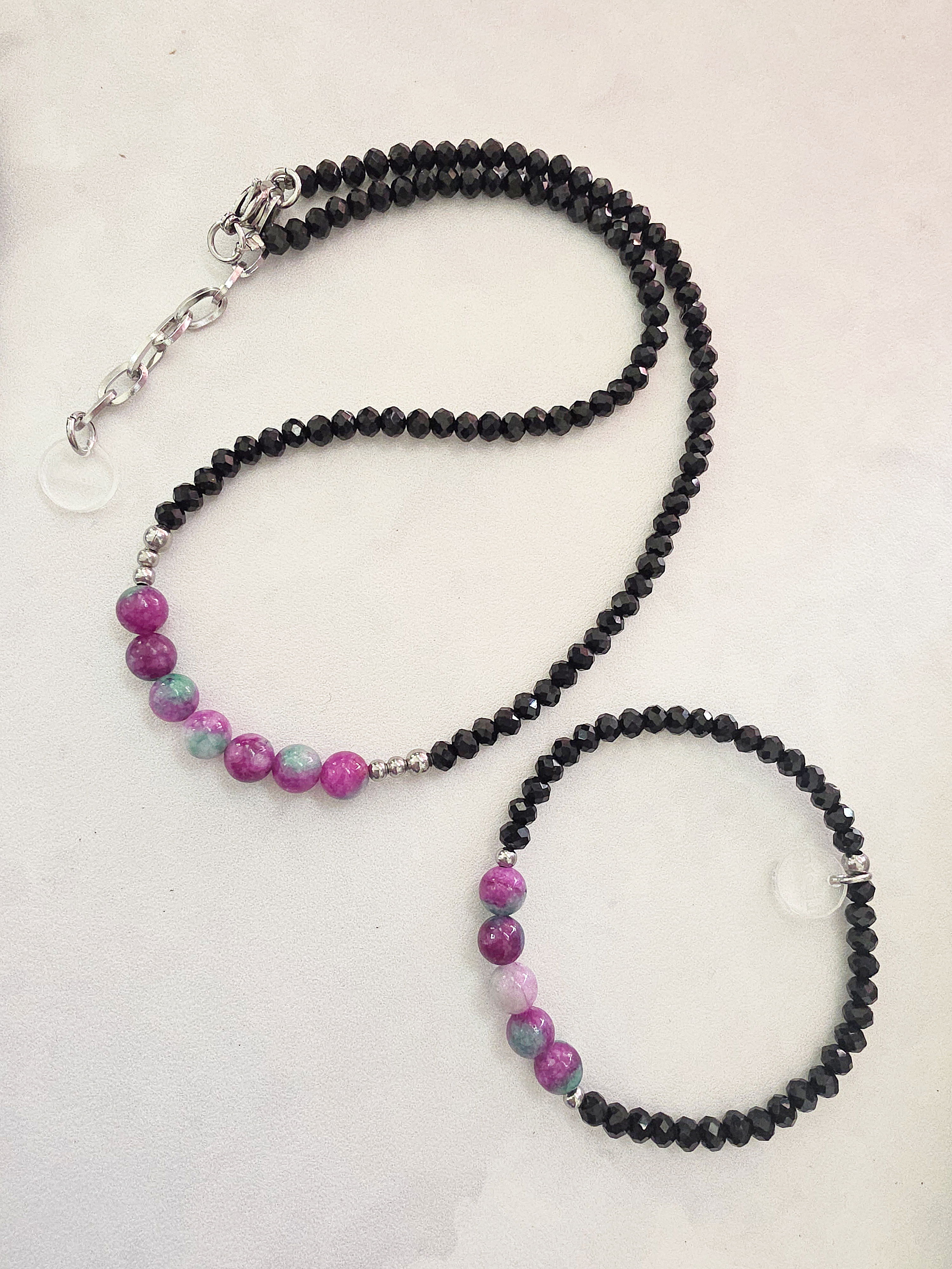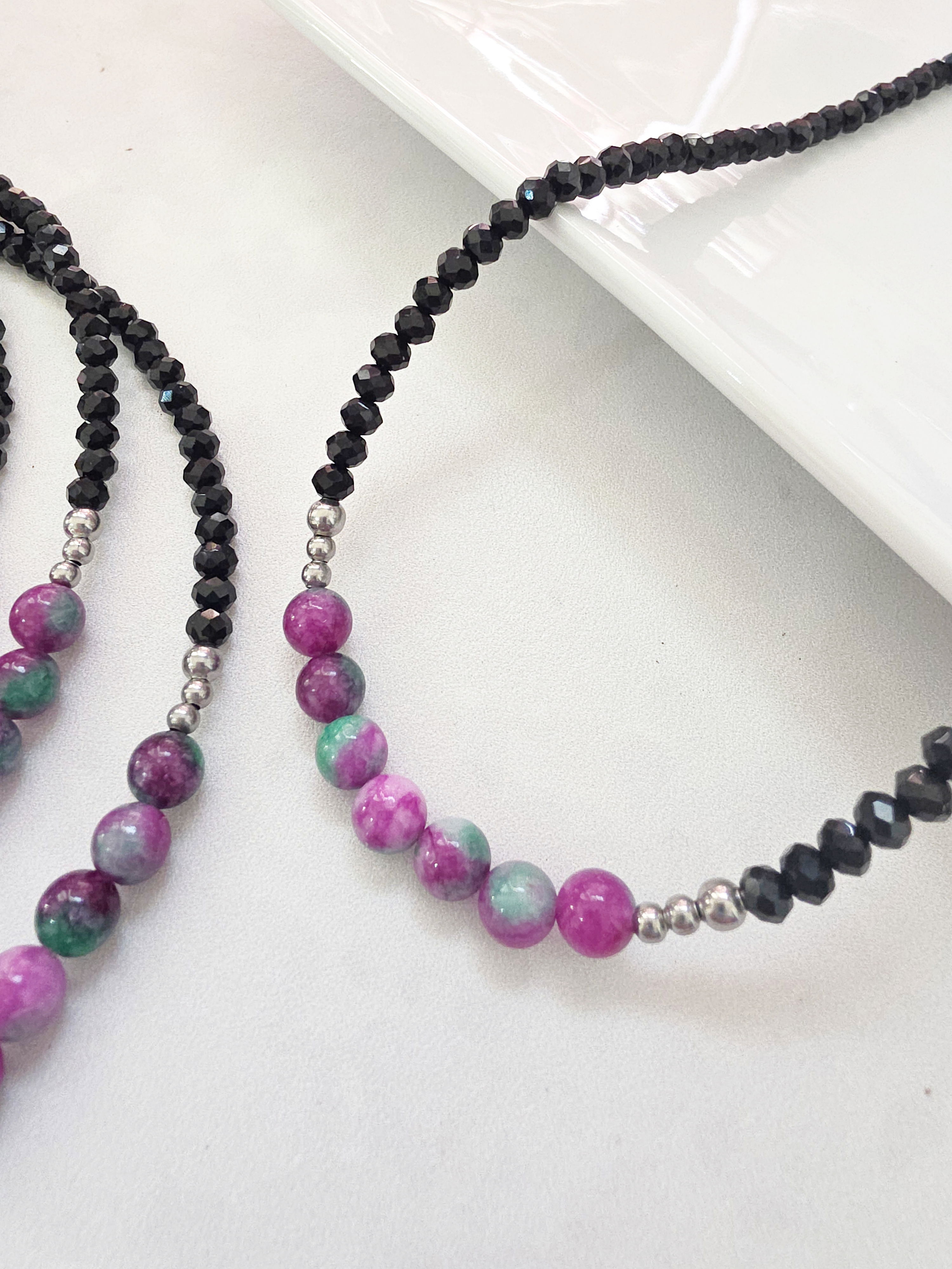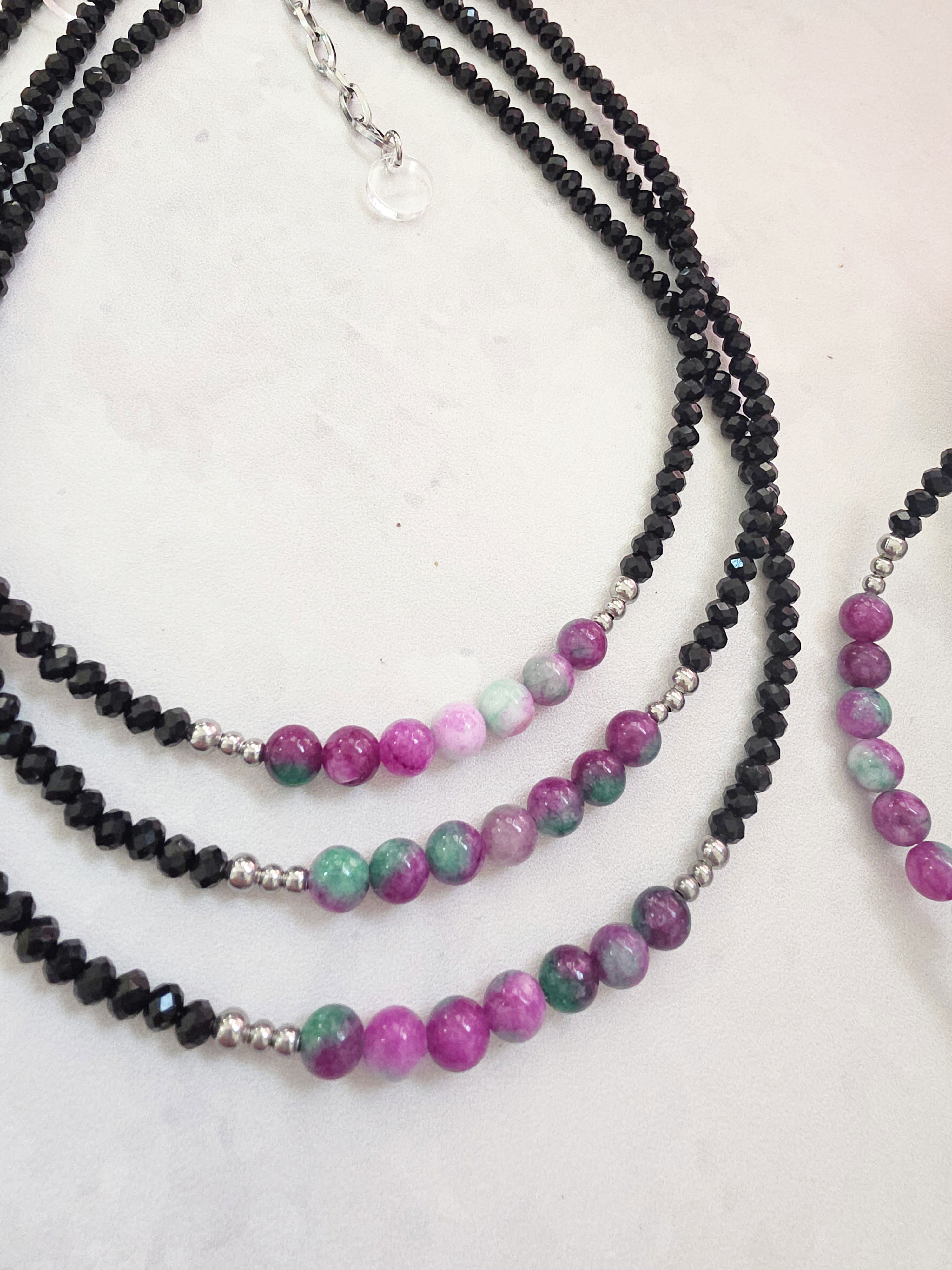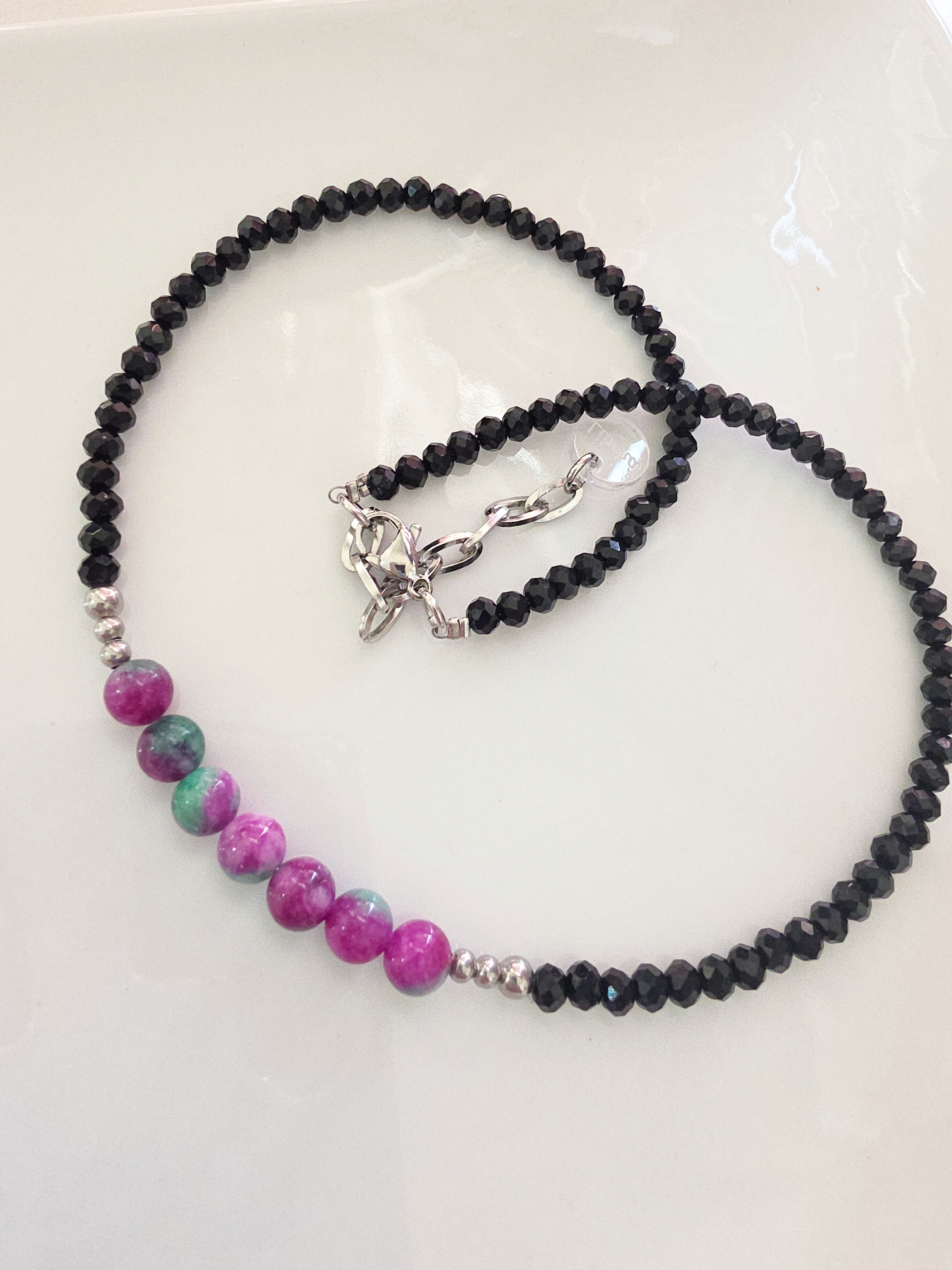 Collar de aproximadamente 40 cm (más cadena de alargue) compuesto por Donitas de cristal, bolitas de Acero Quirúrgico y piezas de Piedra Natural Ágata Sandía.