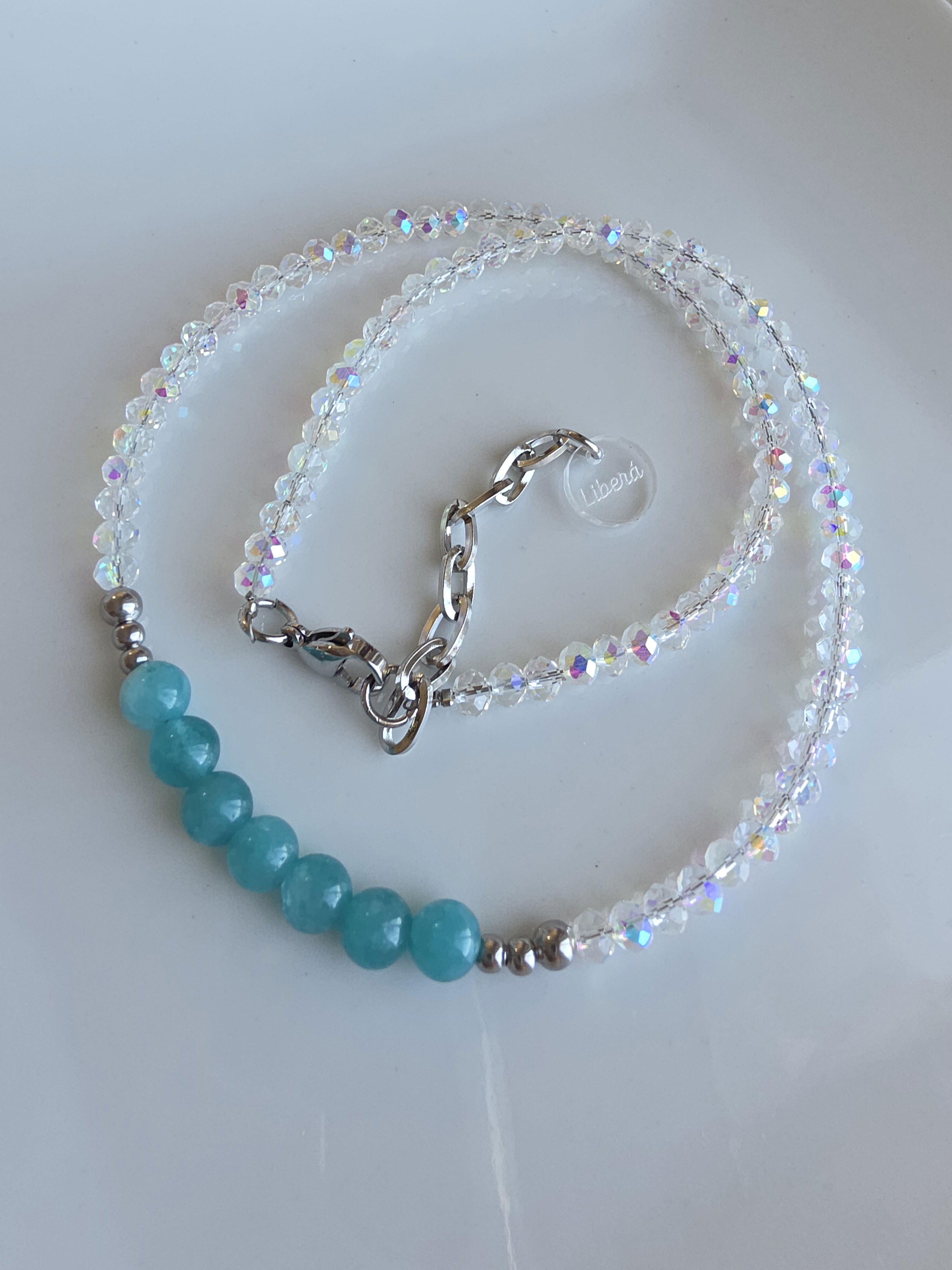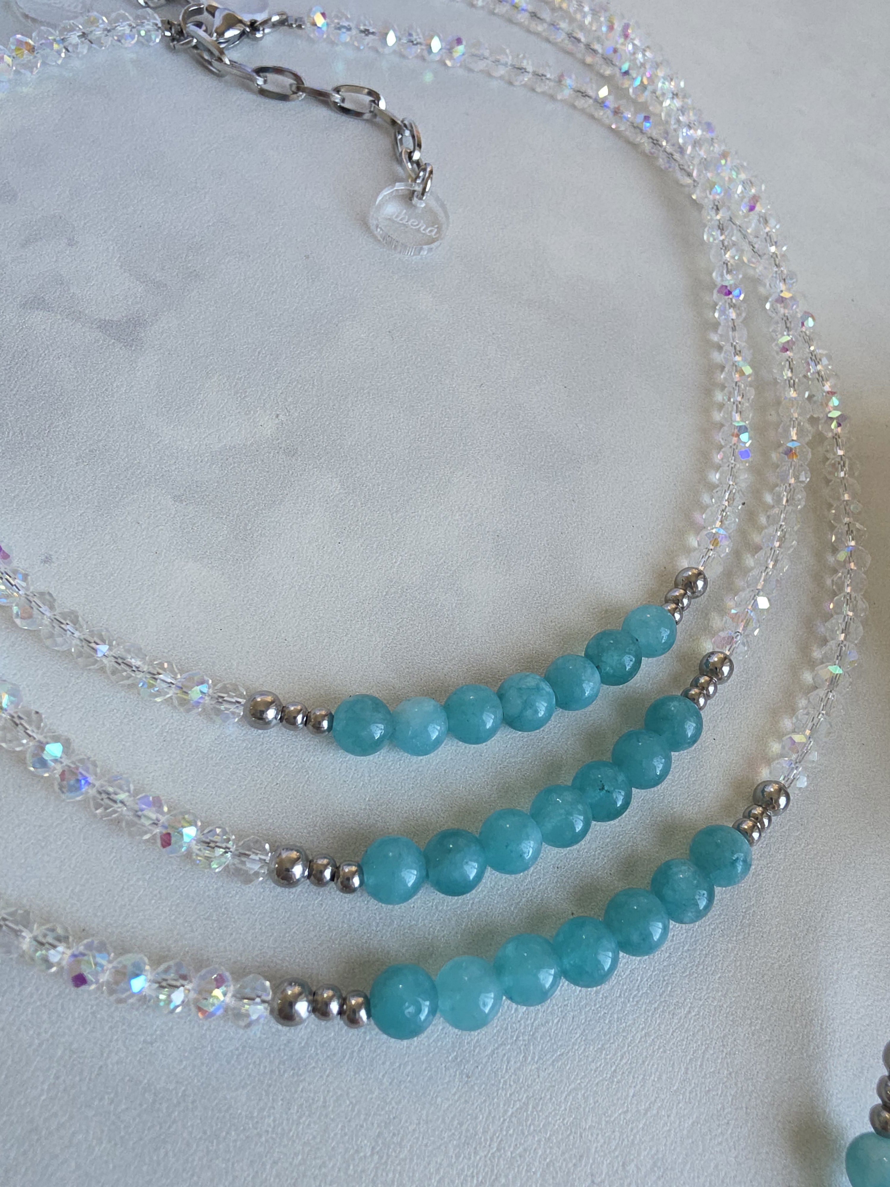 Collar de aproximadamente 40 cm (más cadena de alargue) compuesto por Donitas de cristal, bolitas de Acero Quirúrgico y piezas de Piedra Natural Ágata Turquesa.
