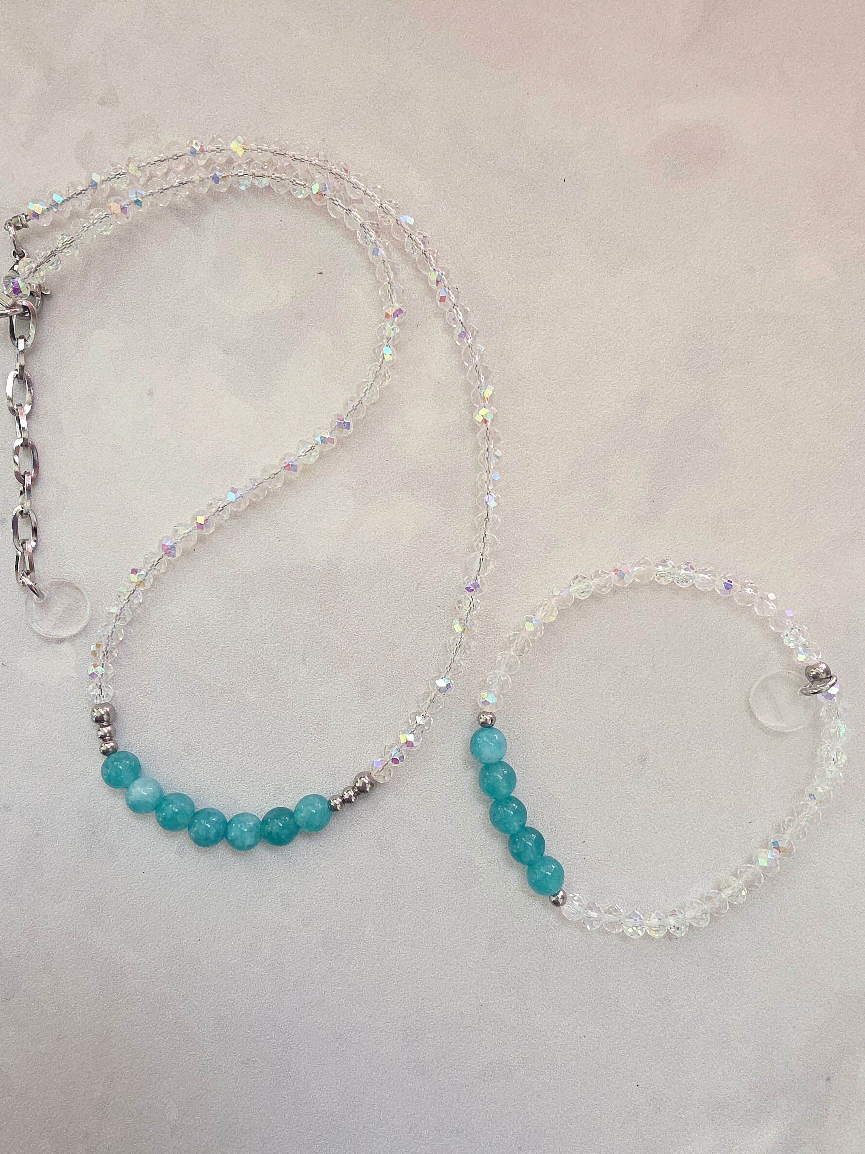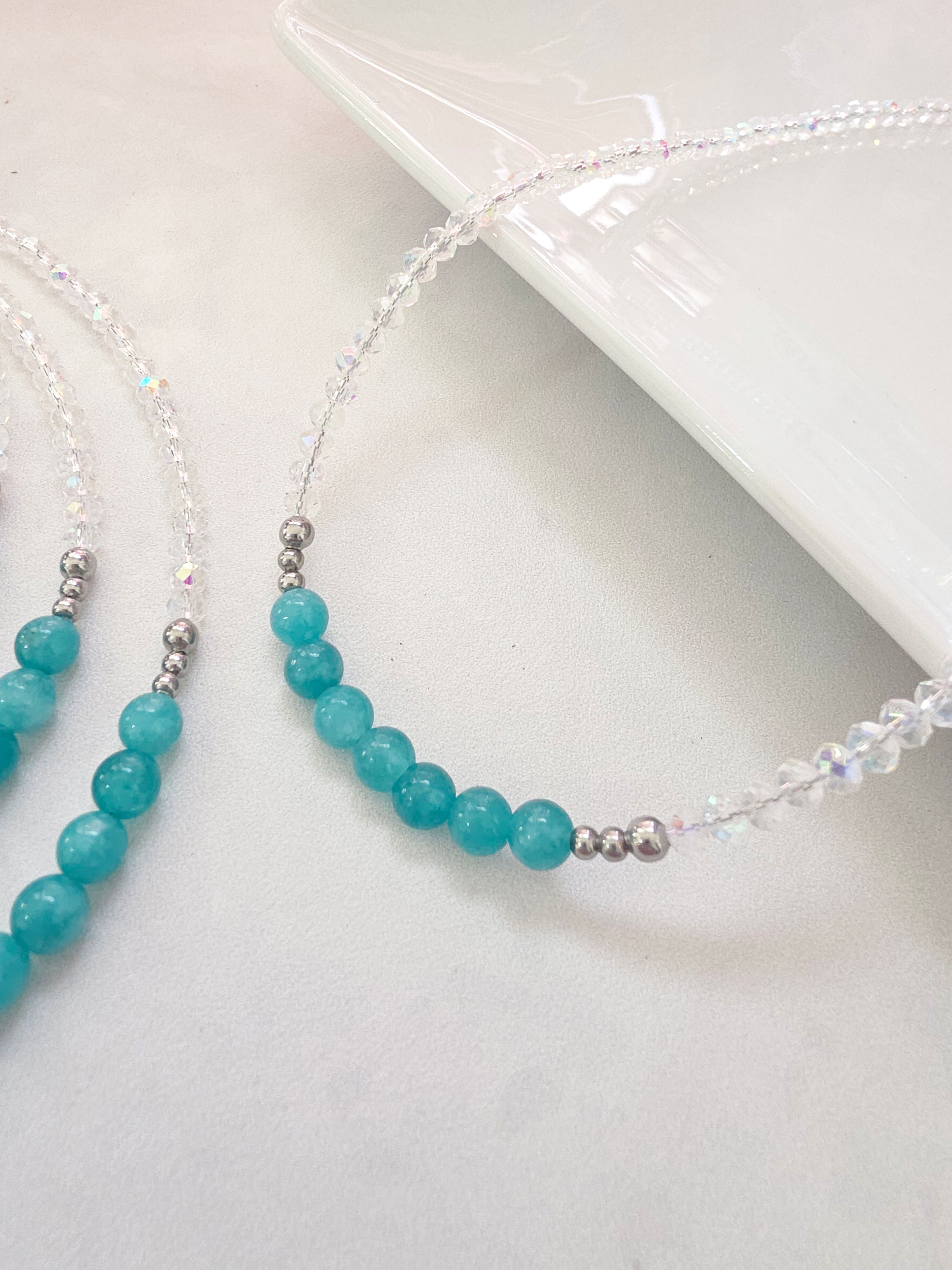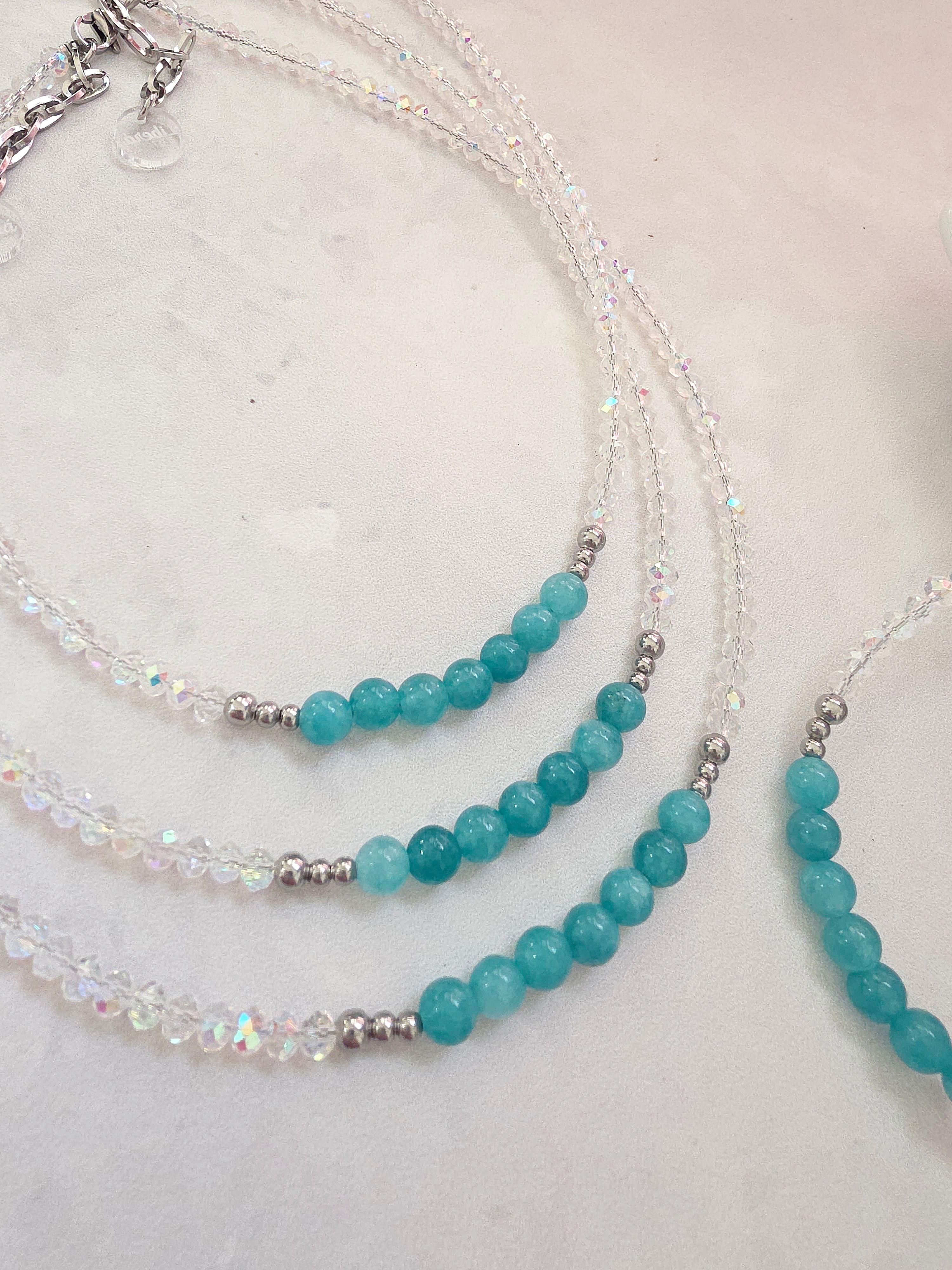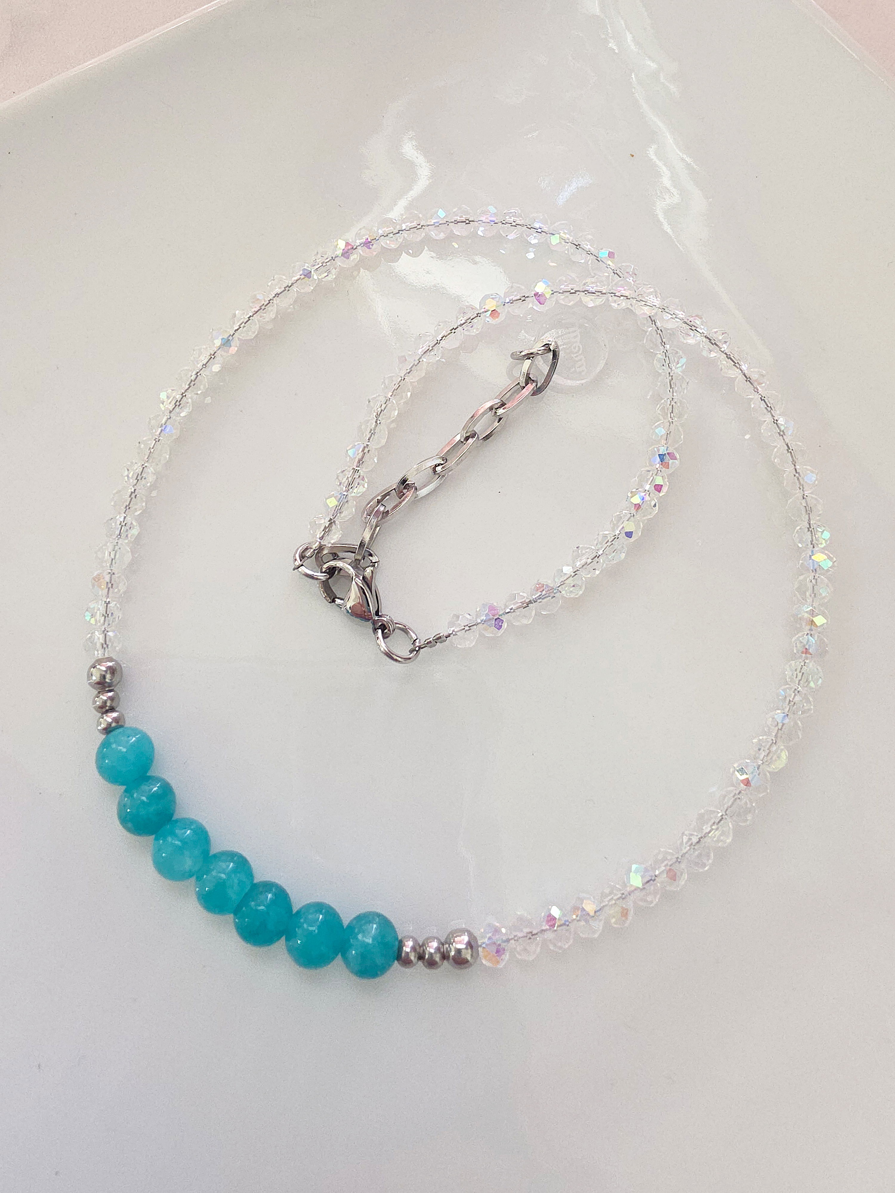 Collar de aproximadamente 40 cm (más cadena de alargue) compuesto por Donitas de cristal, bolitas de Acero Quirúrgico y piezas de Piedra Natural Ágata Turquesa.