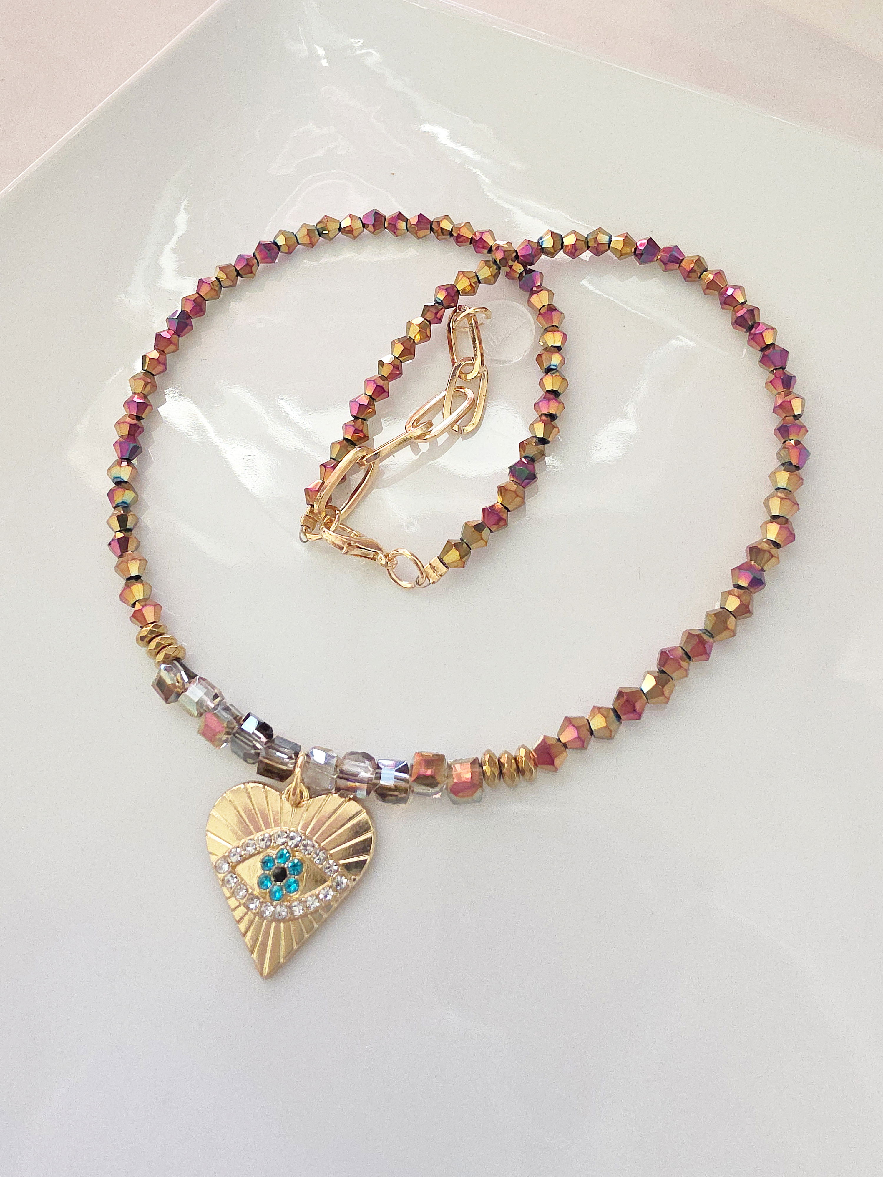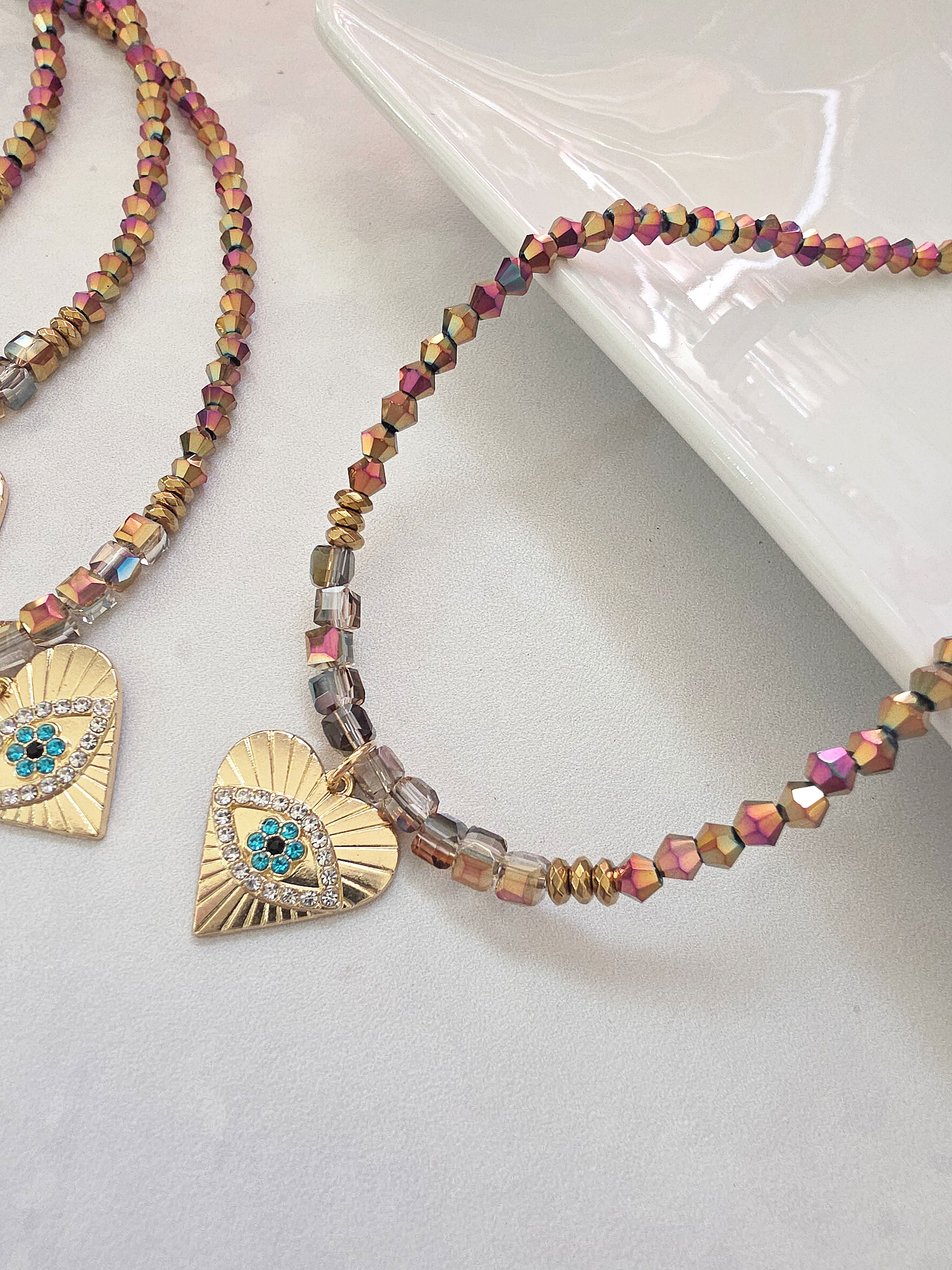 Collar de aproximadamente 40 cm (más cadena de alargue) compuesto por conos de Cristal, arandelas facetadas de Hematite, cubos de cristal y dije corazón con strass y ojito.