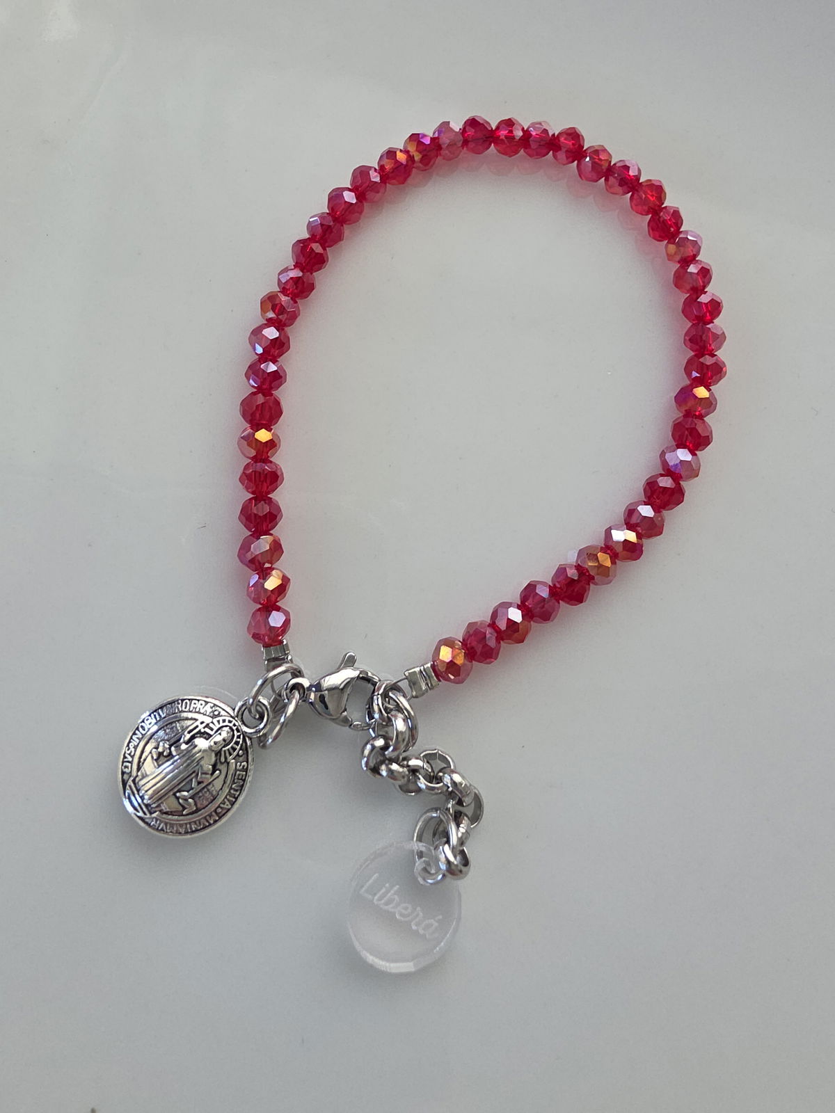 Pulsera compuesta por donas de cristal, dije de San Benito de Fundición (buena calidad)