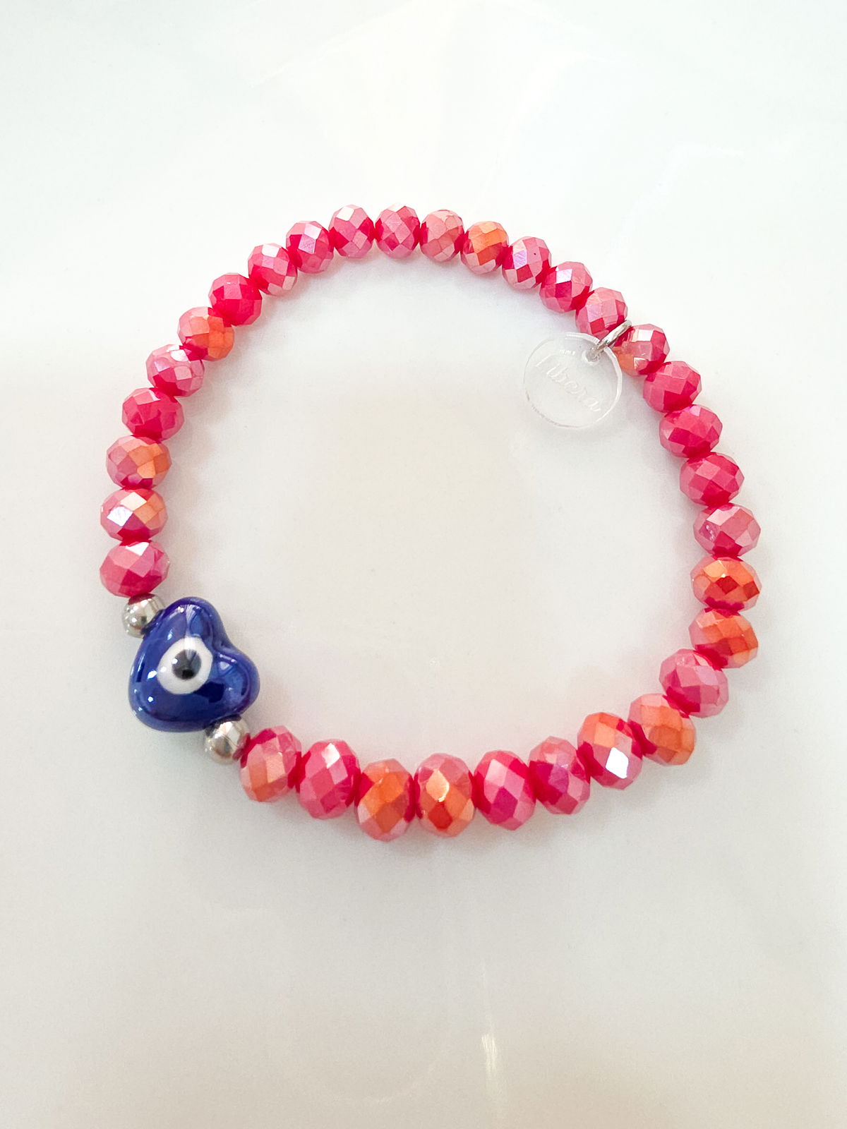 Pulsera elástica compuesta por donas de cristal y corazón de cerámica esmaltado. Detalles de Acero Quirúrgico 316l.