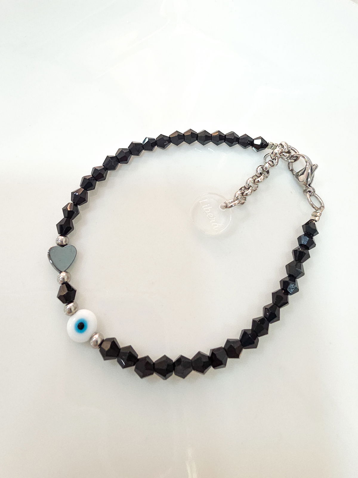 Pulsera compuesta por conitos de cristal, ojito de vidrio y corazón de hematite.