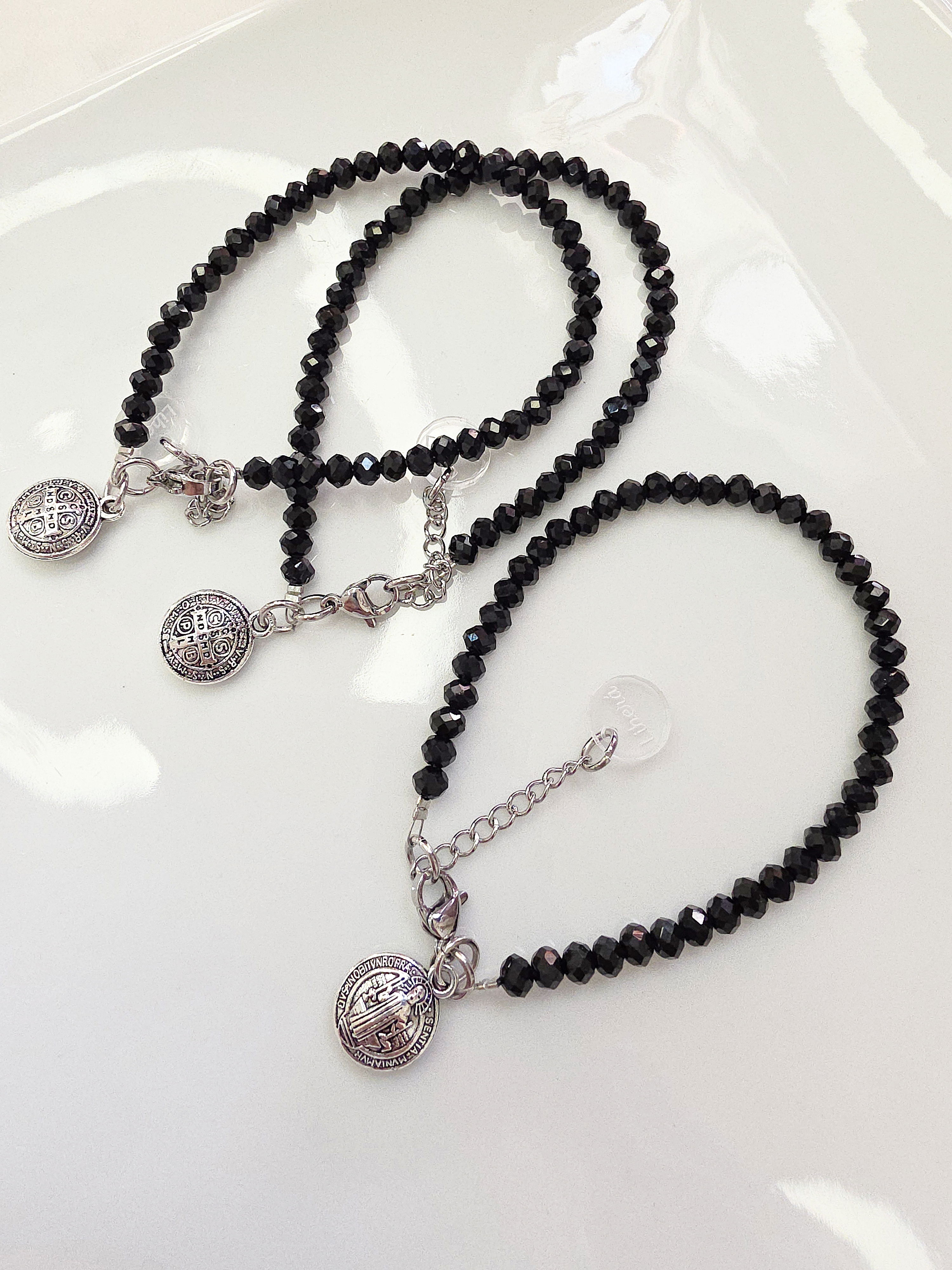 Pulsera compuesta por donas de cristal, dije de San Benito de Fundición (buena calidad)