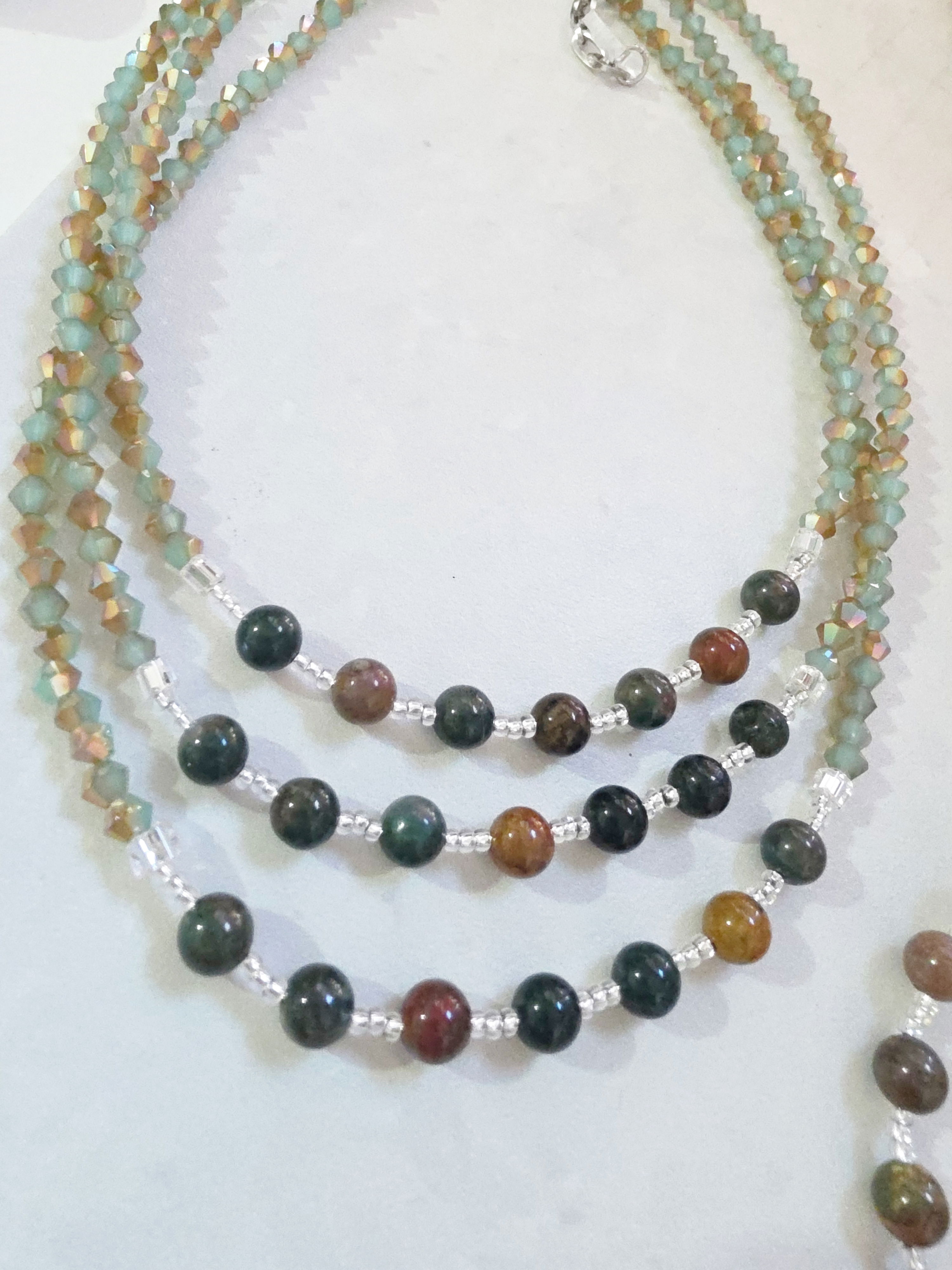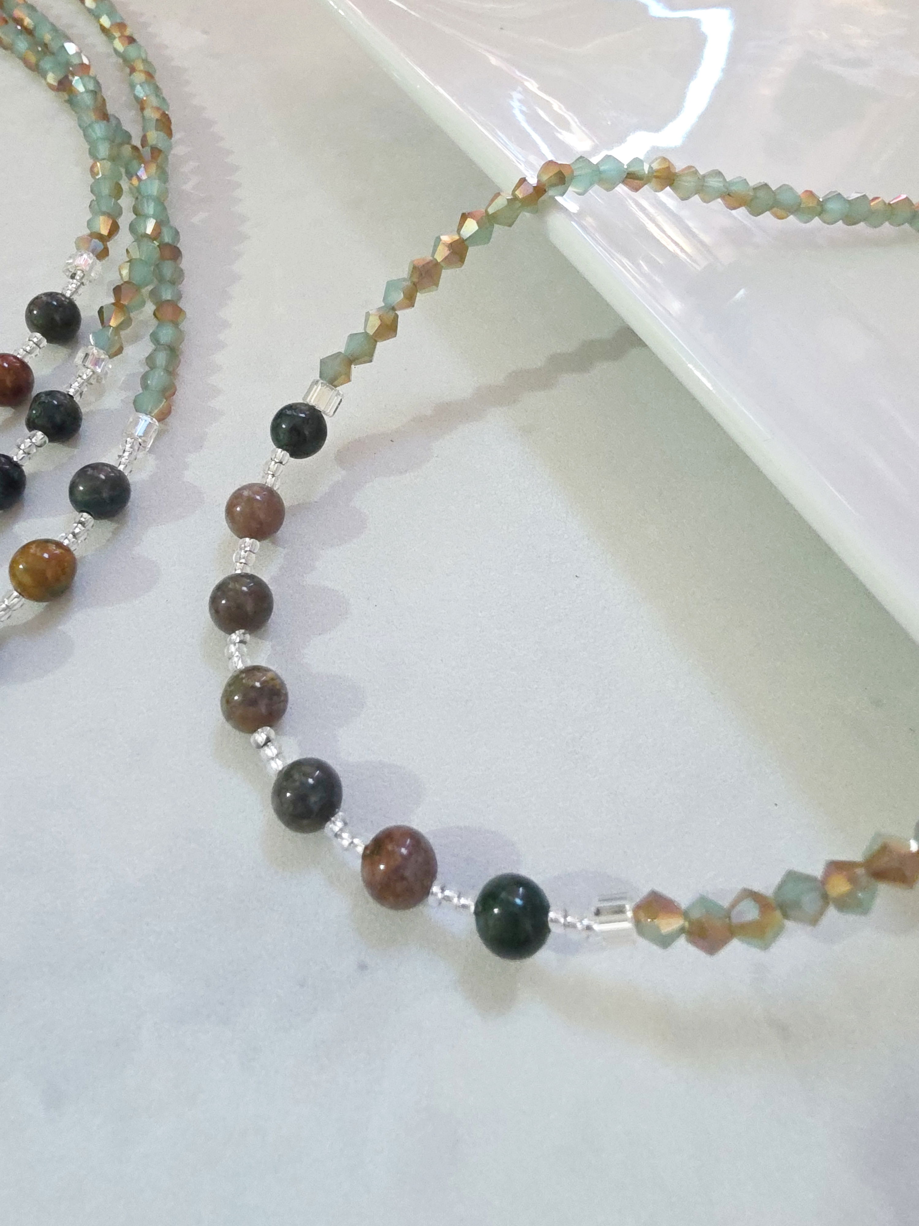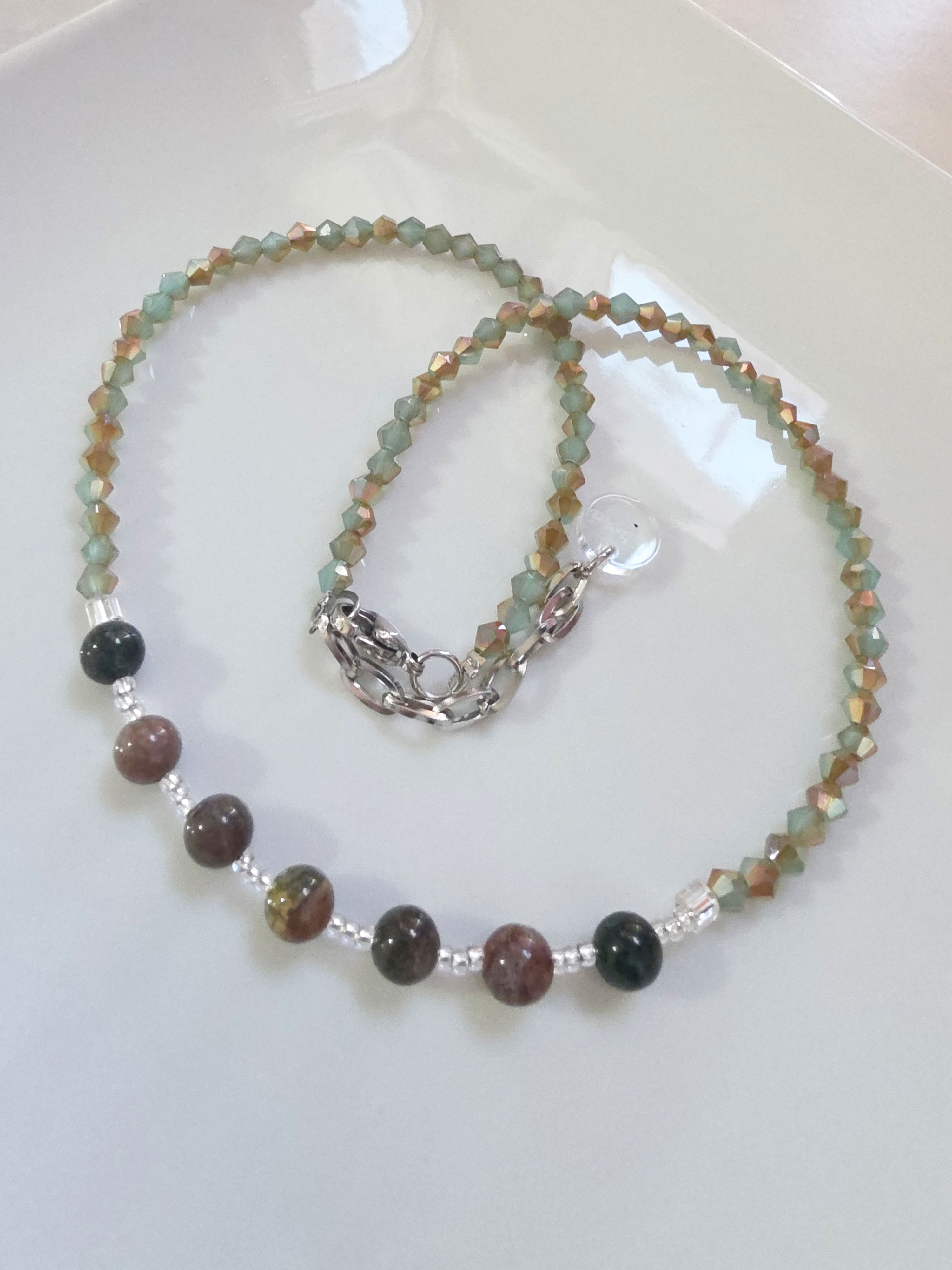 Collar de aproximadamente 40 cm (más cadena de alargue) compuesto por cristales cónicos, mostacillas Checas calibradas marca Preciosa y piezas de Piedra Natural Agata India.