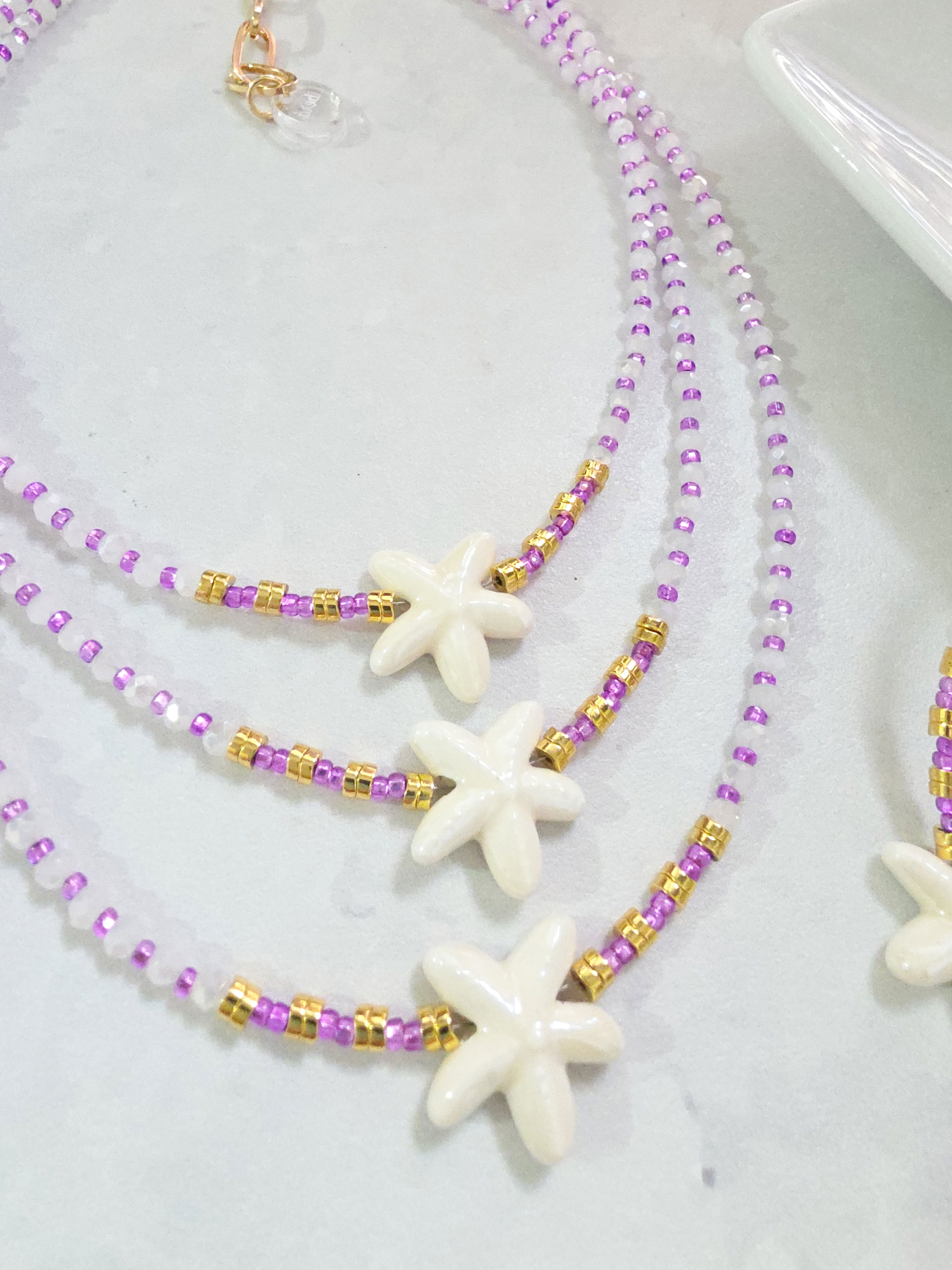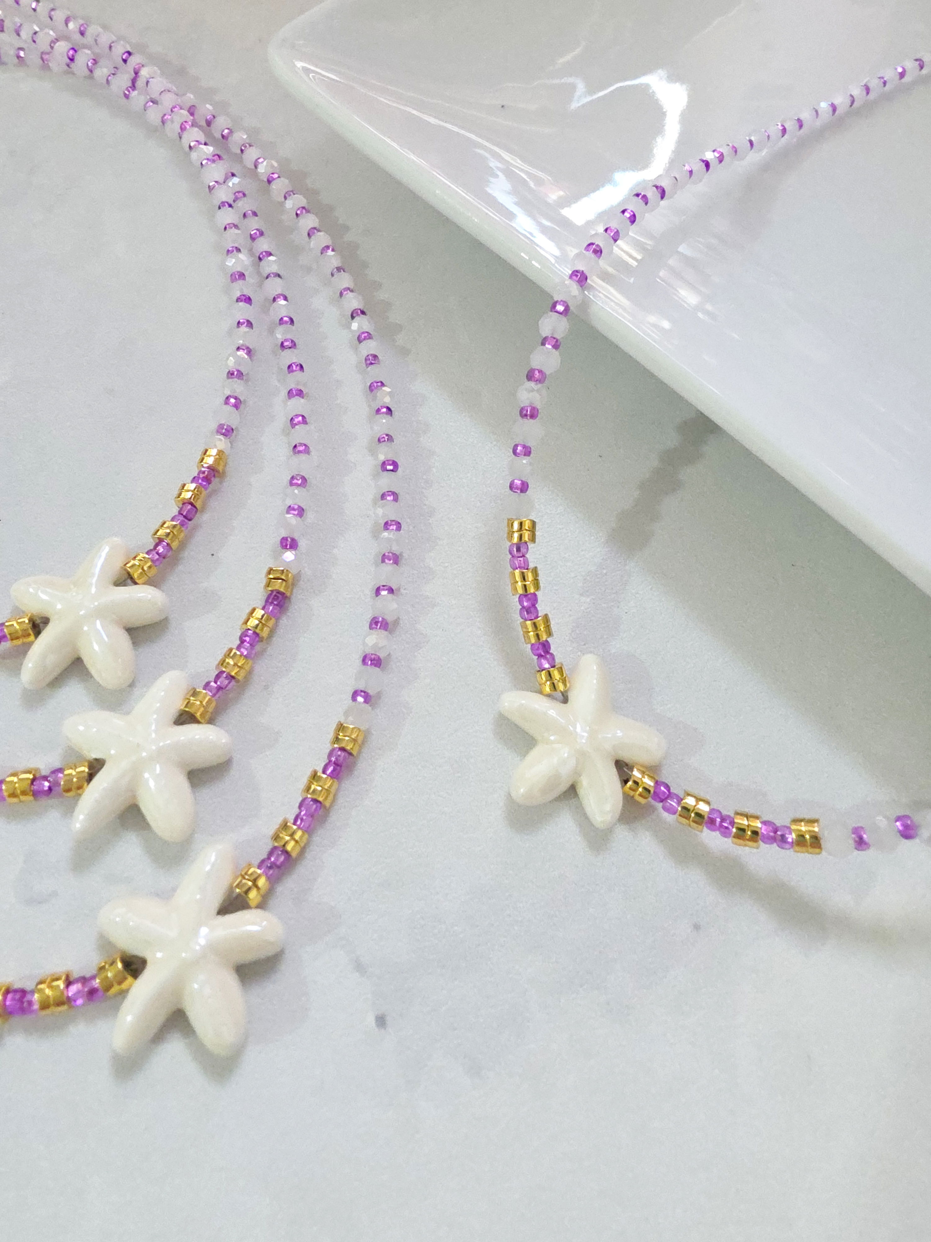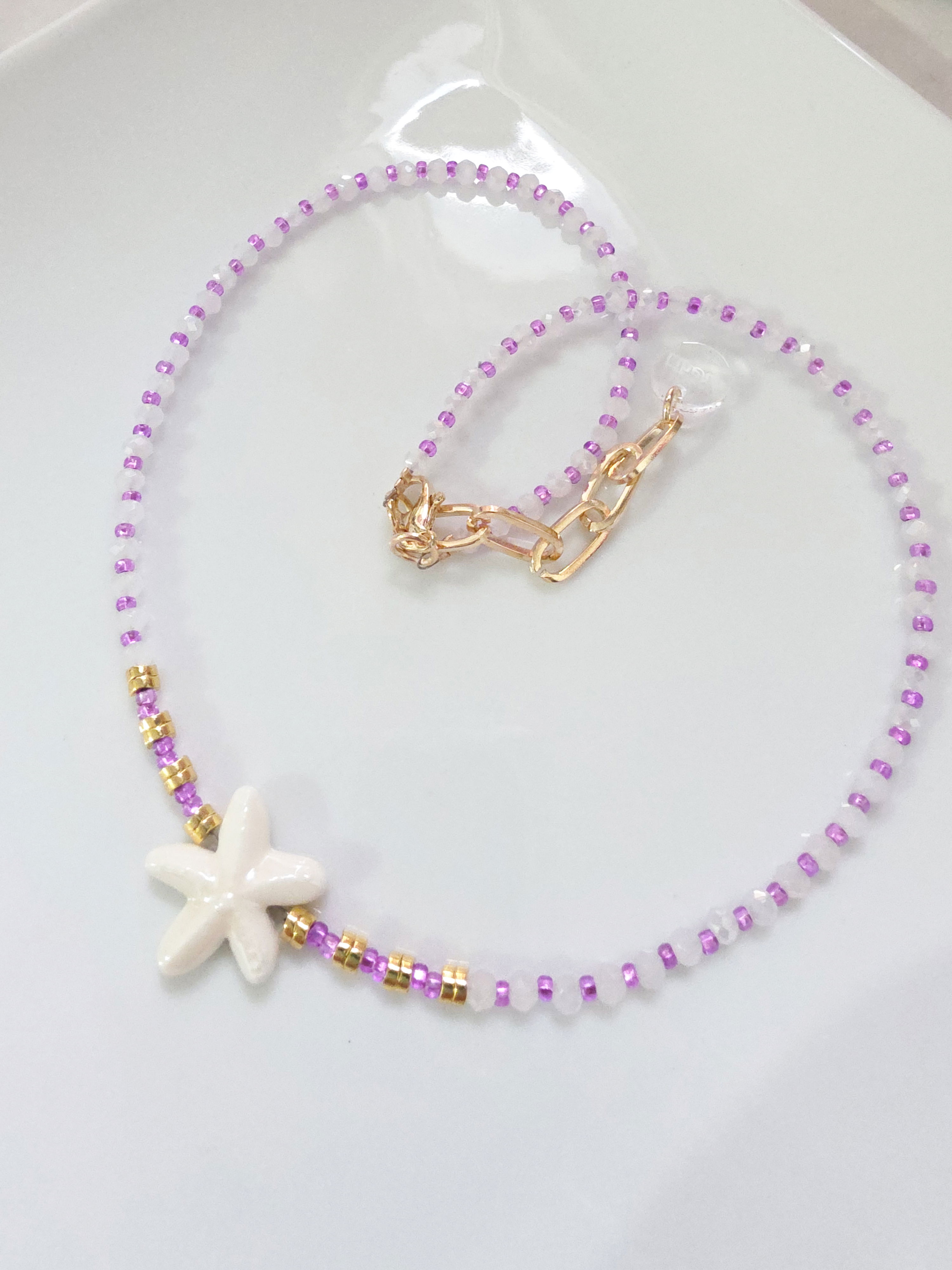 Collar de aproximadamente 40 cm (más cadena de alargue) compuesto por mini cristalitos, mostacillas Checas calibradas marca Preciosa, mini Donitas de Hematite con baño y Estrella de Mar de Cerámica.