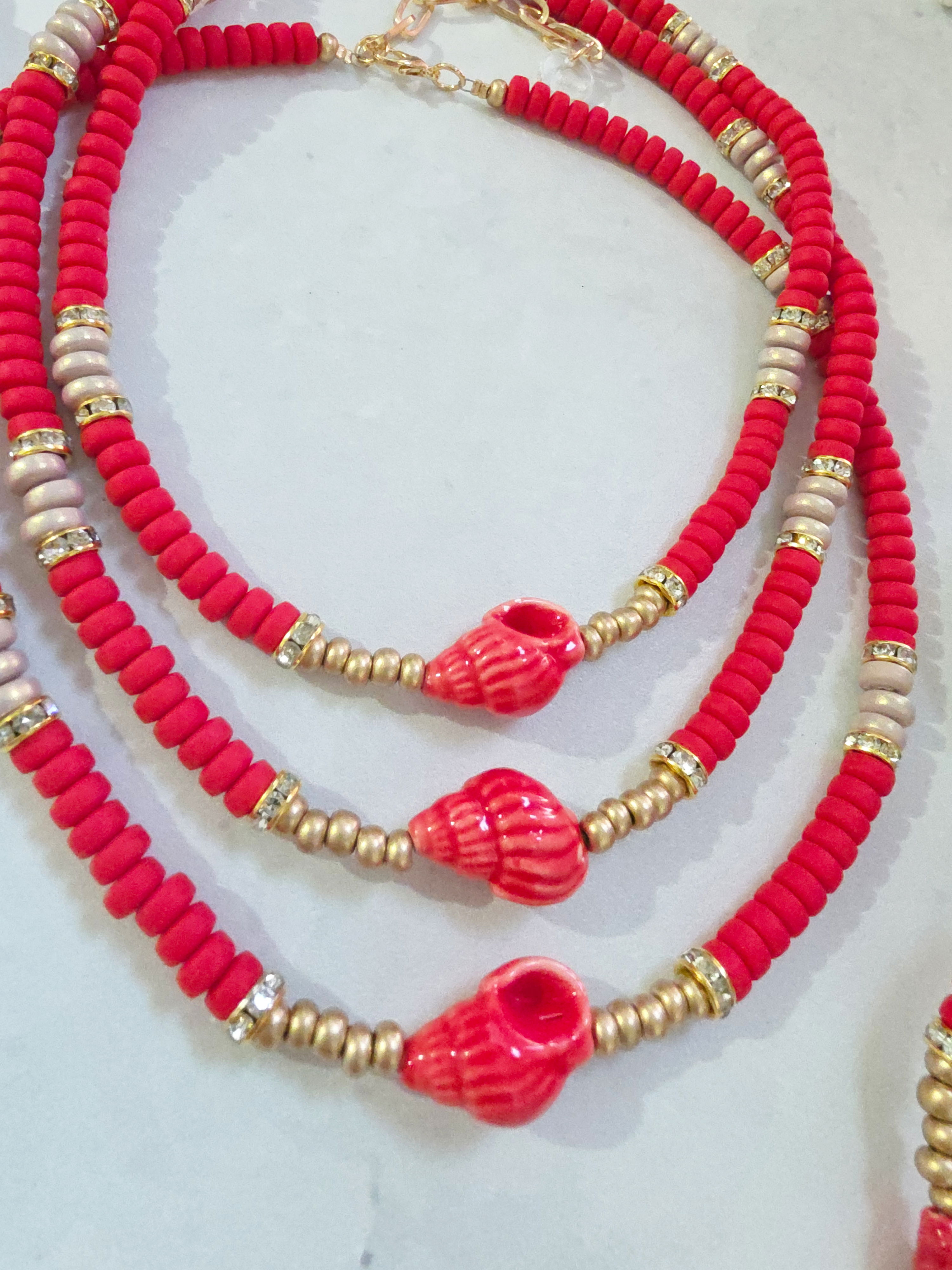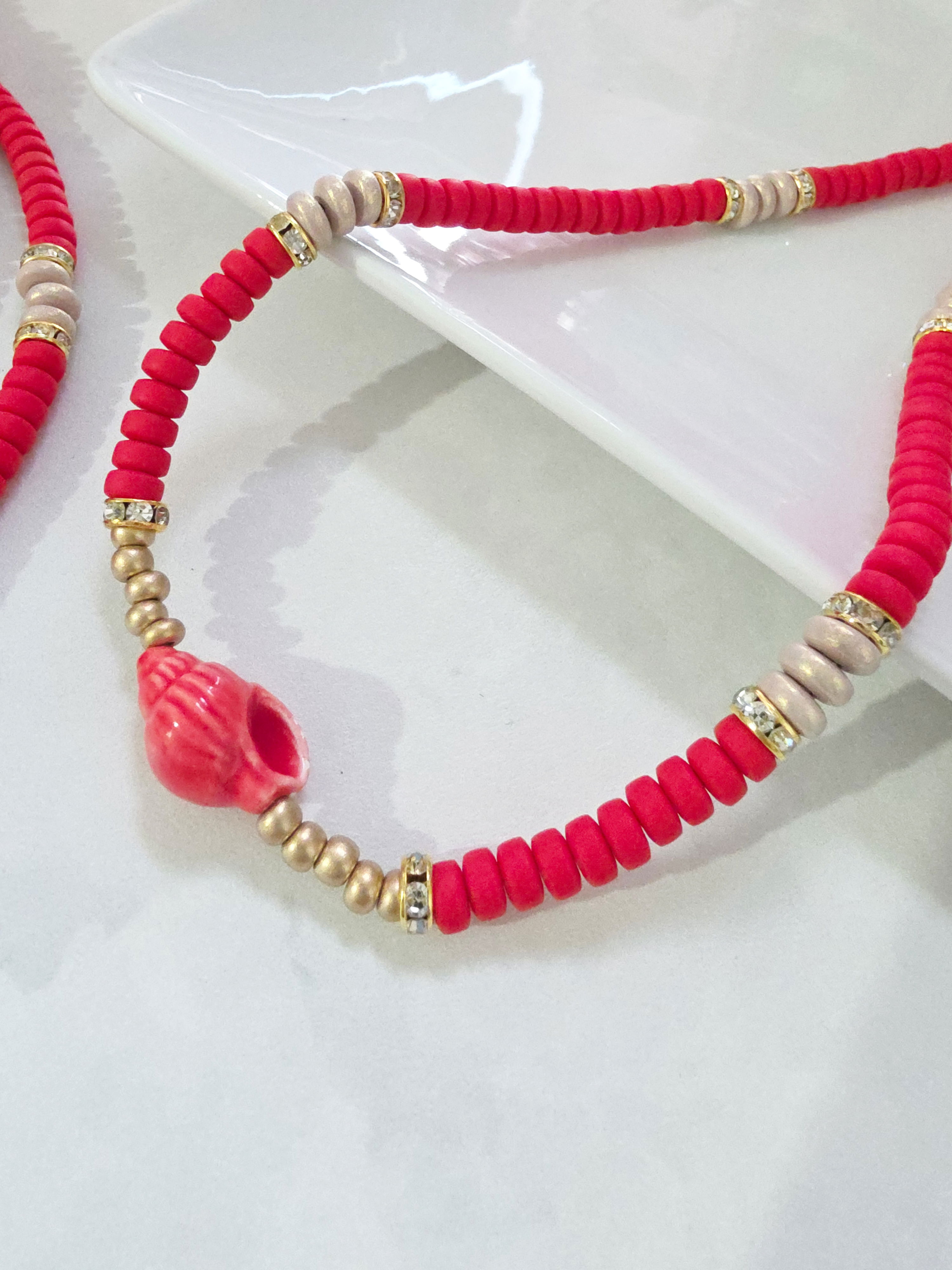 Collar de aproximadamente 40 cm (más cadena de alargue) compuesto por donas de Fimo (arcilla polimérica) en tono mate y perlado, arandelas de strass, mostacillones de Vidrio calibrados marca Preciosa y Caracol de Cerámica.
