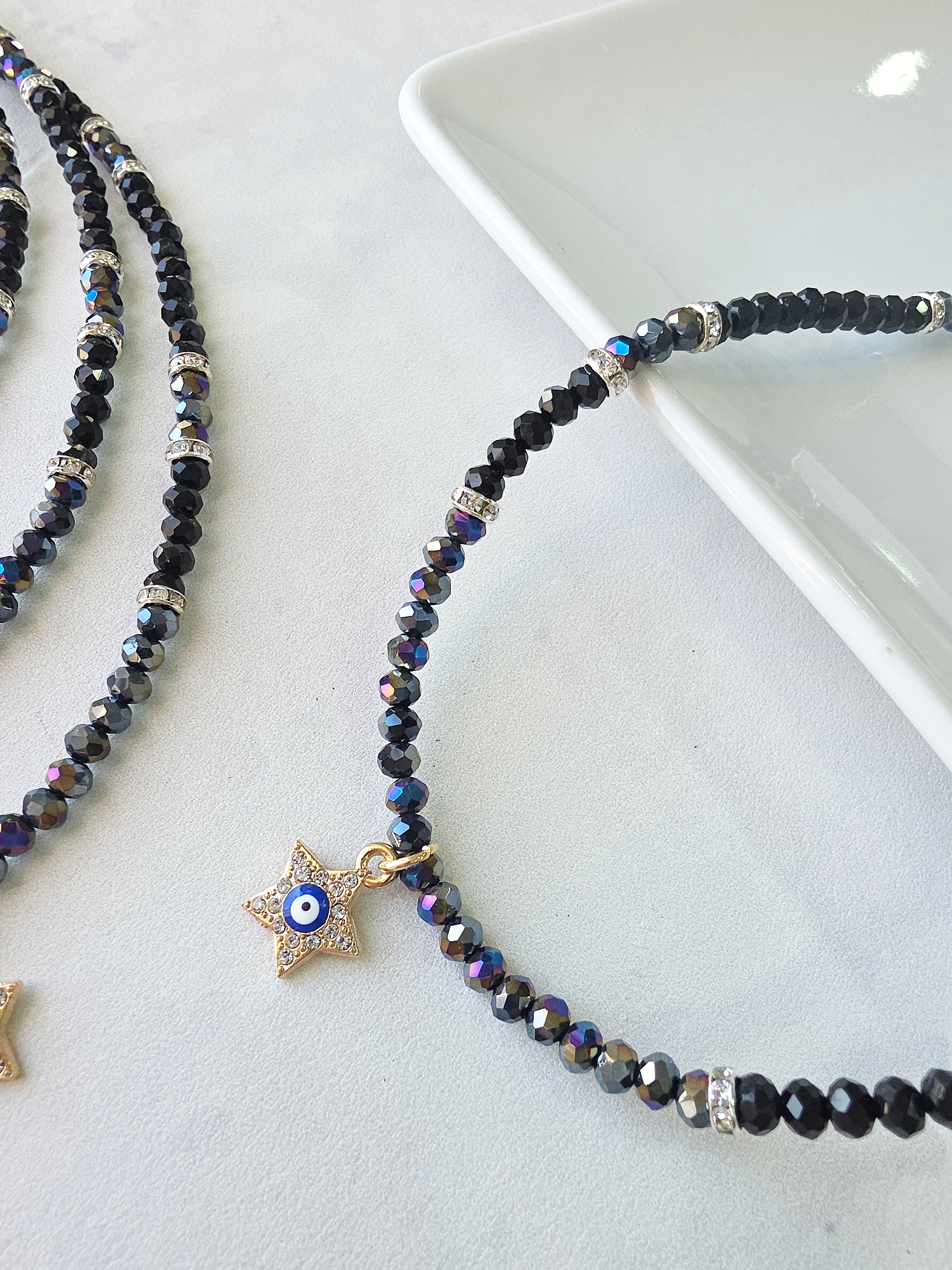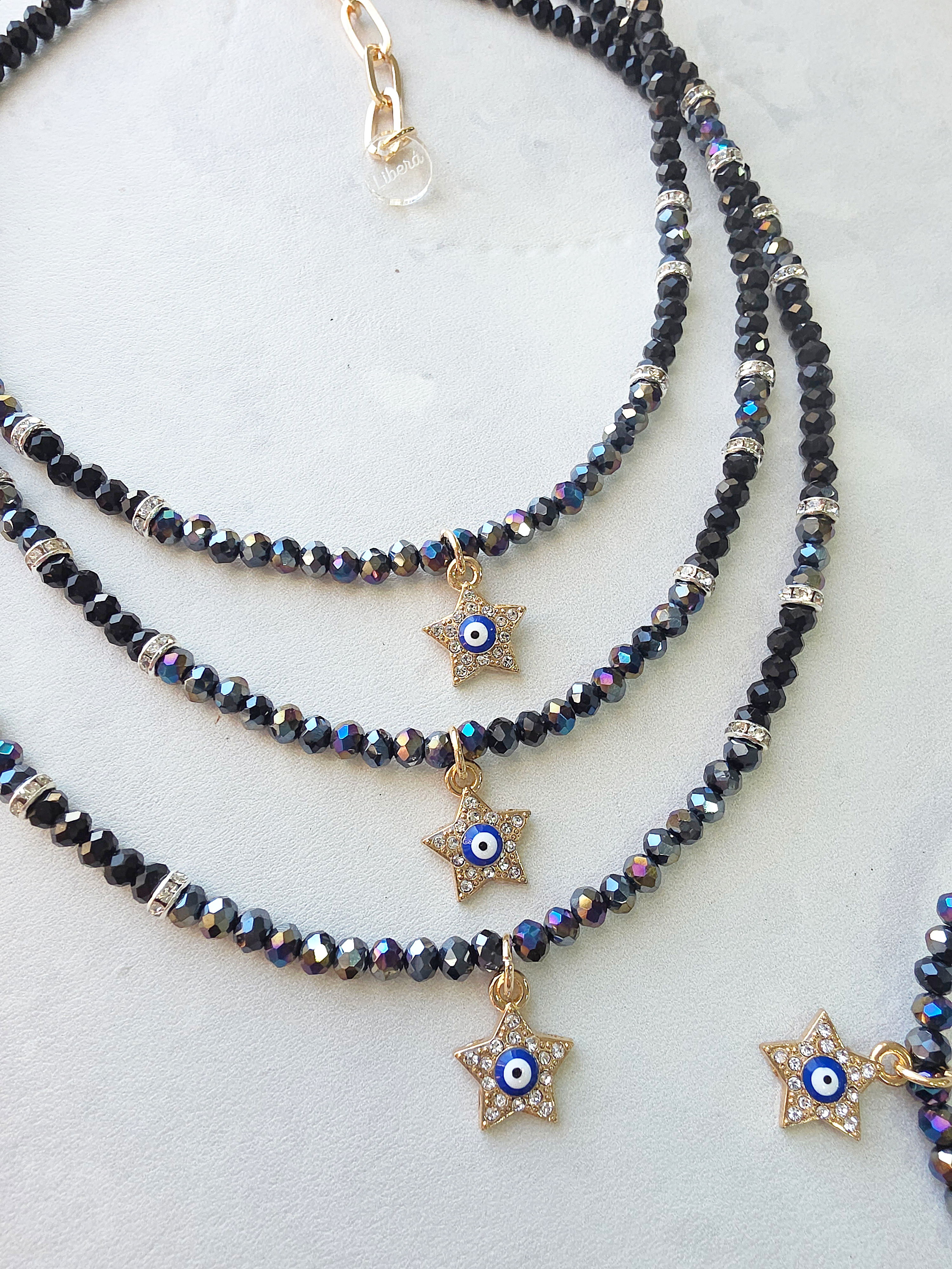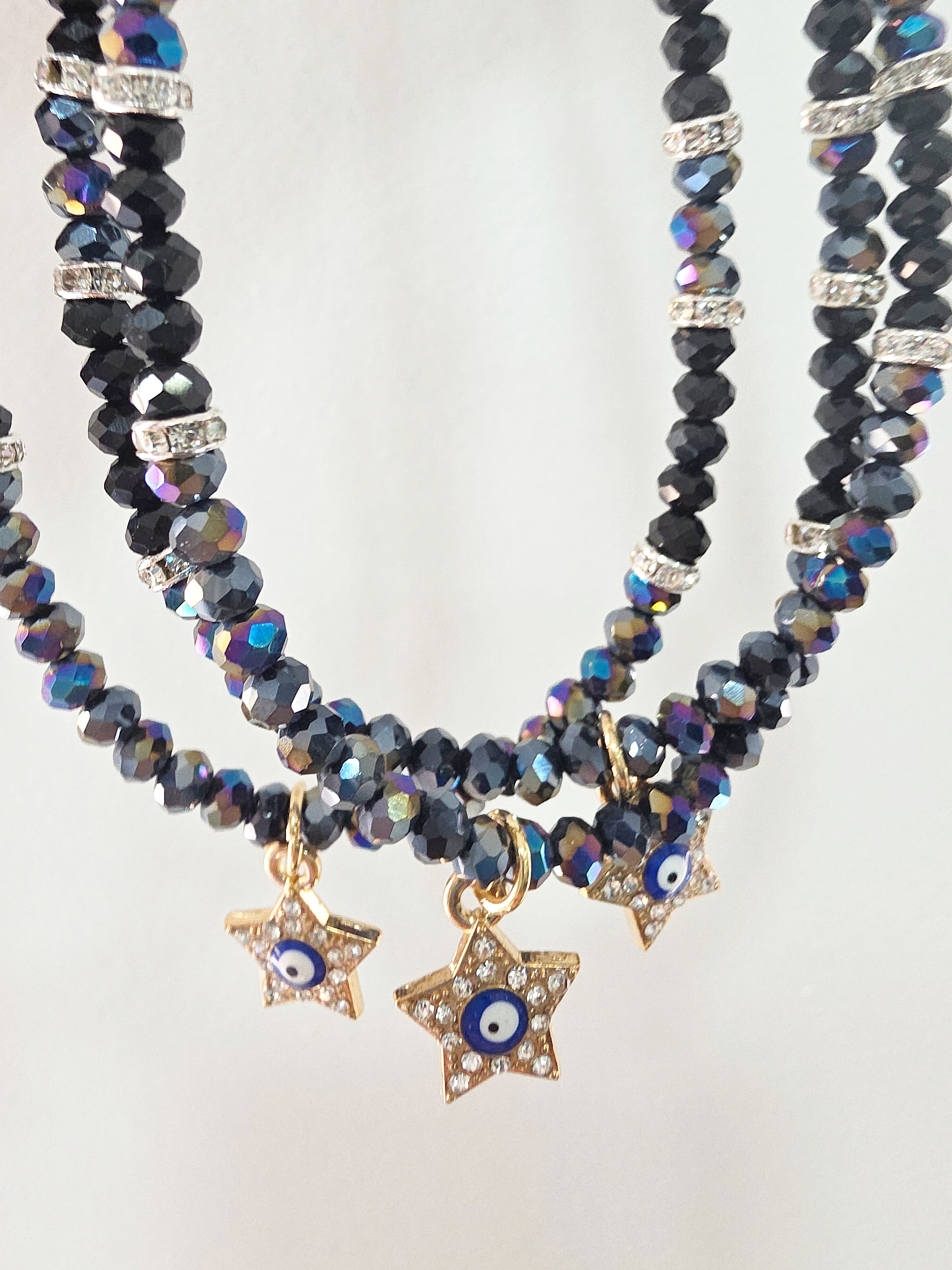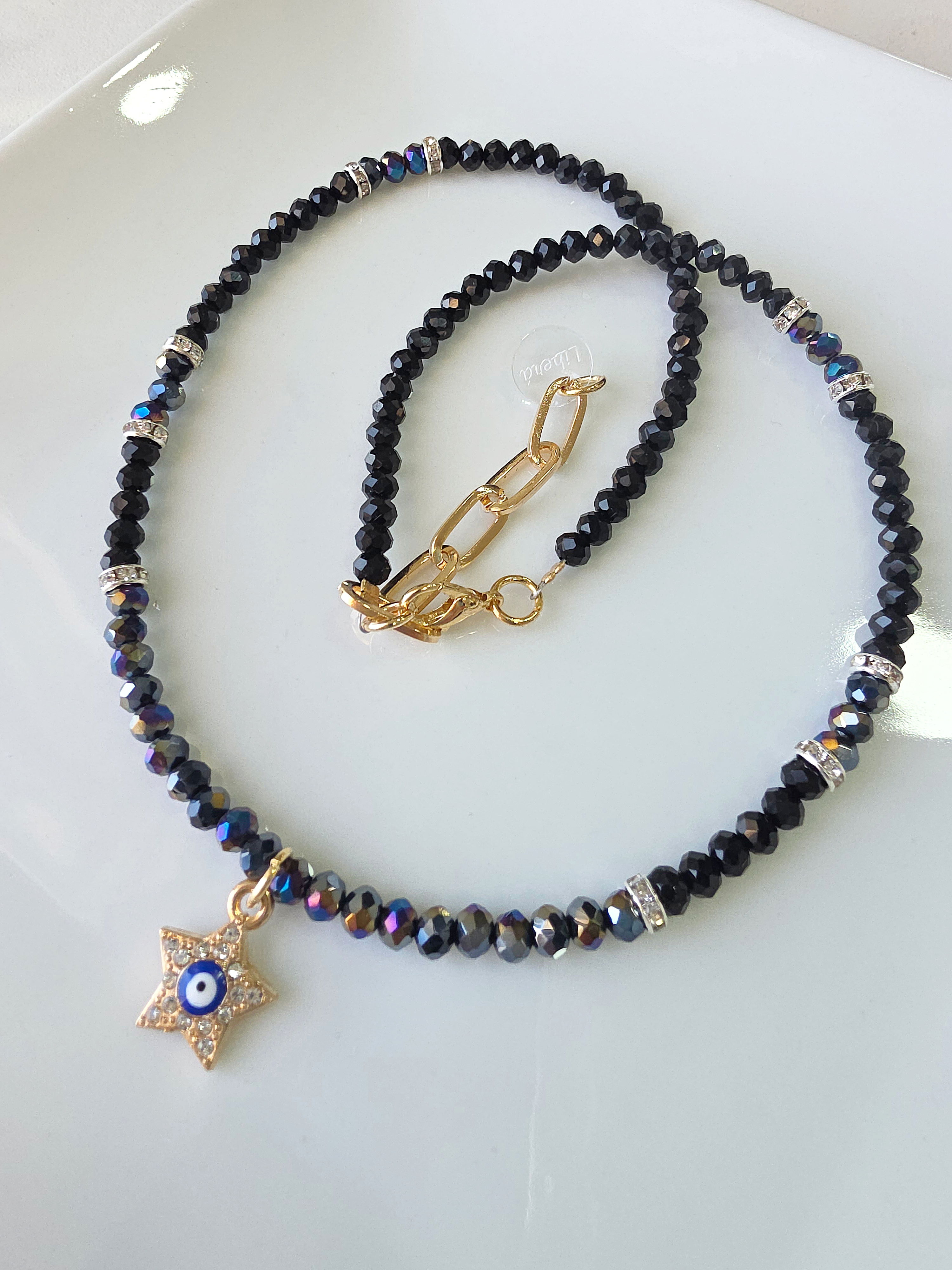 Collar de aproximadamente 40 cm (más cadena de alargue) compuesto por cristales, arandelitas con strass y dije con strass.