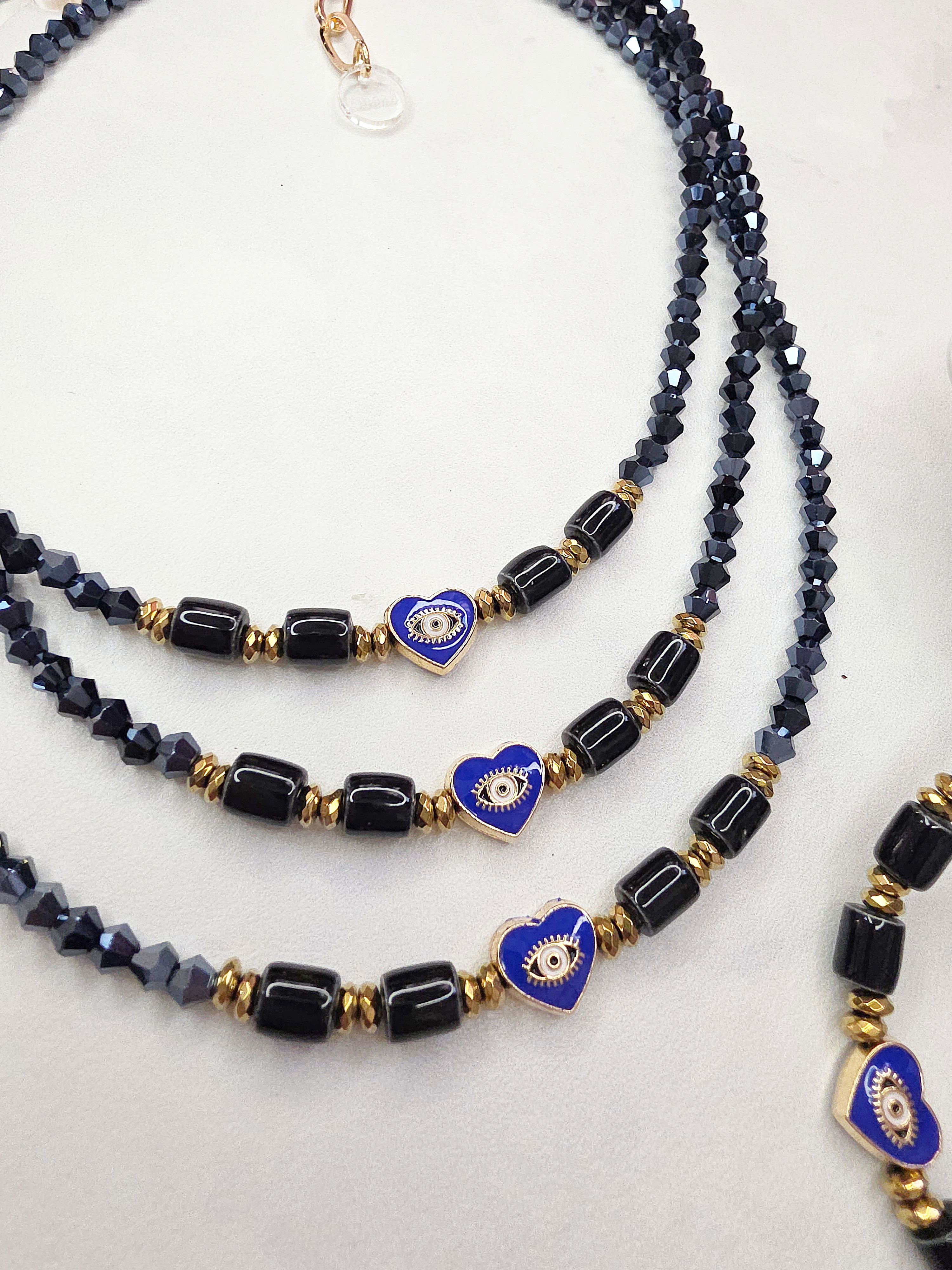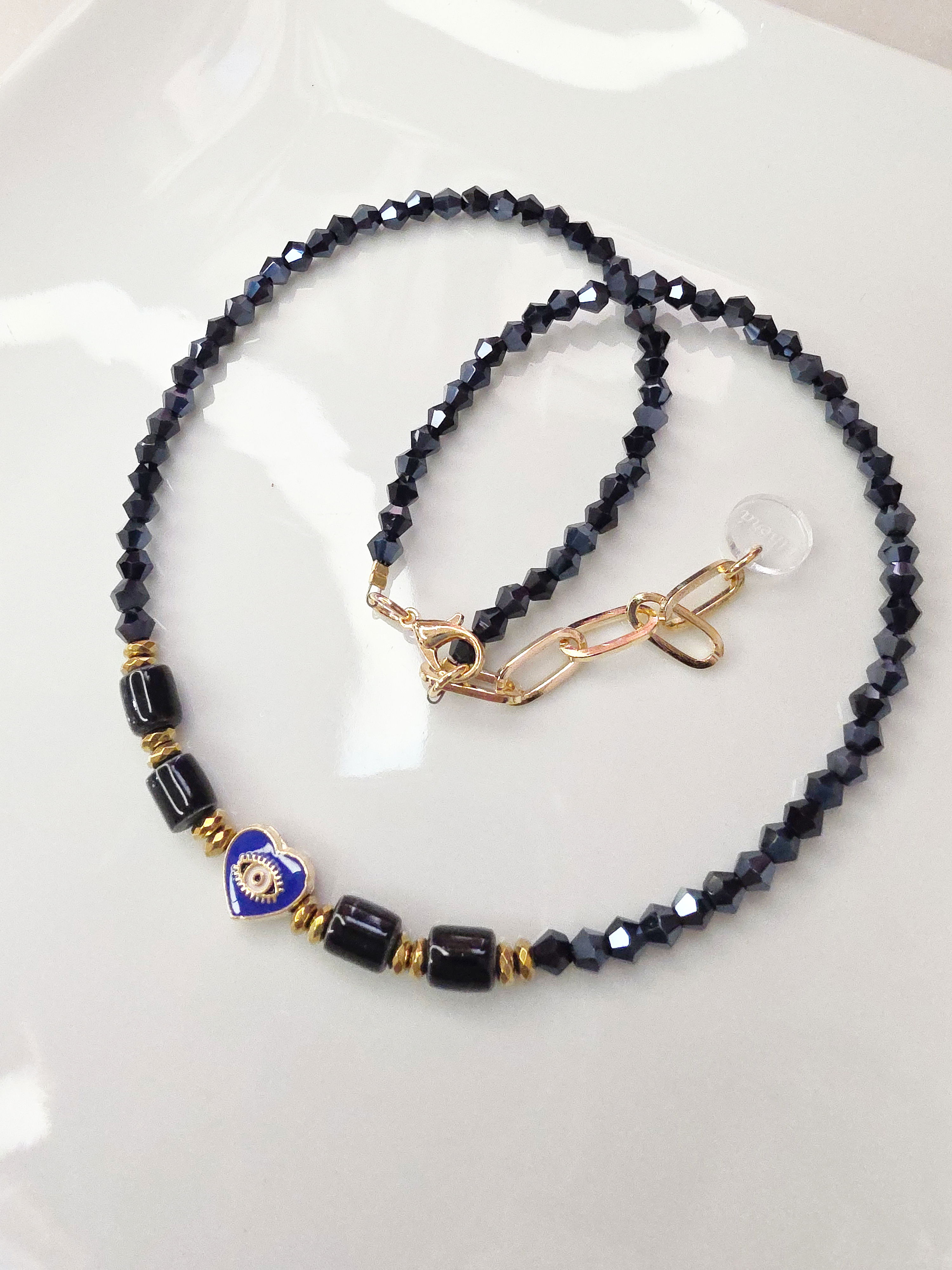 Collar de aproximadamente 40 cm (más cadena de alargue) compuesto por cristales, arandelitas facetadas de Hematite, tubos de cerámica y corazón esmaltado con ojito.