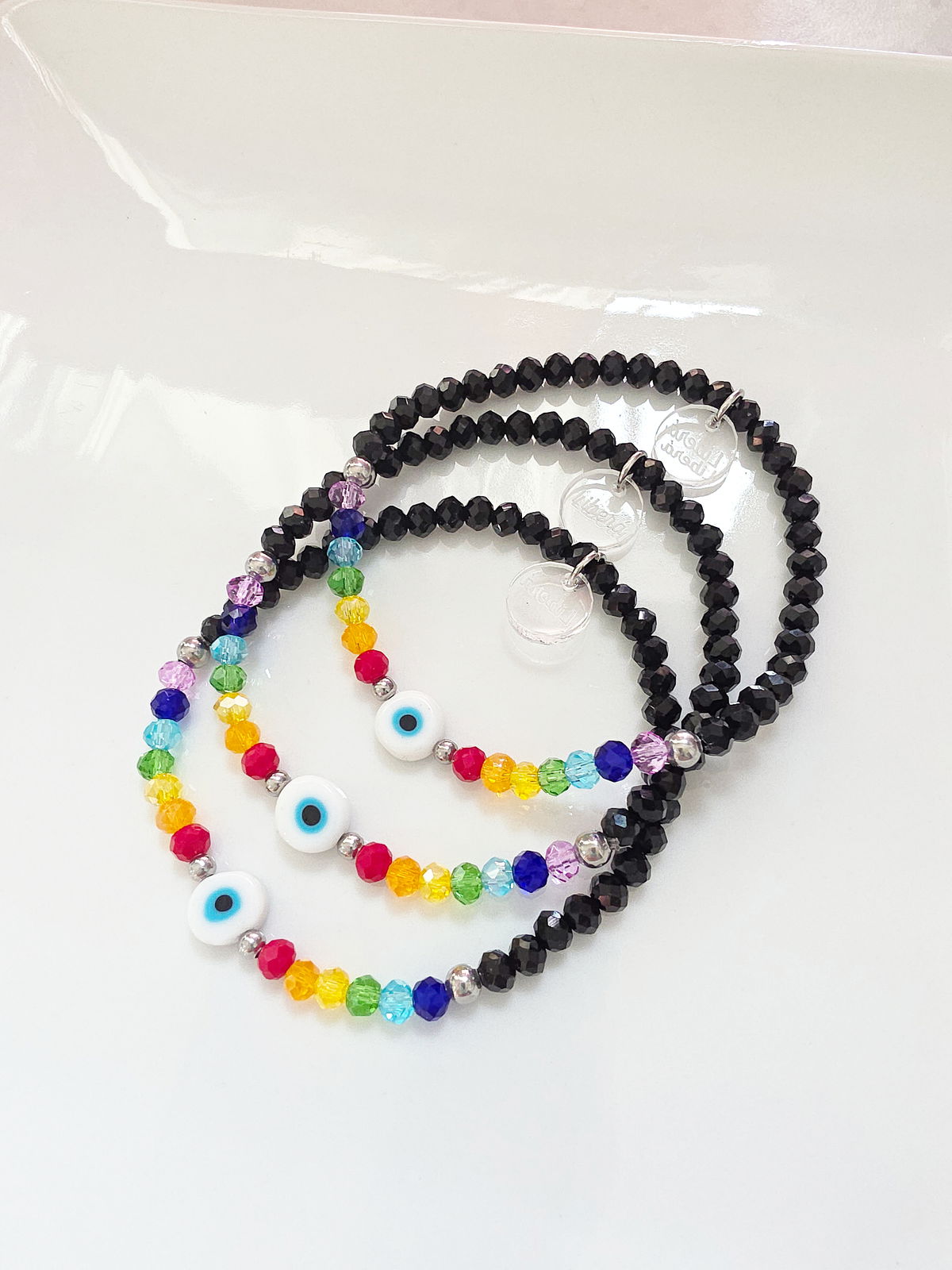 Pulsera elástica compuesta por donas de cristal, ojito de vidrio y detalles en acero quirúrgico 316l.