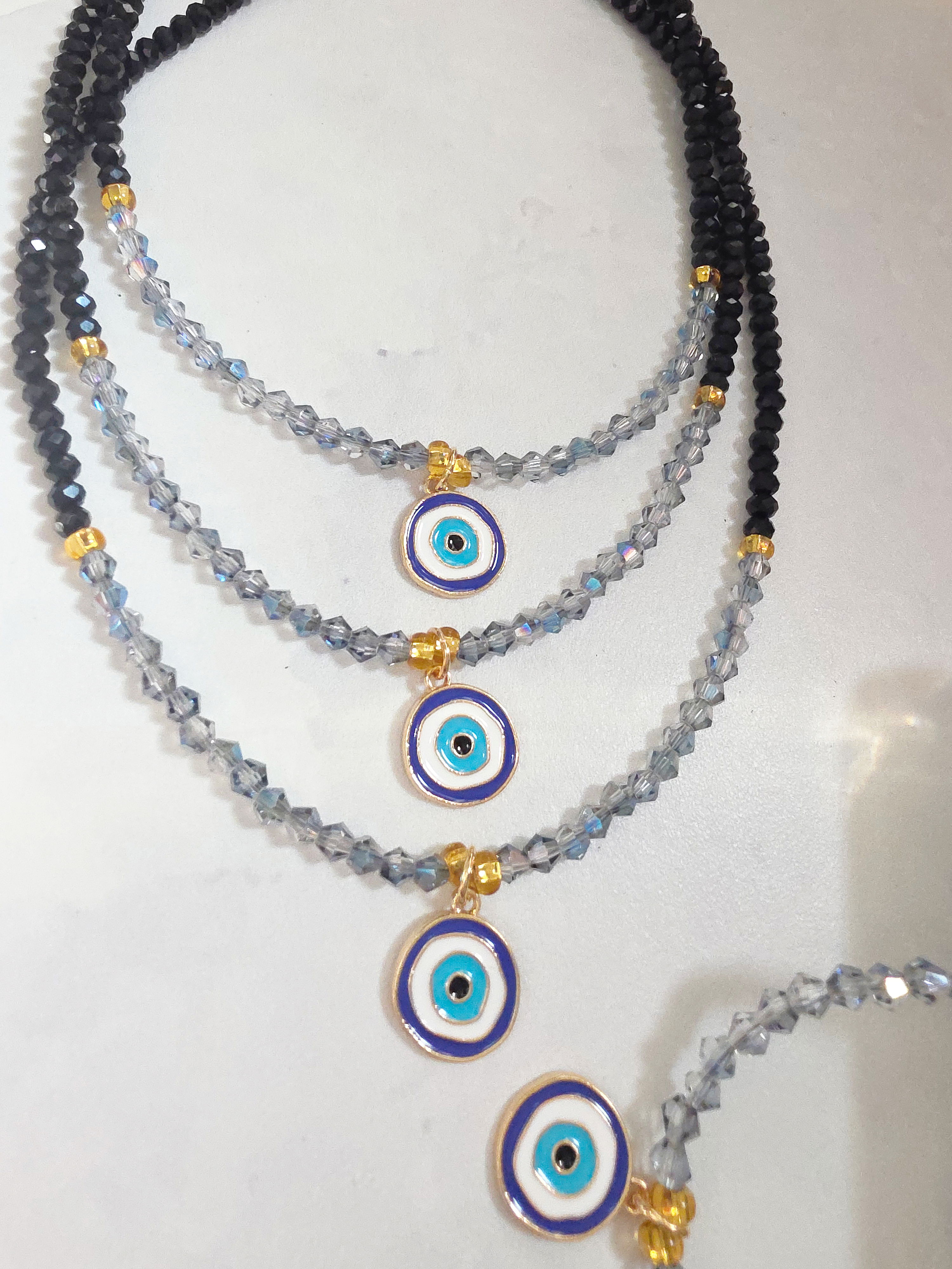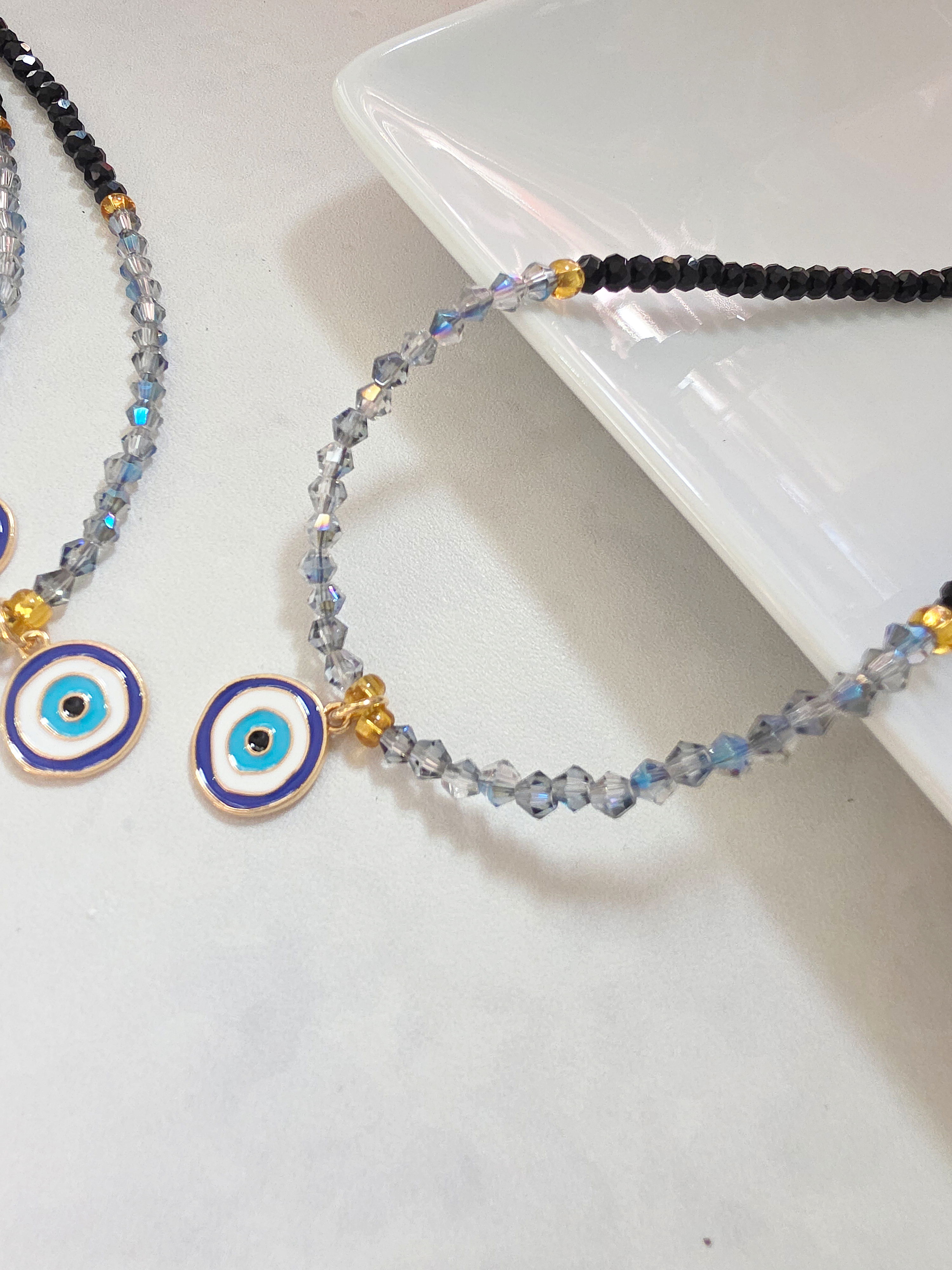 Collar de aproximadamente 40 cm (más cadena de alargue) compuesto por cristales cónicos, donitas, mostacillones de vidrio calibrados checos marca Preciosa y dije Esmaltado.