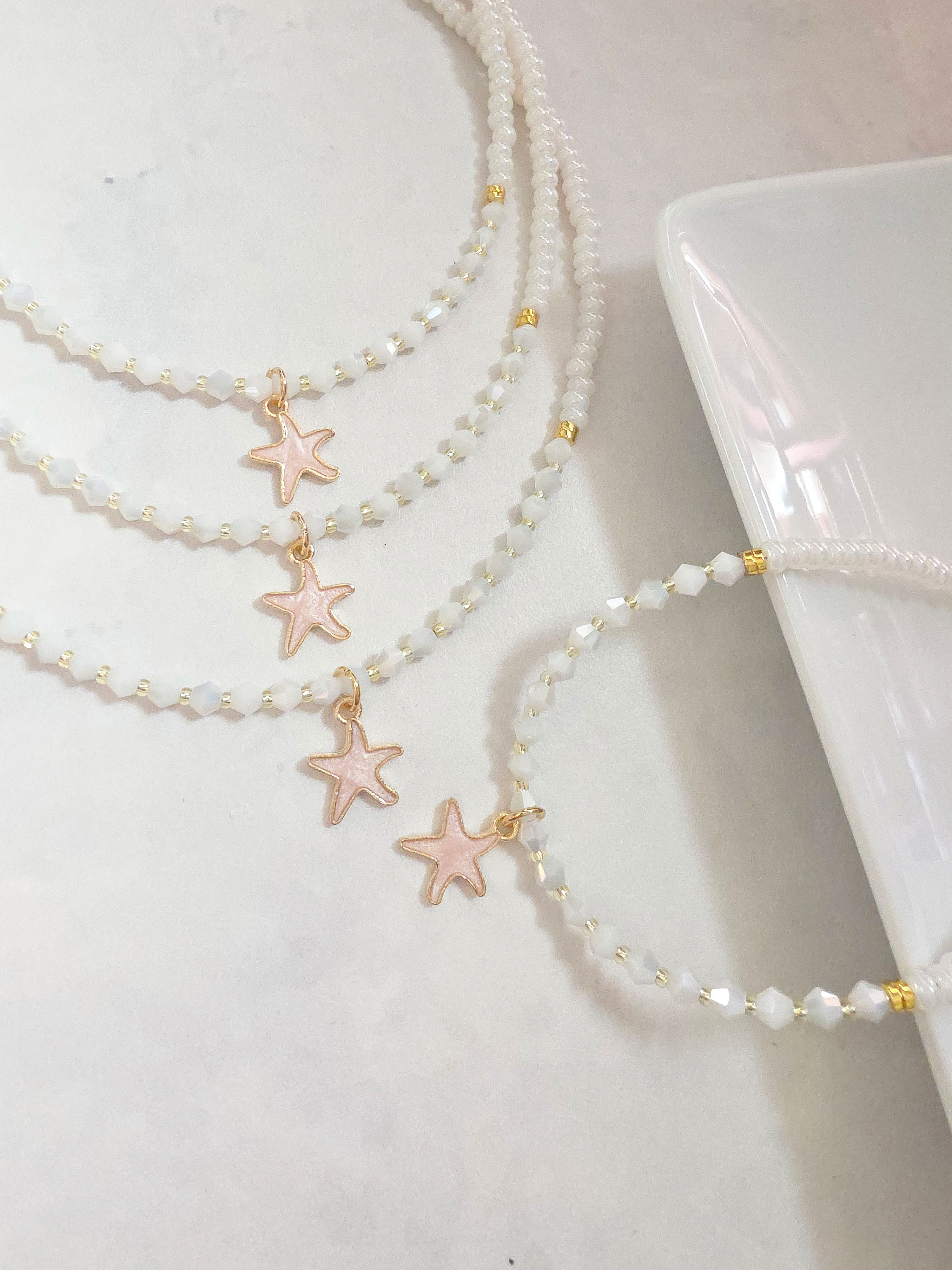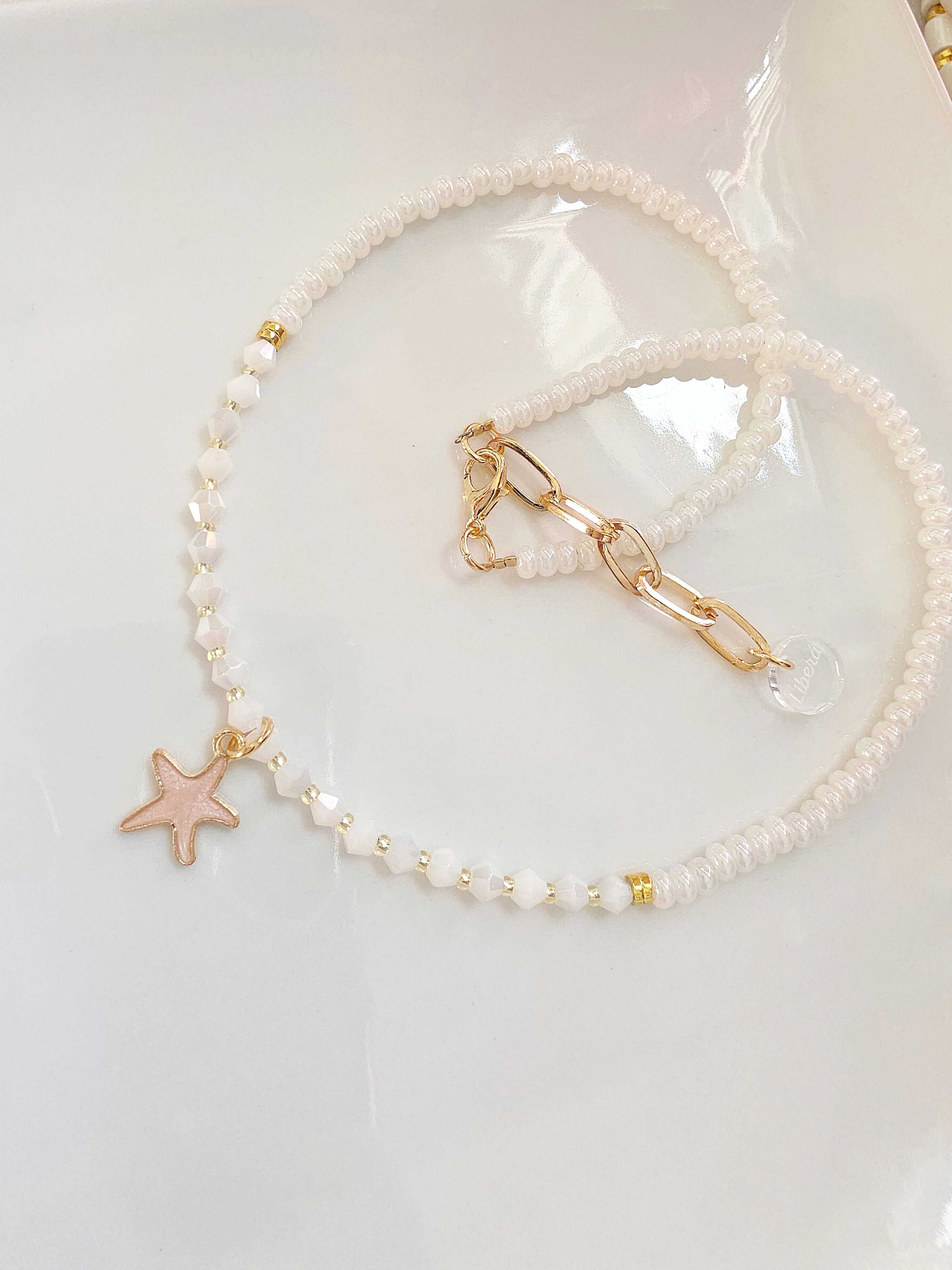 Collar de aproximadamente 40 cm (más cadena de alargue) compuesto por cristales cónicos, donitas, mostacillas y mostacillones de vidrio calibrados Checos marca Preciosa, separadores de Hematite con Baño y dije Esmaltado.