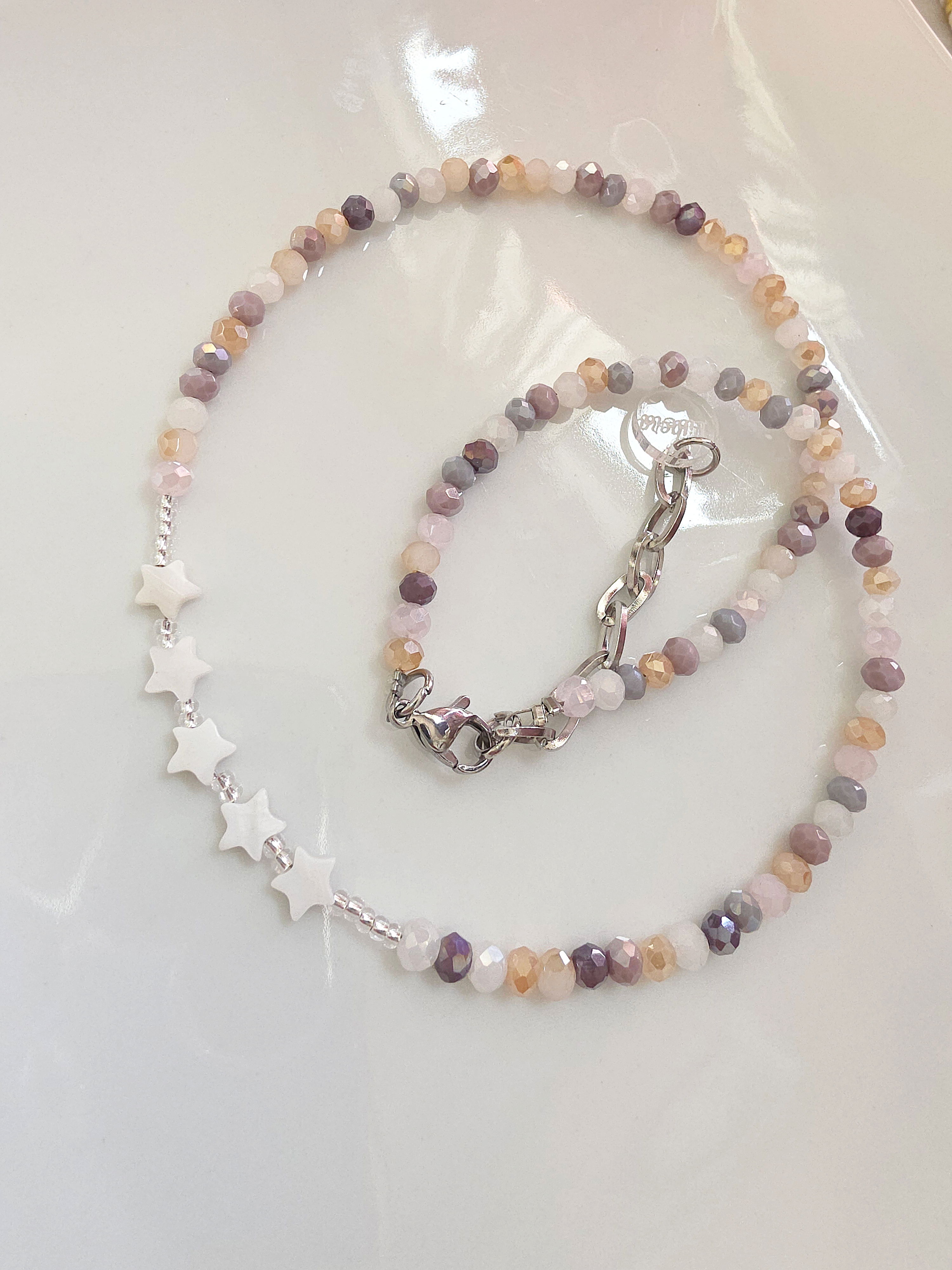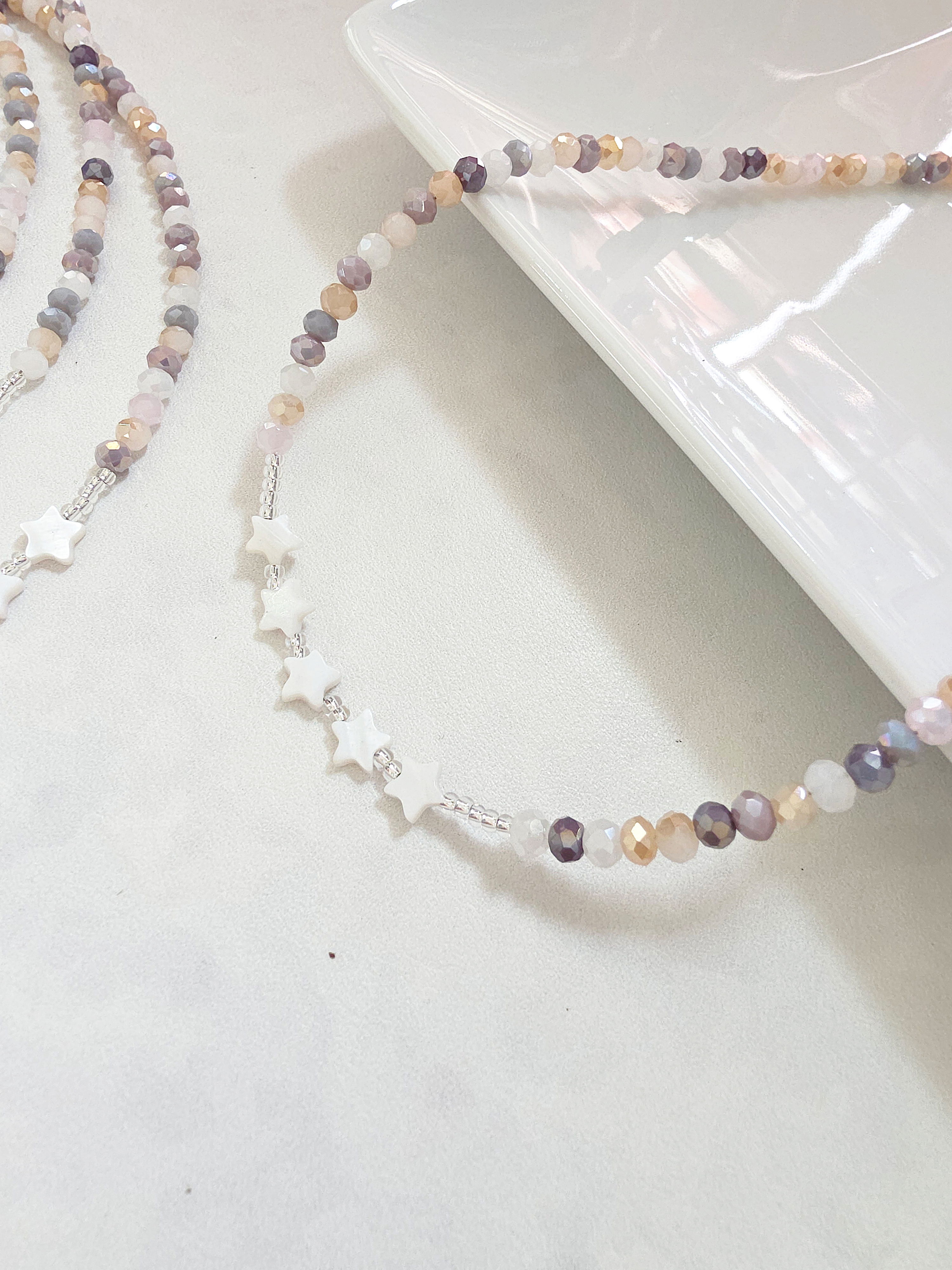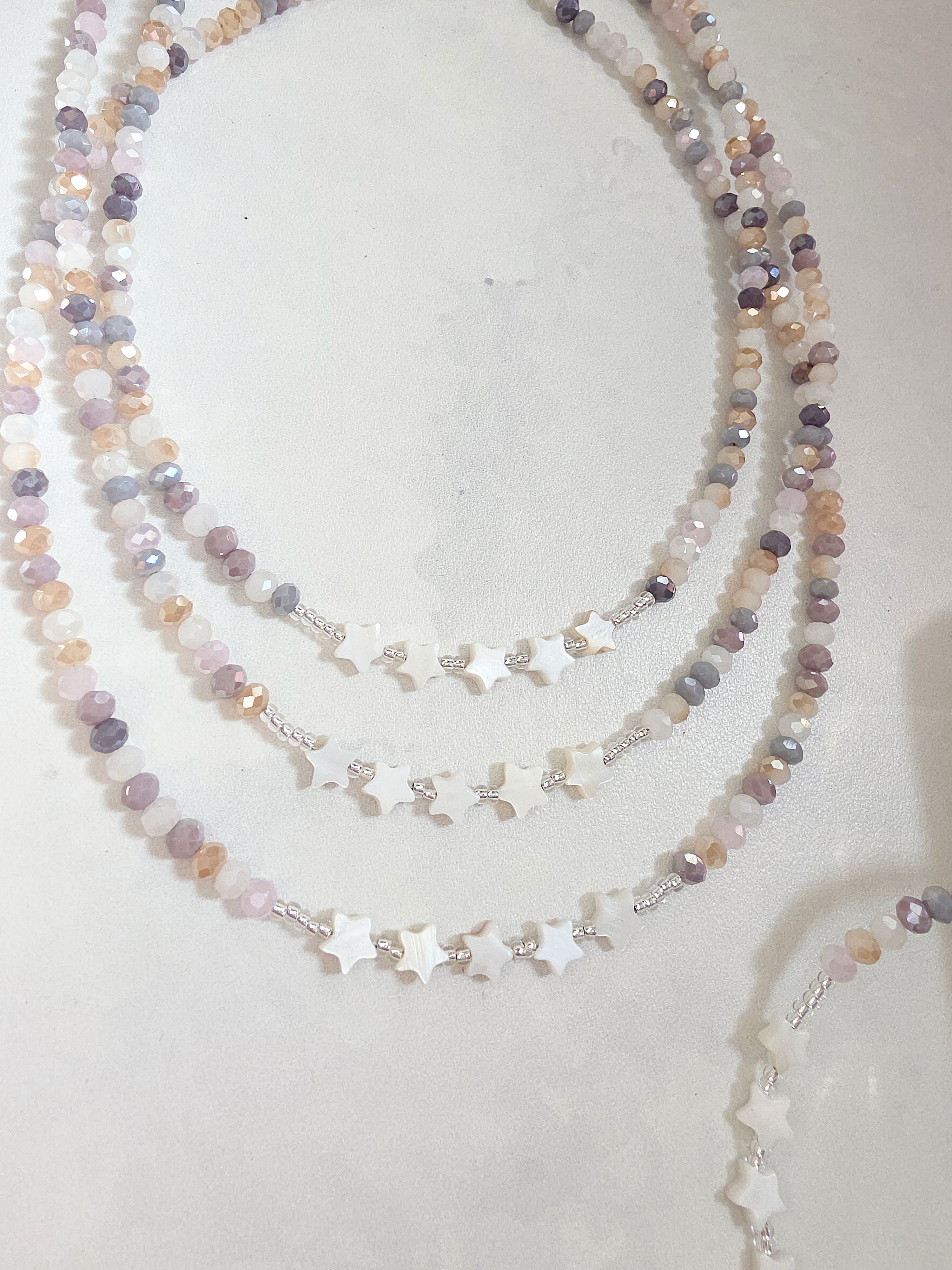 Collar de aproximadamente 40 cm (más cadena de alargue) compuesto por donitas de cristal multicolor, estrellas de Nácar Natural y mostacillas Checas calibradas marca Preciosa. Cierre, detalles y cadena de alargue de Acero Quirúrgico 316l.